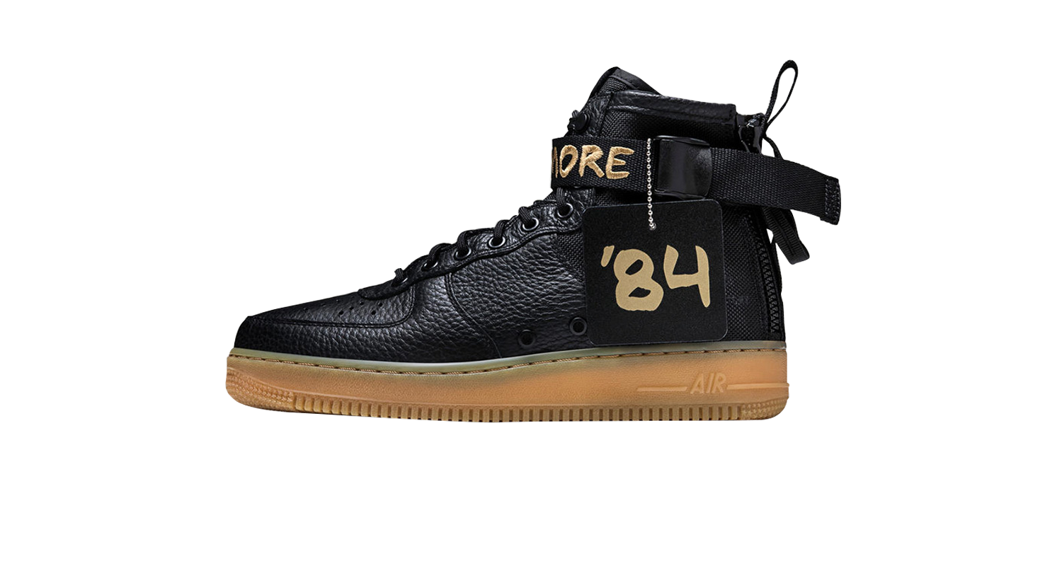 The shoe features a thumbled leather upper with a nylon compression strap on the ankle. The strap has a "Baltimore" lettering embroidery. There is also a tag attached to the strap with "84" on it. The meaning of this number is that in 1984 Nine was about to discontinue the AF1 until they knew how much they were popular in Baltimore. So Baltimore actually saved AF1 back then. The sneakers will also feature an exclusive packaging and will be available exclusively at DTLR in Modawmin Mall on Monument Street in Baltimore.