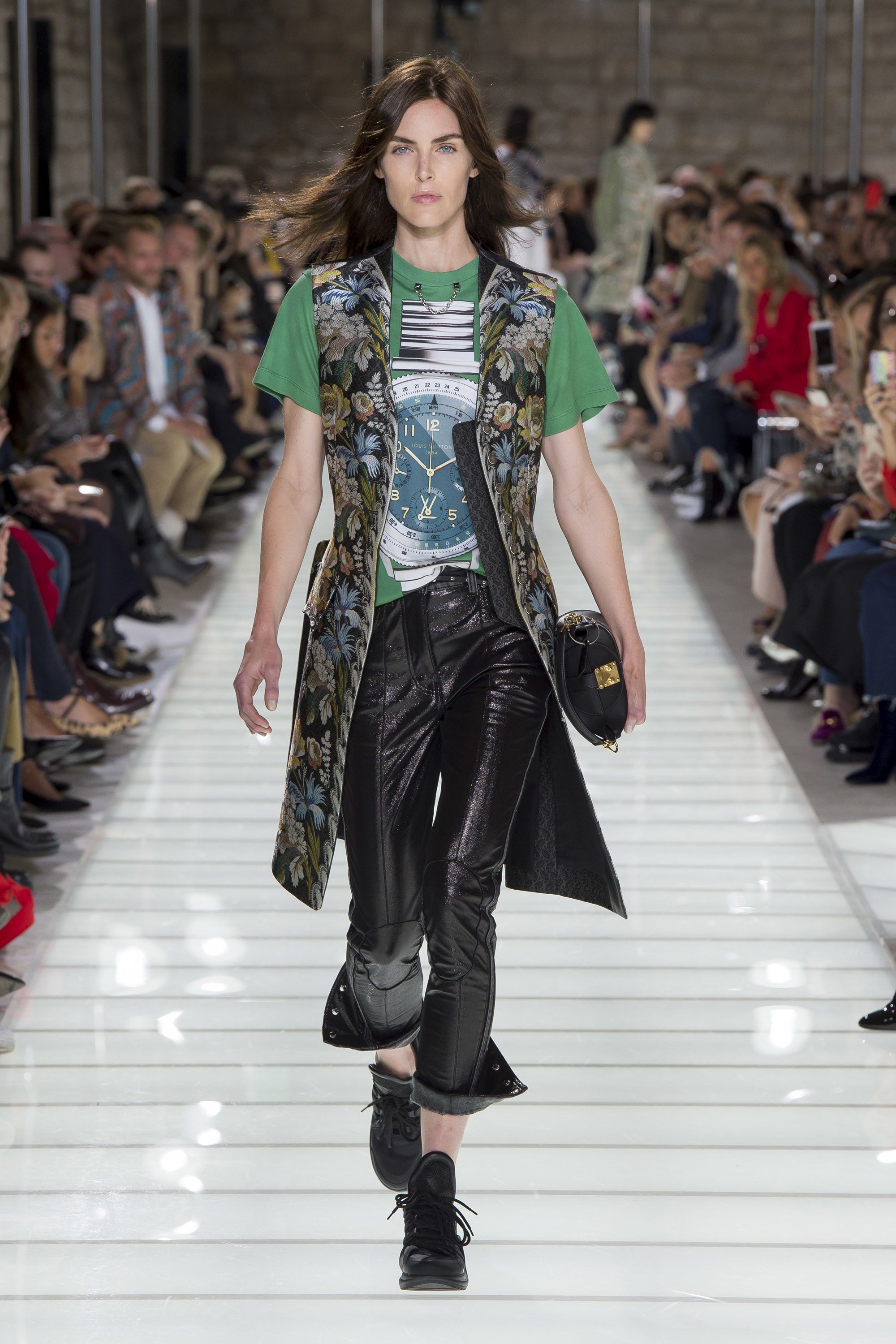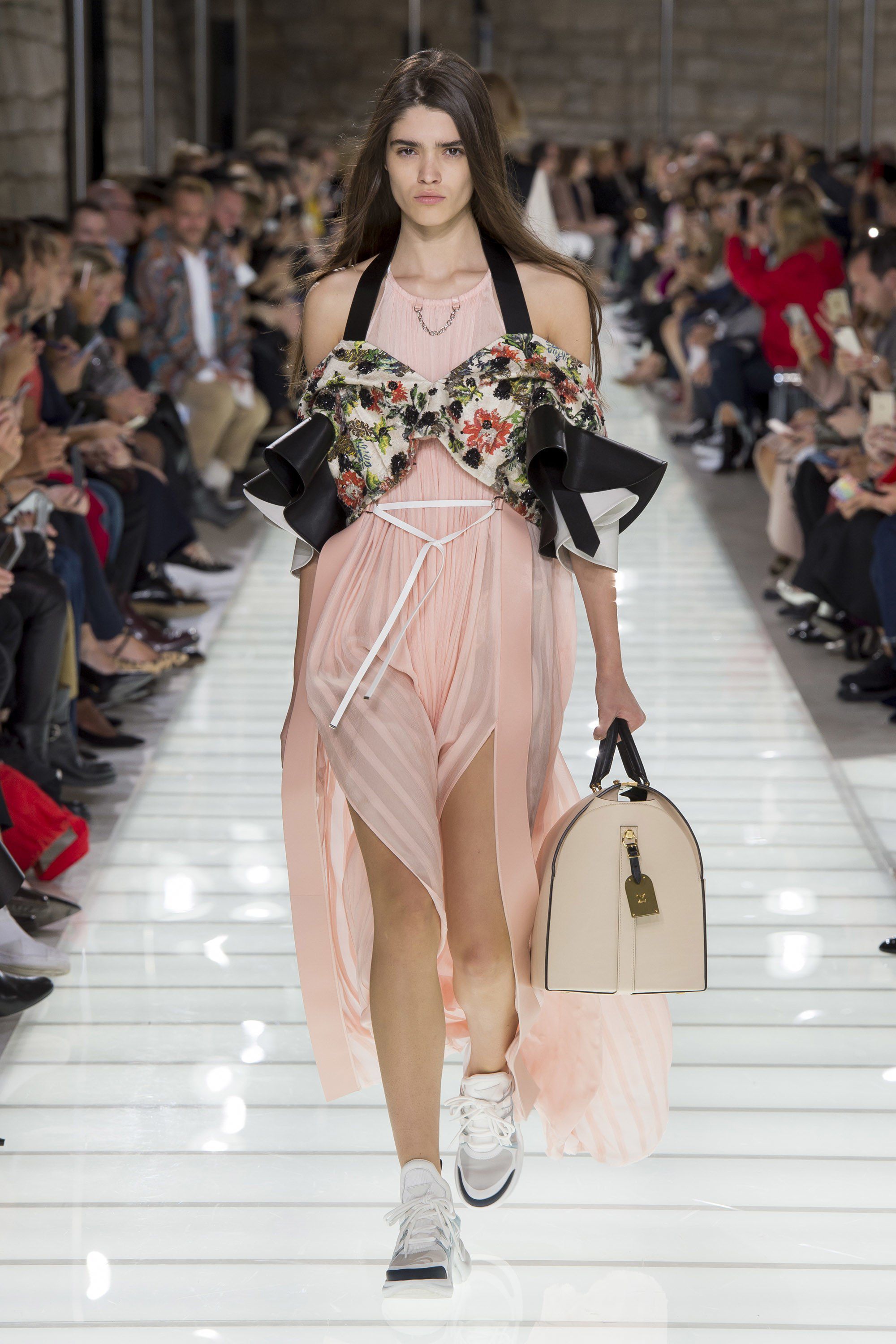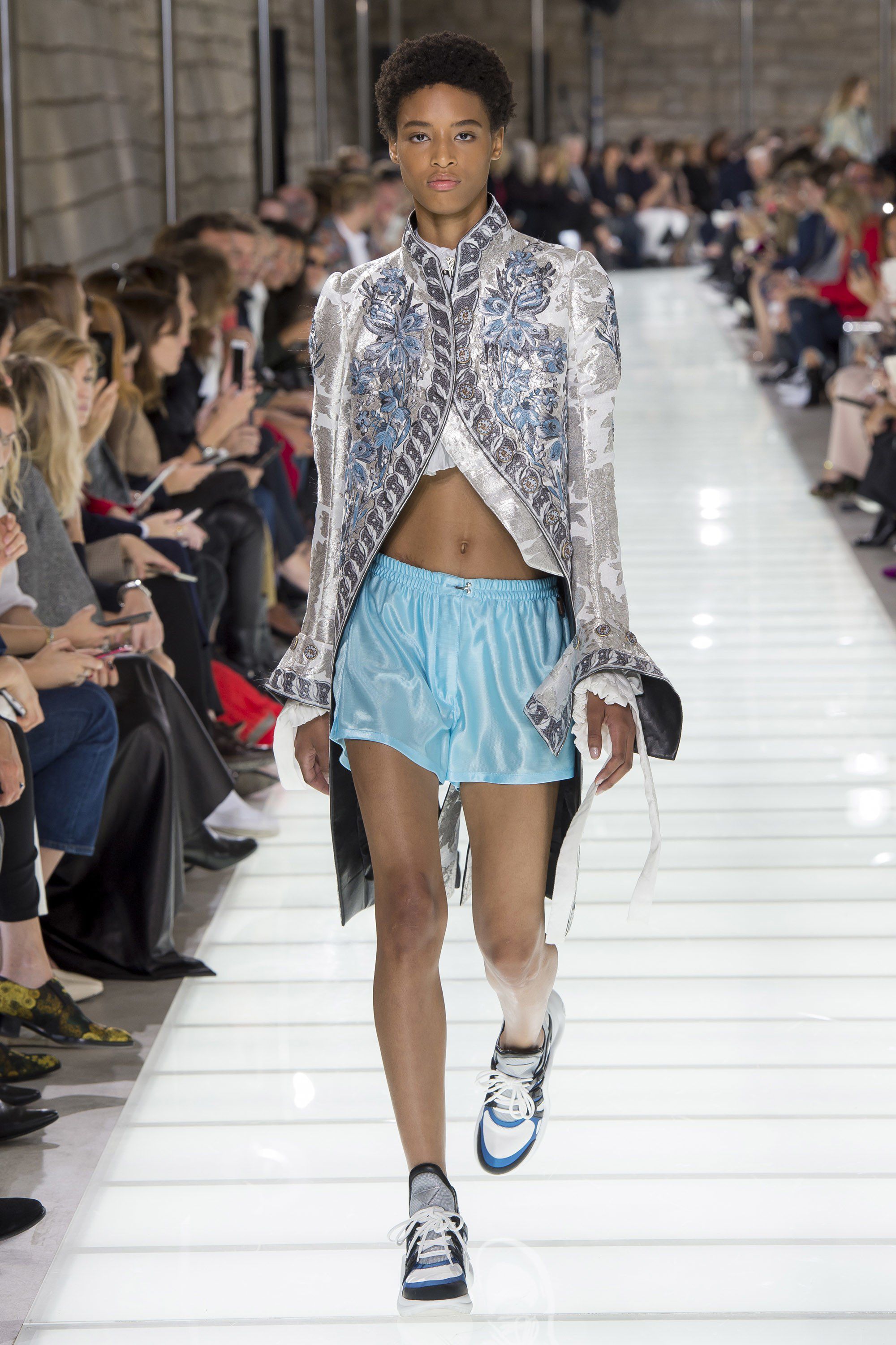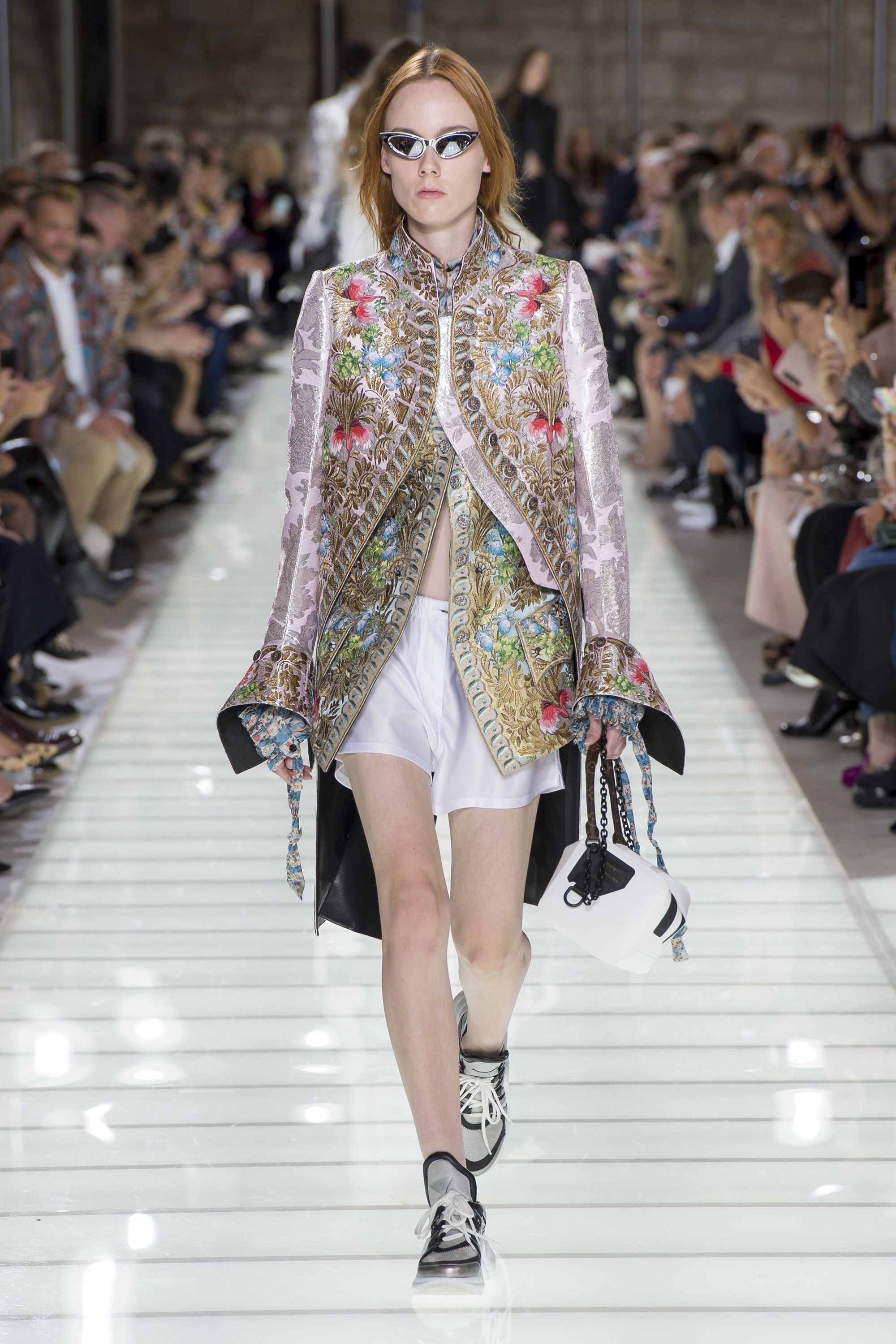 With the SS18 collection Louis Vuitton blends past and present, antique and modern, historic and sporty, dualism that animates every garment created by Ghesquière and is perfectly embodied by the first look rising on the catwalk: eighteenth-century redingote brocade with floral embroidery and silver inserts combined with silk shirts with puffy sleeves that leaves the naked belly, pastel-colored silk shorts and sneakers with a ‘90s spindly silhouettes.