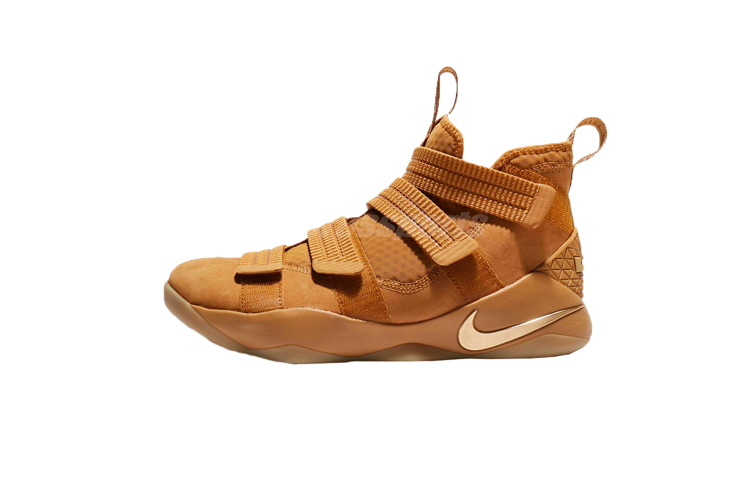 Nike and LeBron James bring the military sneakers trend on the court. These quadruple-laced kicks embrace the combat boots look. The shoes present a full Wheat colored upper with golden midsole. The LeBron logo has been placed on the pull tabs. The sneakers will be available online and in selected Nike retailers