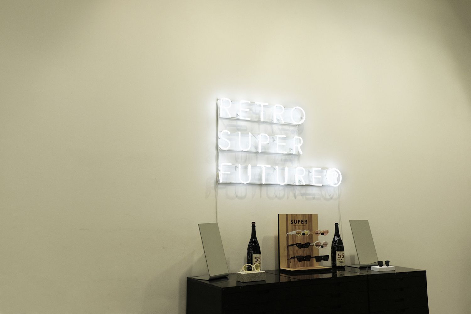 I wanted a name that was international, short and recognizable ... and. moreover, I thought our glasses were super. I then added "RETROSUPERFUTURE" because I needed a more distinctive version representing the company. While I was making my first collection, I happened to browse an old PIG number in which I found this photo service, called RETROSUPERFUTURE, where one of the models wore colored Wayfarers and I really felt like it was fate.