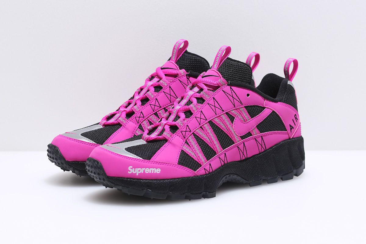 The fulcrum of the capsule Supreme x Nike is without a doubt the Nike Air Humara, designed in 1998 by legendary Peter Fogg. Presented in four different pop colors - green, pink, light blue and black - and it's characterized by reflexive details. The Air Humaras feature a reflective perforated body with mesh overlay, reflective printed graphics on toes, heels, and webbing lace supports.