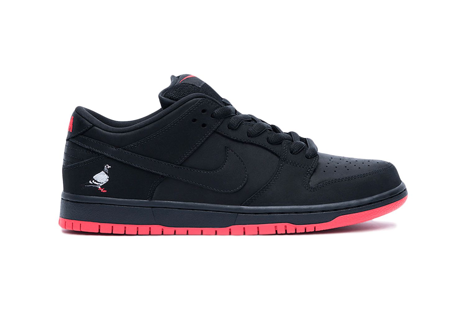 Straight from 2005 the Nike SB Low Pigeon is here. After the exclusive NYC release, the iconic sneakers will drop on November 11th at selected Nike retailers and online. The retail price is $110. The total black is, as is tradition, combined with the sienna outsole and the unfailing Pigeon logo across the heel.