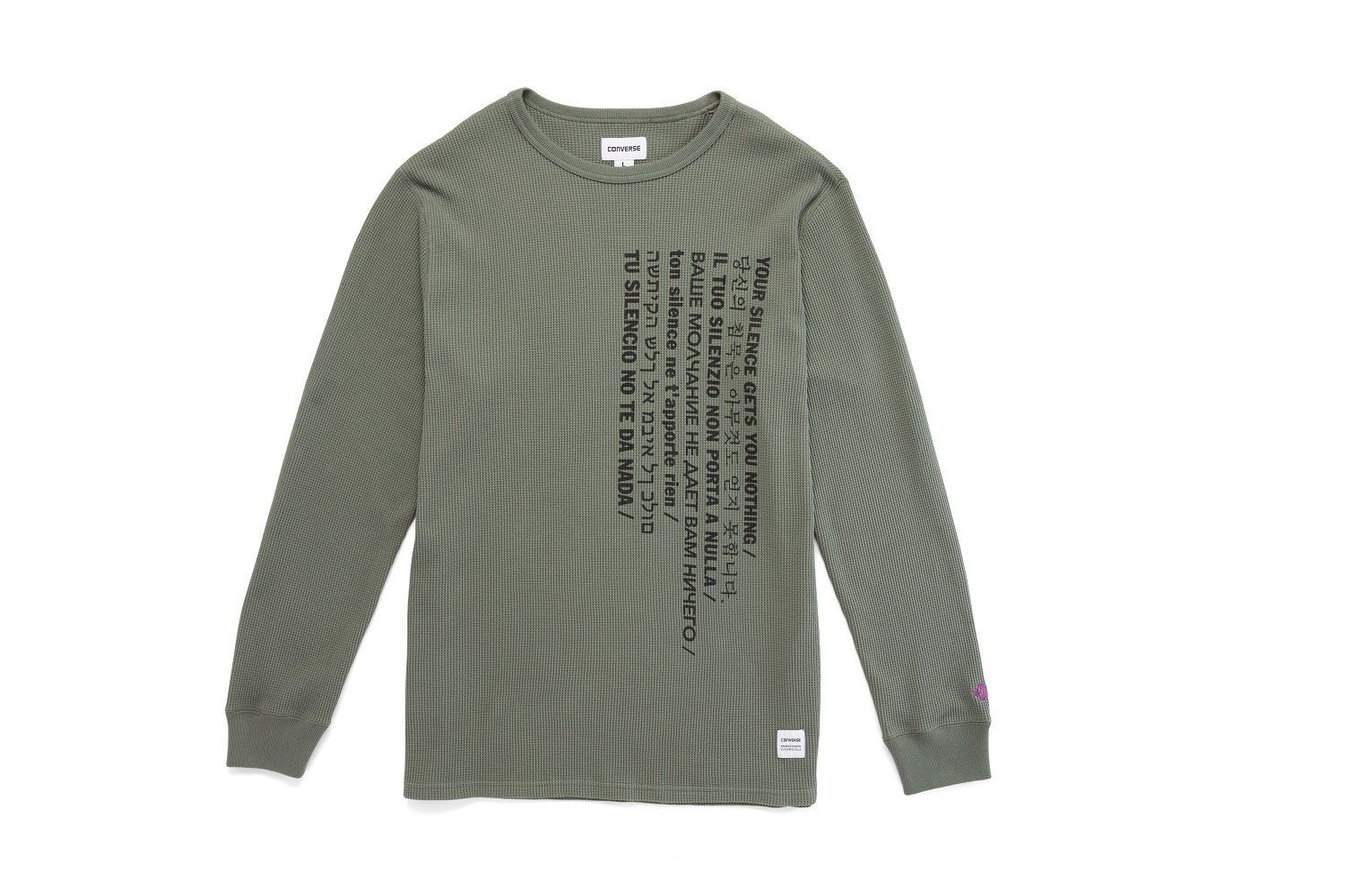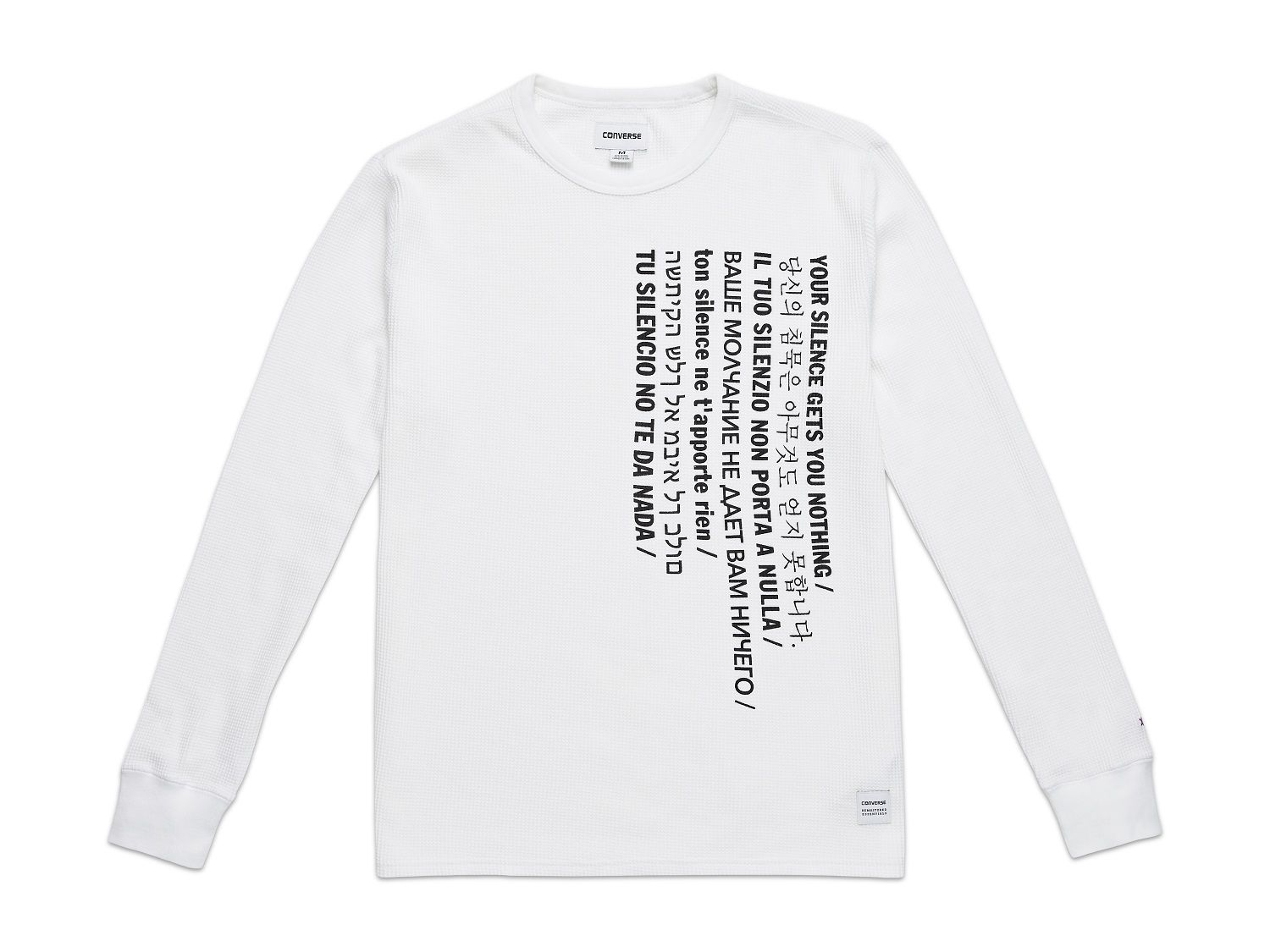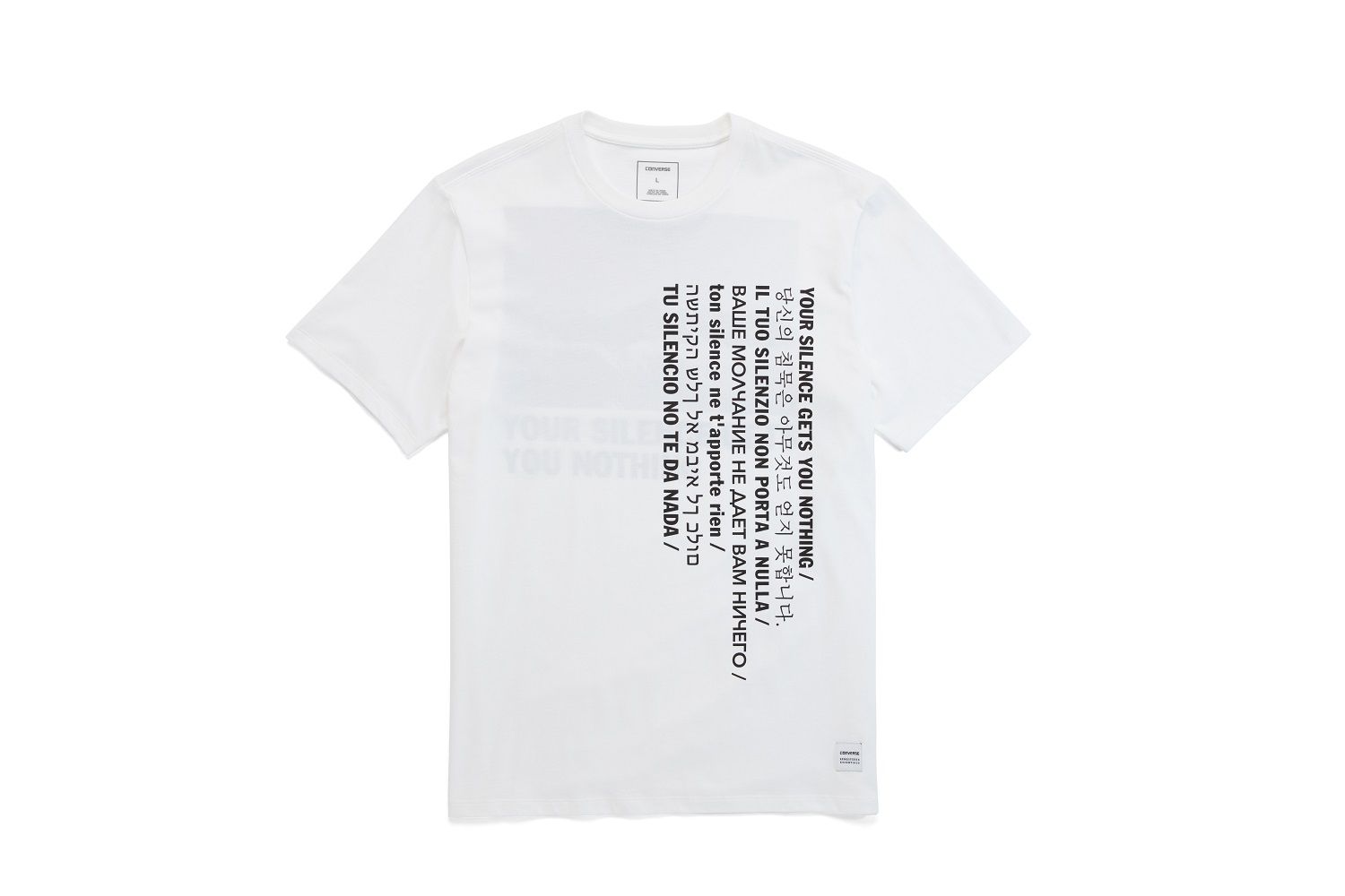 It's just from the Converse Urban Utility Collection that Your Silence Gets You Nothing borns: a cross-season capsule collection of seventeen items where the importance of freedom of expression meets fashion utilitarianism through the famous punk writings of Cali DeWitt, translated in English, Farsi, Italian, Korean, French, Russian and Hebrew, matched and almost in contrast to the aesthetics of the Urban Utility collection. The main purpose is to enhance the different levels of layering starting from classic Converse Essential jersey tees, thermic t-shirts, and hoodies, to the Men's GORE-TEX Utility Jacket - characterized by its three-layer waterproof nylon GORE-TEX breathable seam seams that provide protection to wearers. Key element is the iconic Converse Chuck '70.