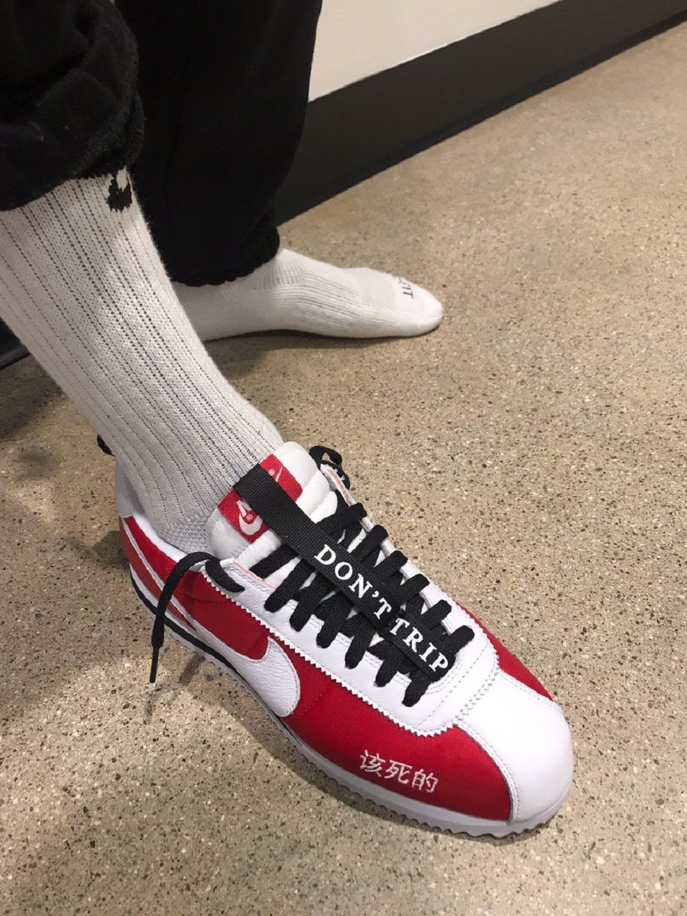 The shoes have a red and white upper with a big Swoosh on the side, written in Chinese embroidered on the front of the foot and the phrase “Don't Trip” in white on a black background placed on the lace holder.