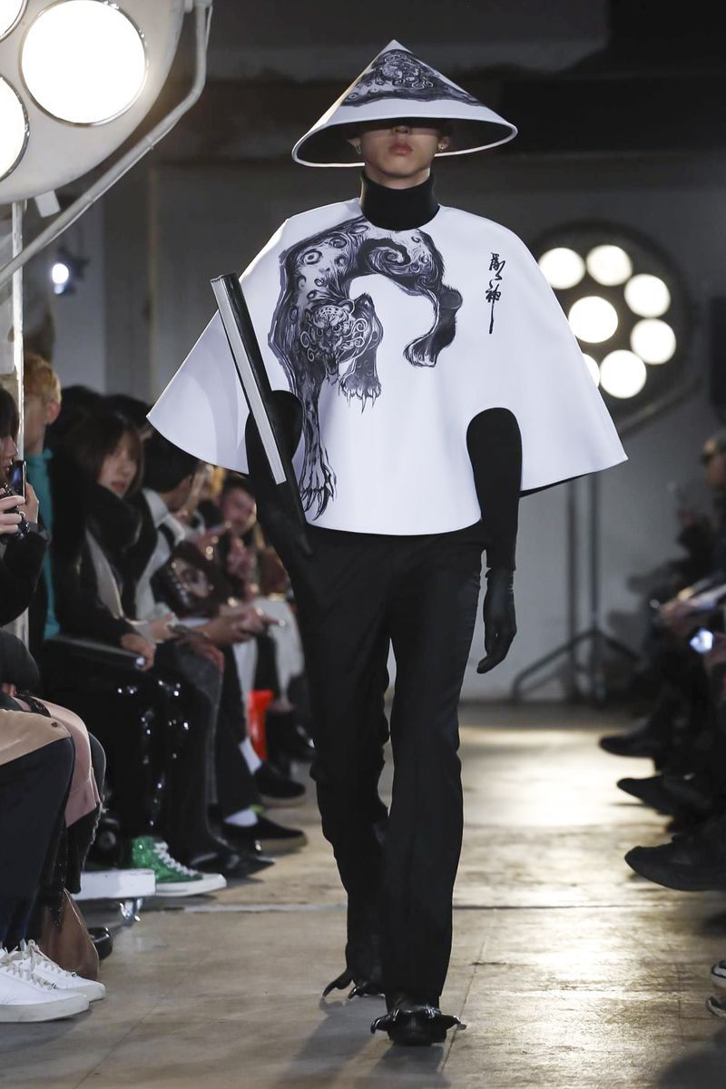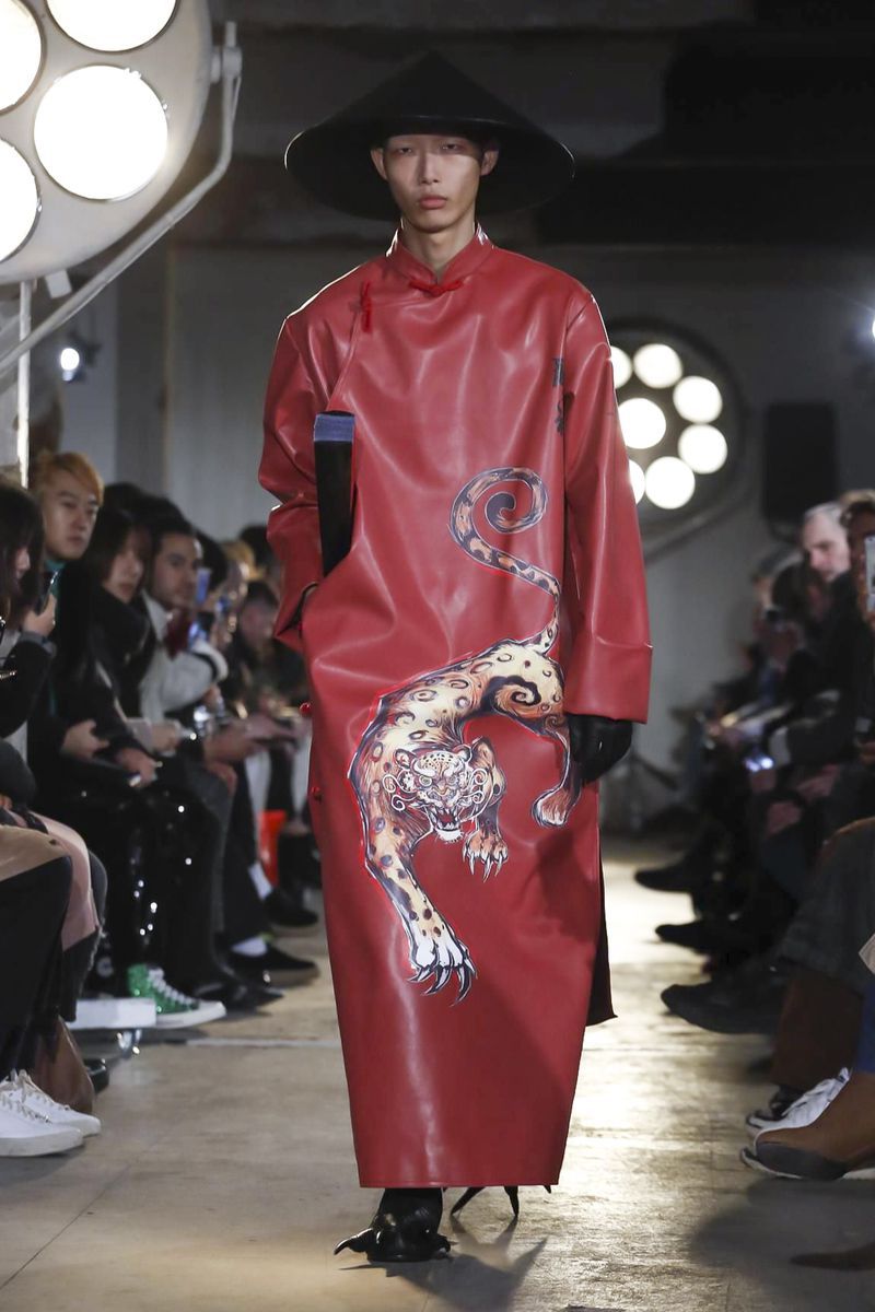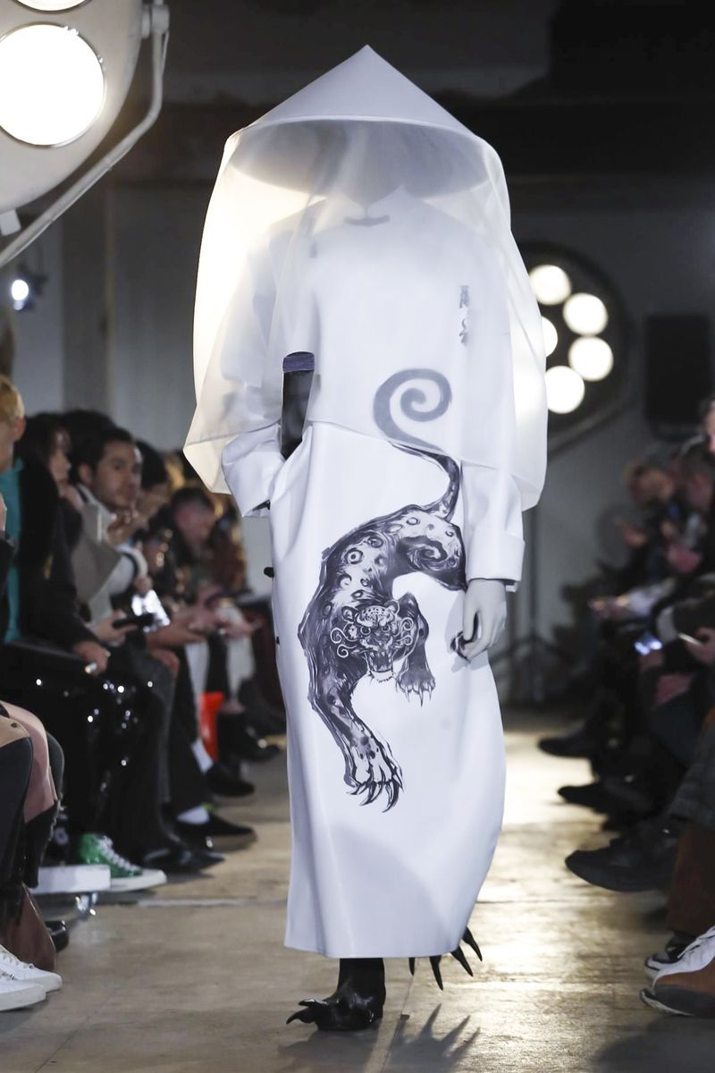 Everything is made even more interesting by the inevitable oriental touch, typical of the collections signed Xander Zhou. For this reason, after the first few minutes spent in the future, we move on to retrace the steps of Chinese history: tradition and religion are honored with long leather tunics decorated with tigers, large kasa (cone-shaped headpieces, symbols of Chinese culture) that cover with their long veils the models' face, capes, jackets that recreate the symbol of Yin and Yang and white and red writings that completely cover the clothes.