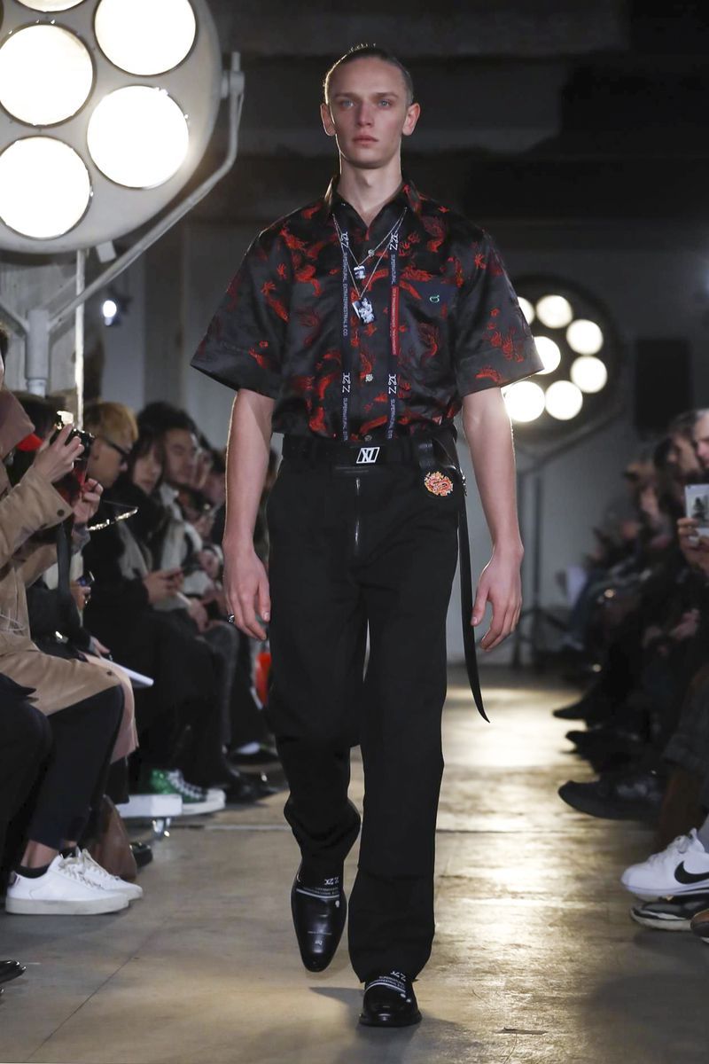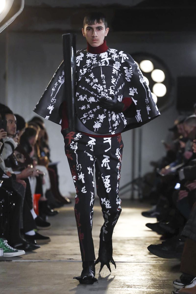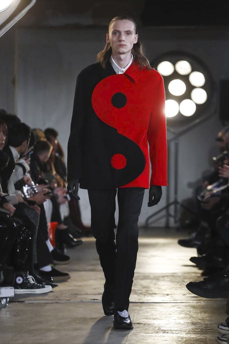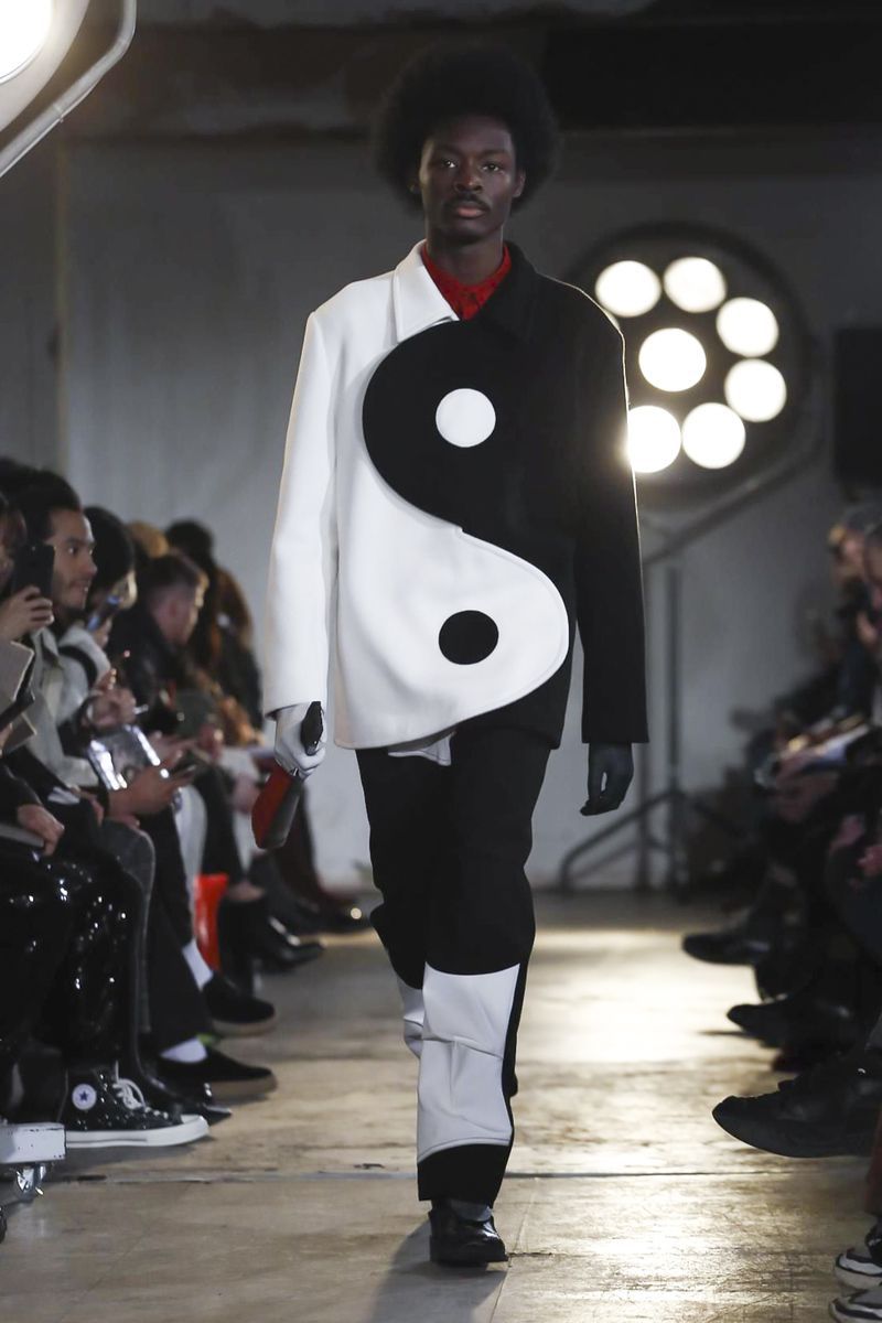 Everything is made even more interesting by the inevitable oriental touch, typical of the collections signed Xander Zhou. For this reason, after the first few minutes spent in the future, we move on to retrace the steps of Chinese history: tradition and religion are honored with long leather tunics decorated with tigers, large kasa (cone-shaped headpieces, symbols of Chinese culture) that cover with their long veils the models' face, capes, jackets that recreate the symbol of Yin and Yang and white and red writings that completely cover the clothes.