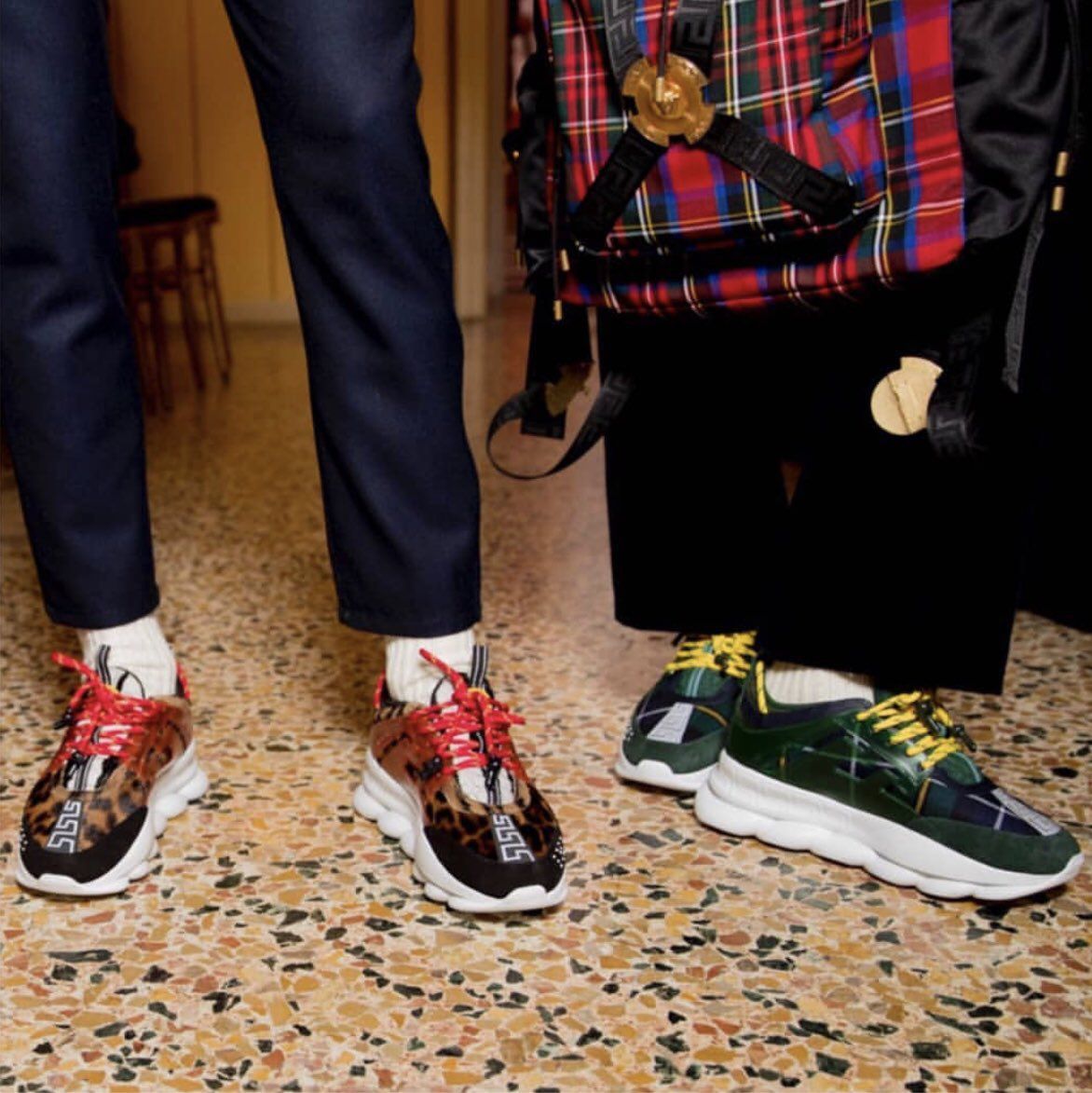 The fashion house and rapper take advantage of the last Milan Fashion Week to launch Chain Reaction, their line of shoes, characterized by bright colors (6 different colors will be available) and classic Versace motifs. The lateral written in braille "Love is blind" and the white and massive sole that traces a braided chain complete the look of trainers.