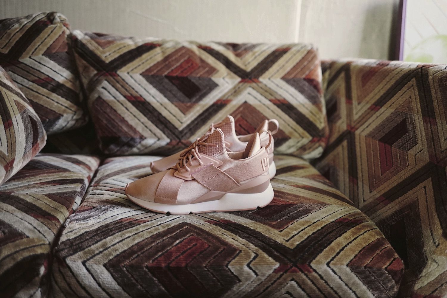 Cara, photographed by Cass Bird, poses in a total sporty PUMA look, relaxed, relaxed, in a common location, wearing the focus element of the campaign: the new Muse Satin. This sneaker has an original and sophisticated design, accompanied by a luxurious pink color.
