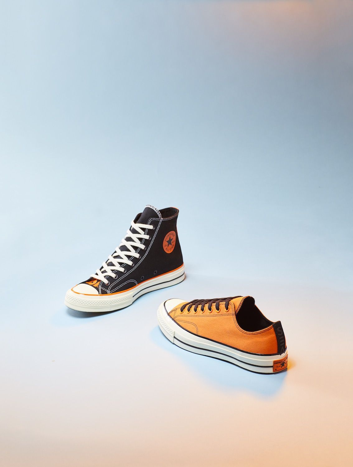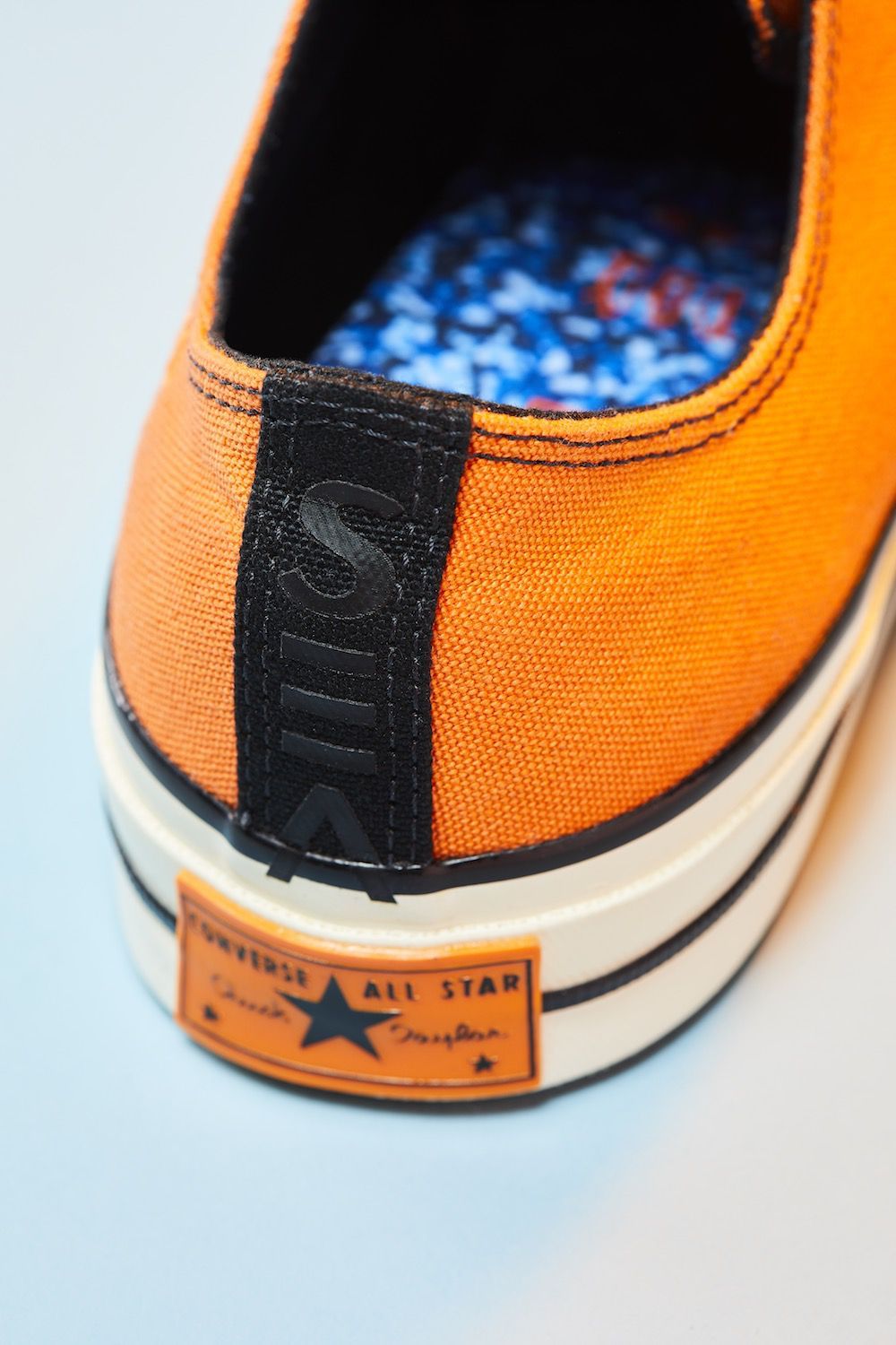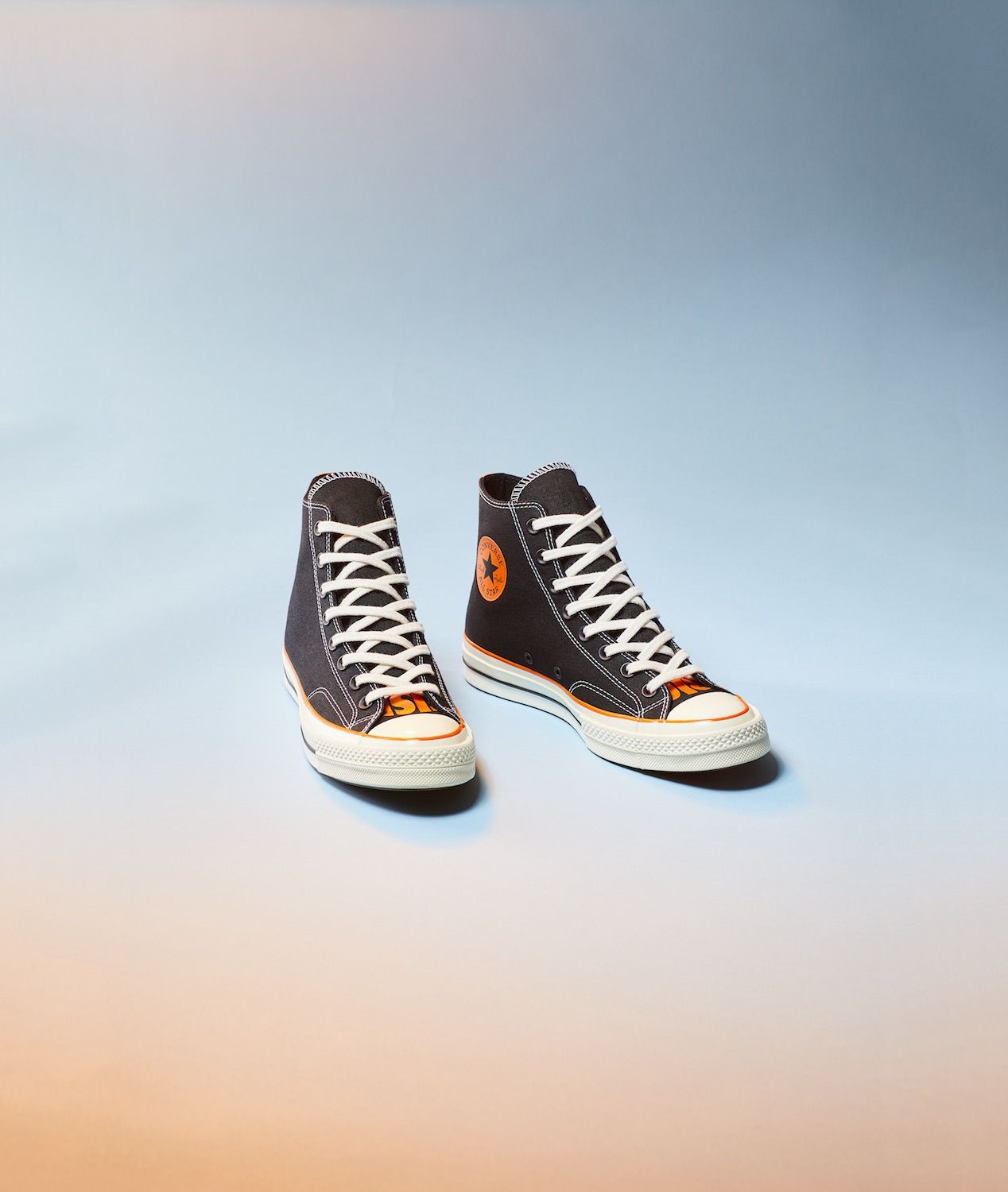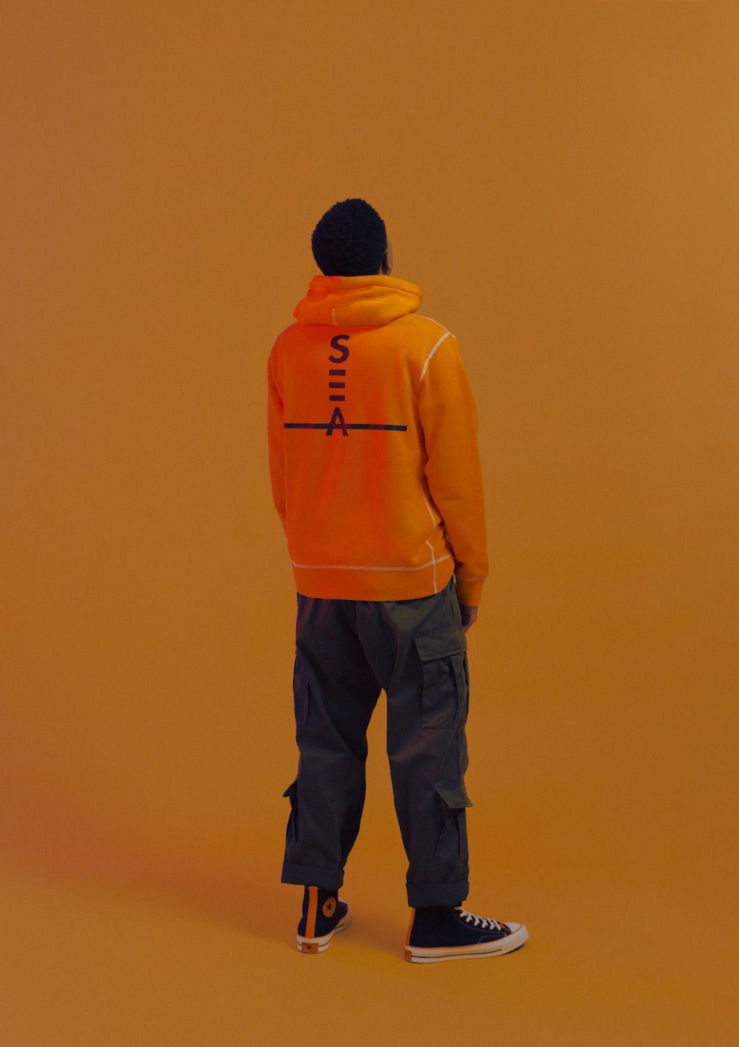 Key color of the Converse x Vince Staples capsule collection, orange dominates on both models, softening and contrasting the darker tones of the two silhouettes, while at the same time celebrating graphic art on the Big Fish ambiance. Another characteristic element of the sneaker capsule is the "SEA" graphics, present in 3D printing on the heel of Chuck 70 and widely present in the apparel line which includes the Converse Essentials sweatshirt and the 360 Legacy French Terry.