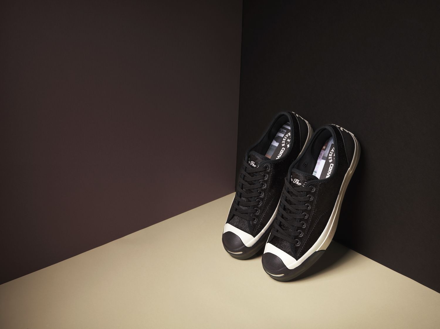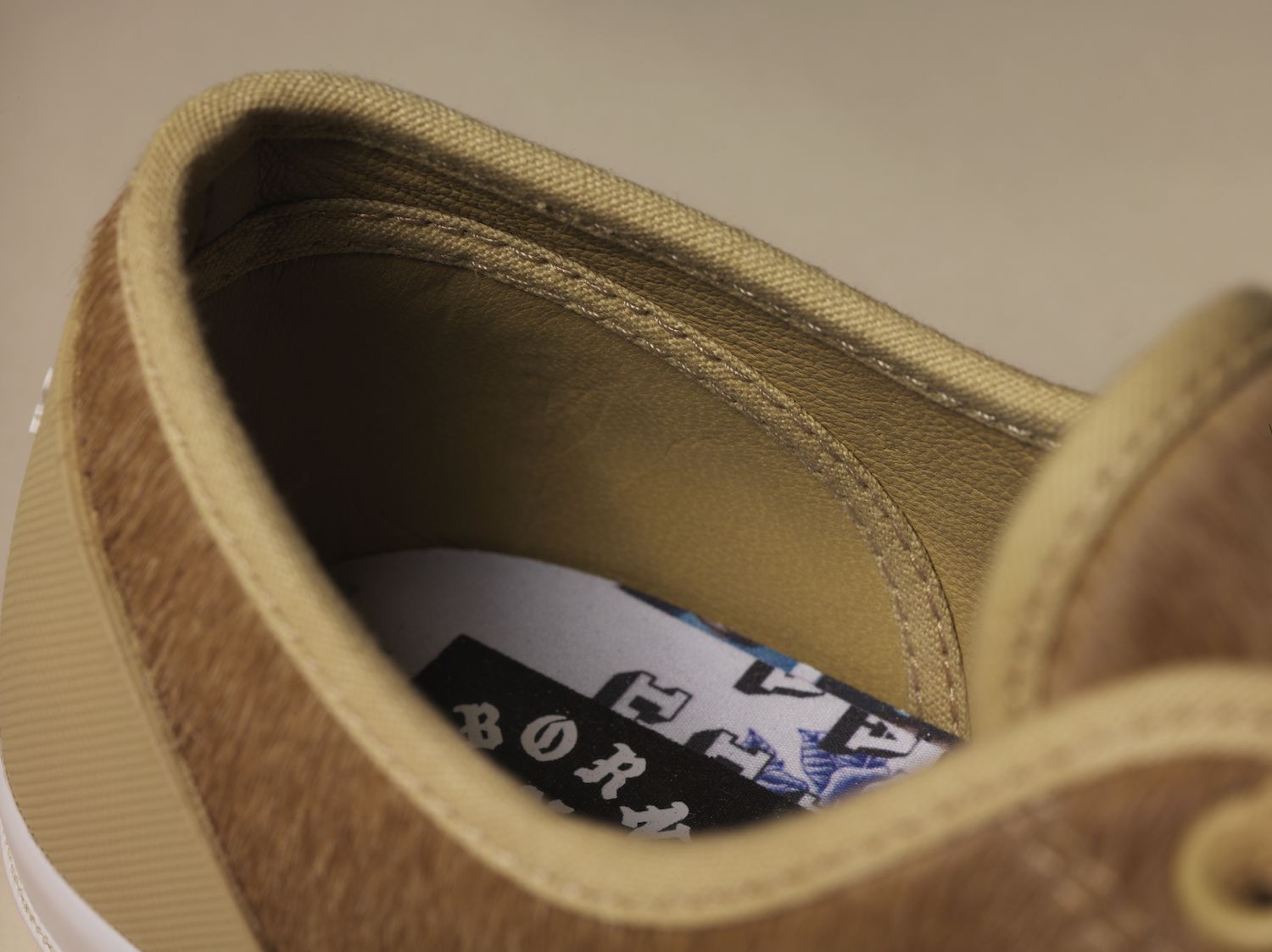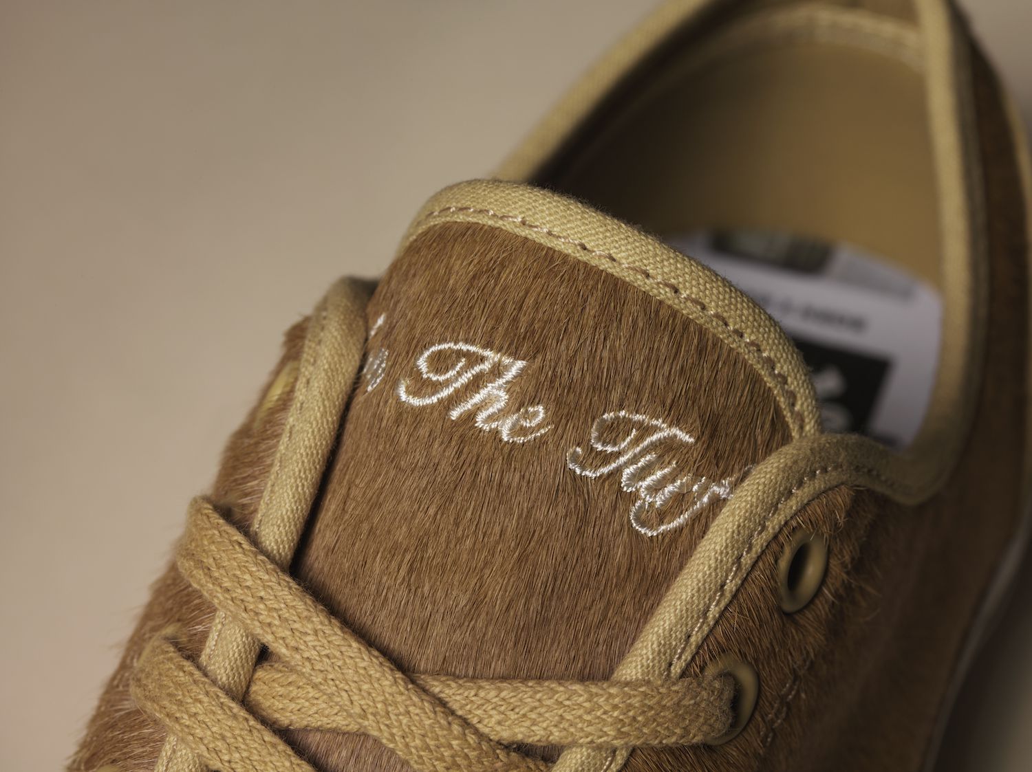 Spanto chose and reworked in a personal way the Converse Jack Purcell model sneaker which debuted on the badminton court in 1933 and the same one that he has always worn while growing up.The shoe now has a black or camel-colored upper in a fake pony, the inscription "On The Turf" on the tongue and the white rubber sole, while the toe and heel, also in rubber, have the same tones as the sneaker.