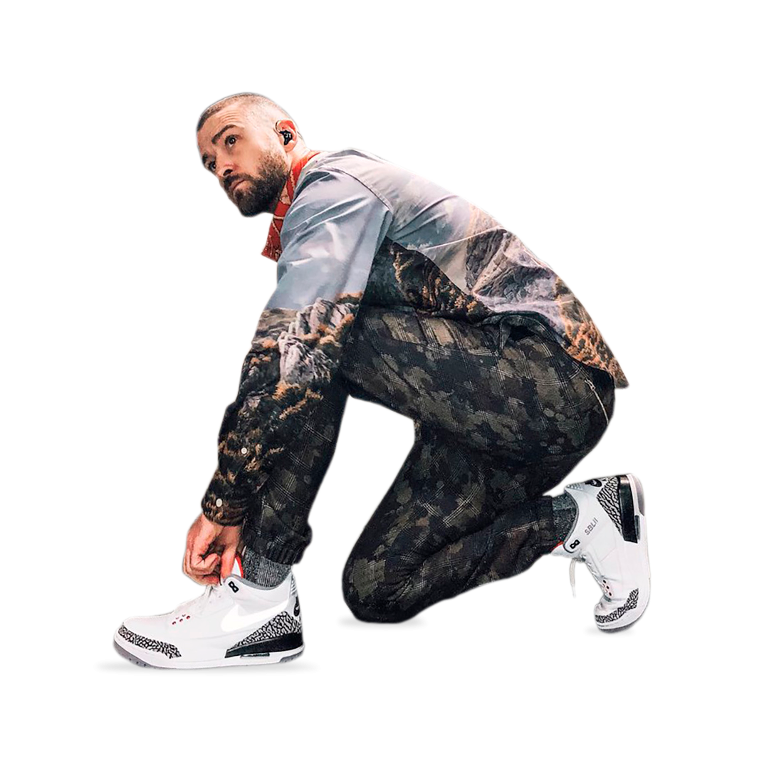 For the Half-time show of the Super Bowl between Patriots and Eagles on Sunday February 4th, Justin Timberlake hit the public with a spectacular exhibition, wearing a special custom suit and a shirt made exclusively for him by Stella McCartney, styled with a limited Air Jordan Retro 3 JTH, released in a really limited quantity after the Half-time show on the Nike SNKRS app.
