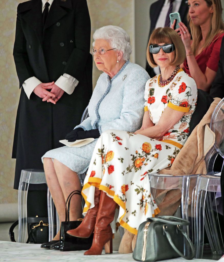 Her Majesty made a surprise appearance in the front row of Richard Quinn's fashion show, sitting on a ghost chair designed by Philippe Starck between Caroline Rush, Chief Executive of the British Fashion Council, and Anna Wintour.
