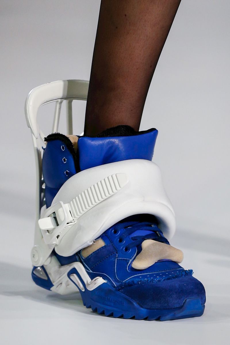 The outfits include chain belts, oversized clutches made of waterproof and padded polyester, "Security Margiela Sneaker", that is robust white leather sneakers or silver holographic surfaces, finished with mountain climbing equipment details.