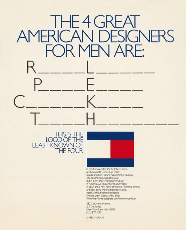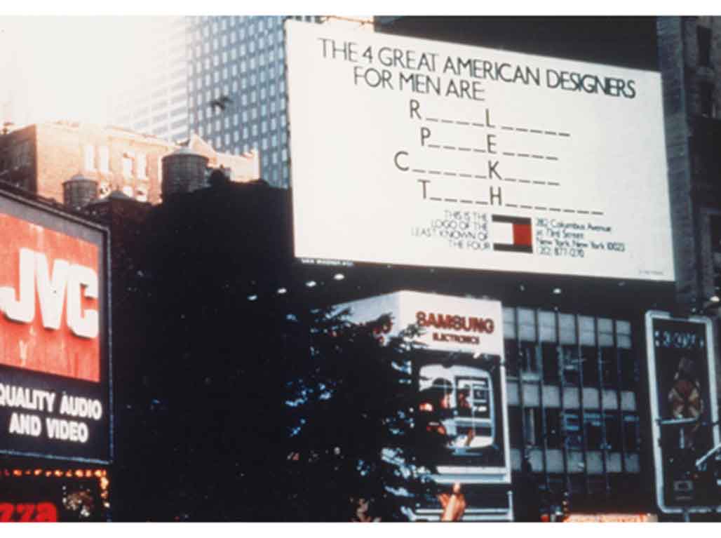 The result is a huge billboard at Times Square, a kind of hangman game with the inscription "The 4 greatest American male designers are R____ L_____, P____ E____, C_____ K____, T____ H_______", ie Ralph Lauren, Perry Ellis, Calvin Klein and Tommy Hilfiger himself.