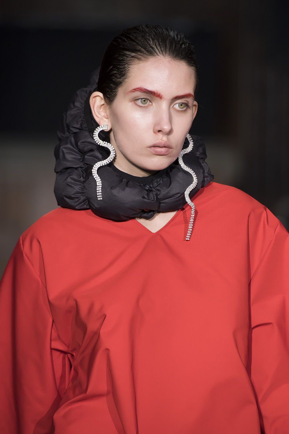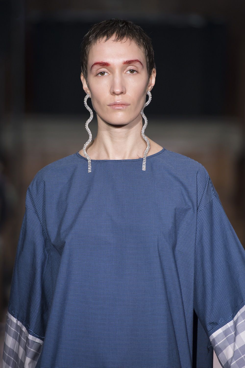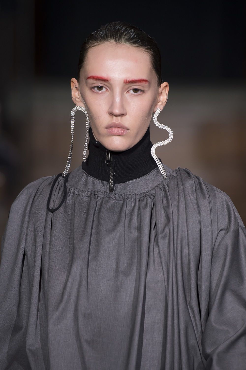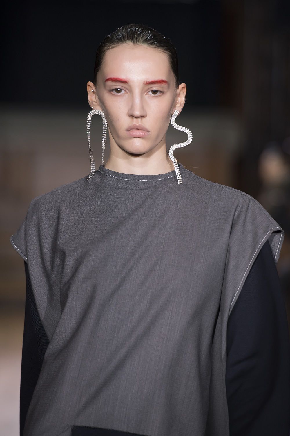 Plus touches? The long diamond earrings, the inevitable sporty touch and...colored eyebrows.