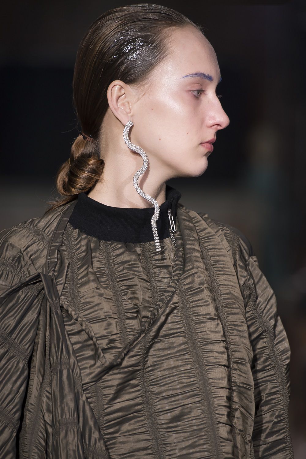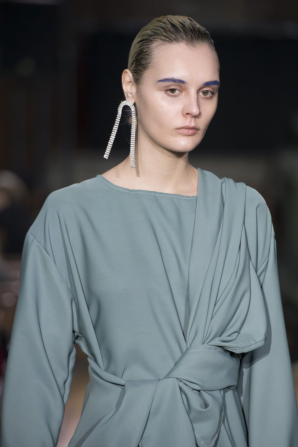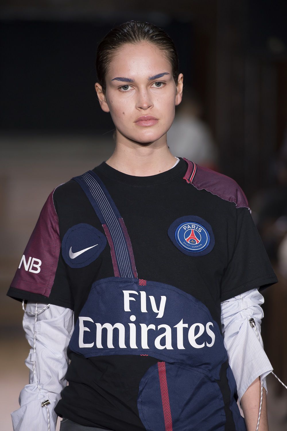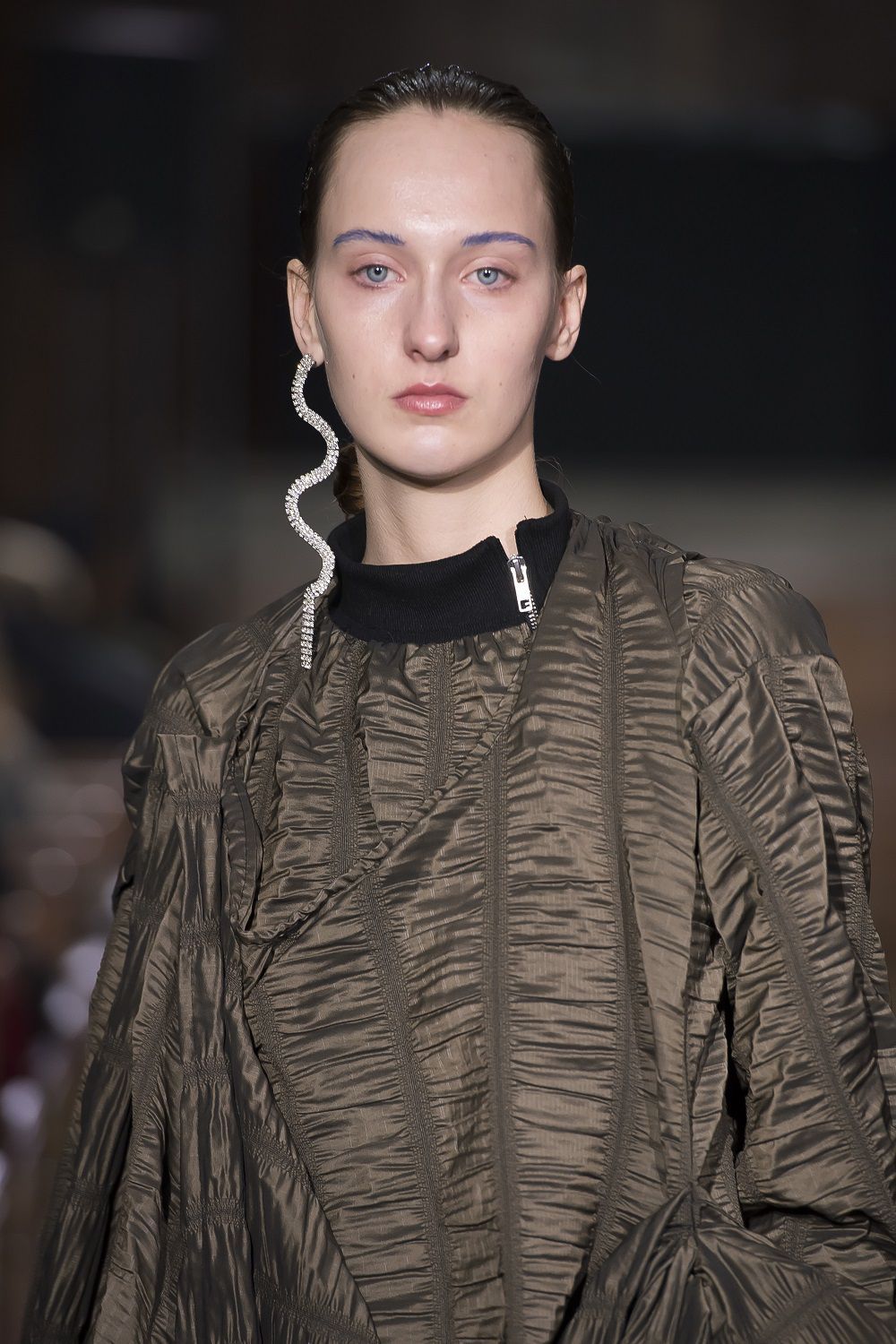 Plus touches? The long diamond earrings, the inevitable sporty touch and...colored eyebrows.