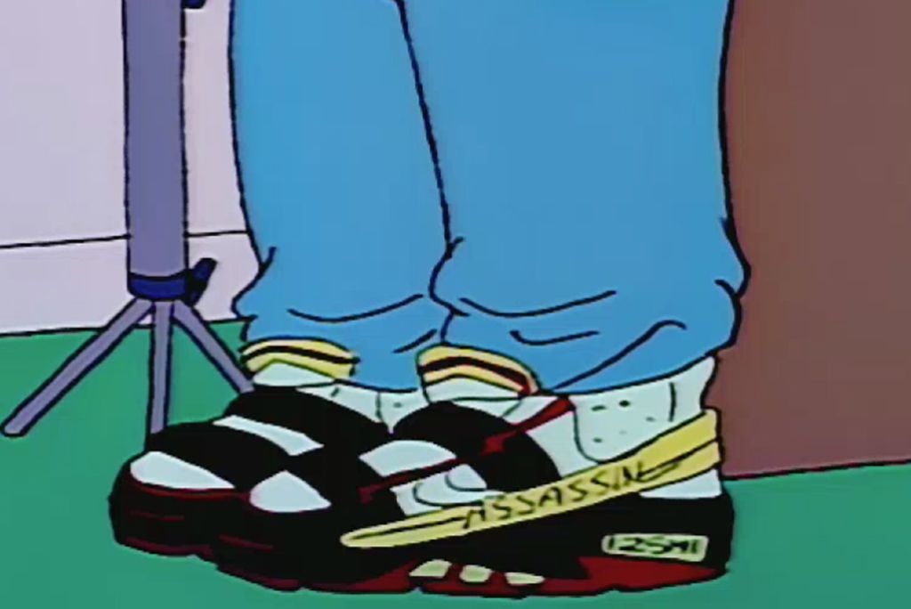 In the Season 2 episode of The Simpsons titled Bart's Dog Gets an F., Homer goes to the mall and returns home with a couple of very expensive "Assassins" Sneakers, but it's a shame that soon after Santa's Little Helper Christmas, the family dog, reduces them to shreds.