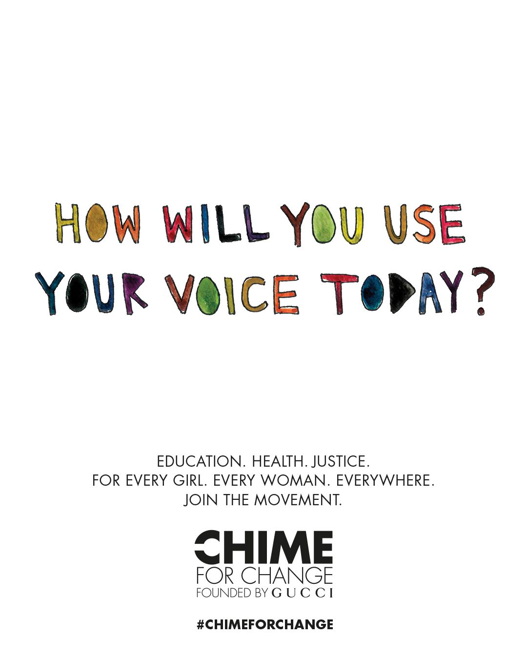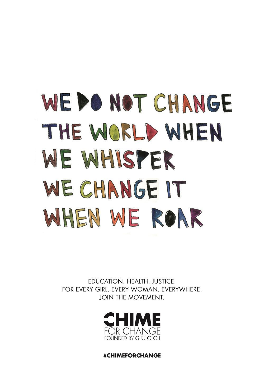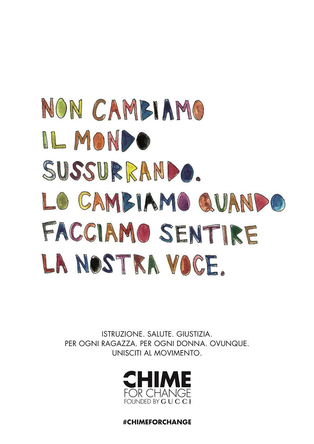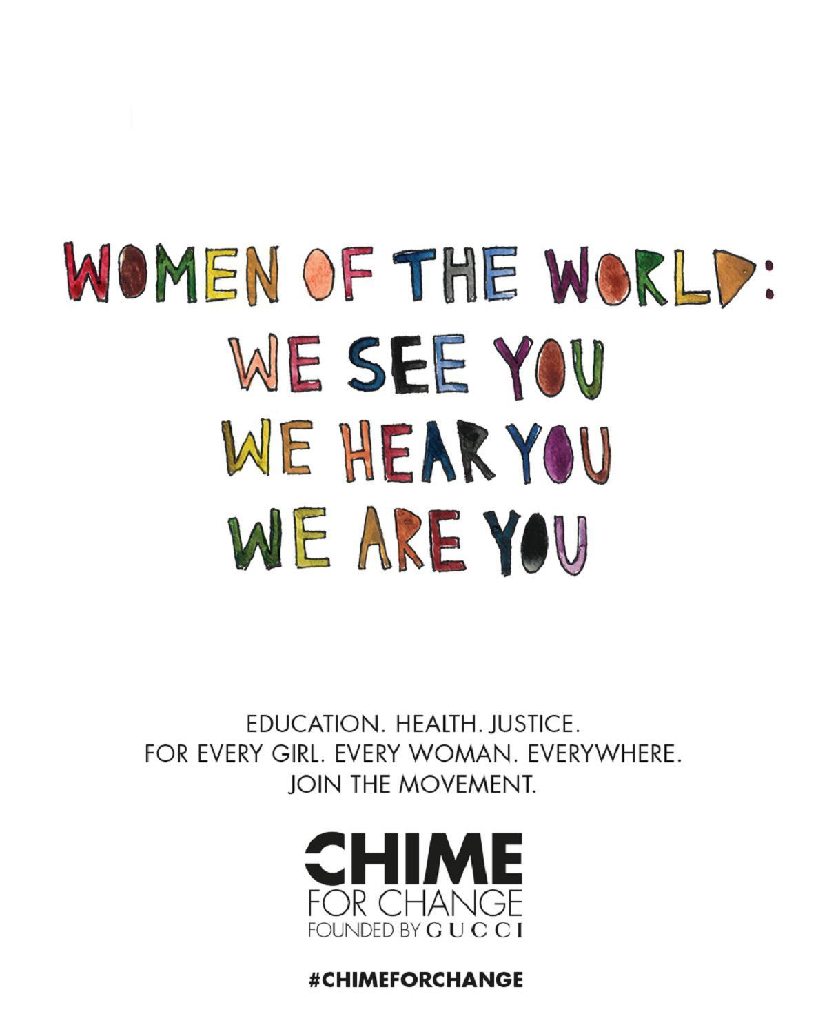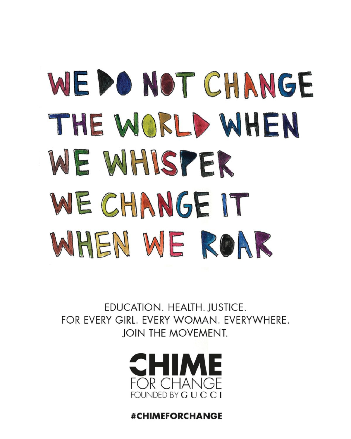 CHIME FOR CHANGE is the global campaign founded by Gucci in 2013, which has as main purpose to defend rights from the legal point of view, both in terms of education and health, because in 2018 we can't talk about the women like the inferior gender. 10 million dollars are collected for this cause and numerous partnerships have been initiated with associations and members such as Kering Foundation, the Bill & Melinda Gates Foundation, Facebook or Hearst Magazines.