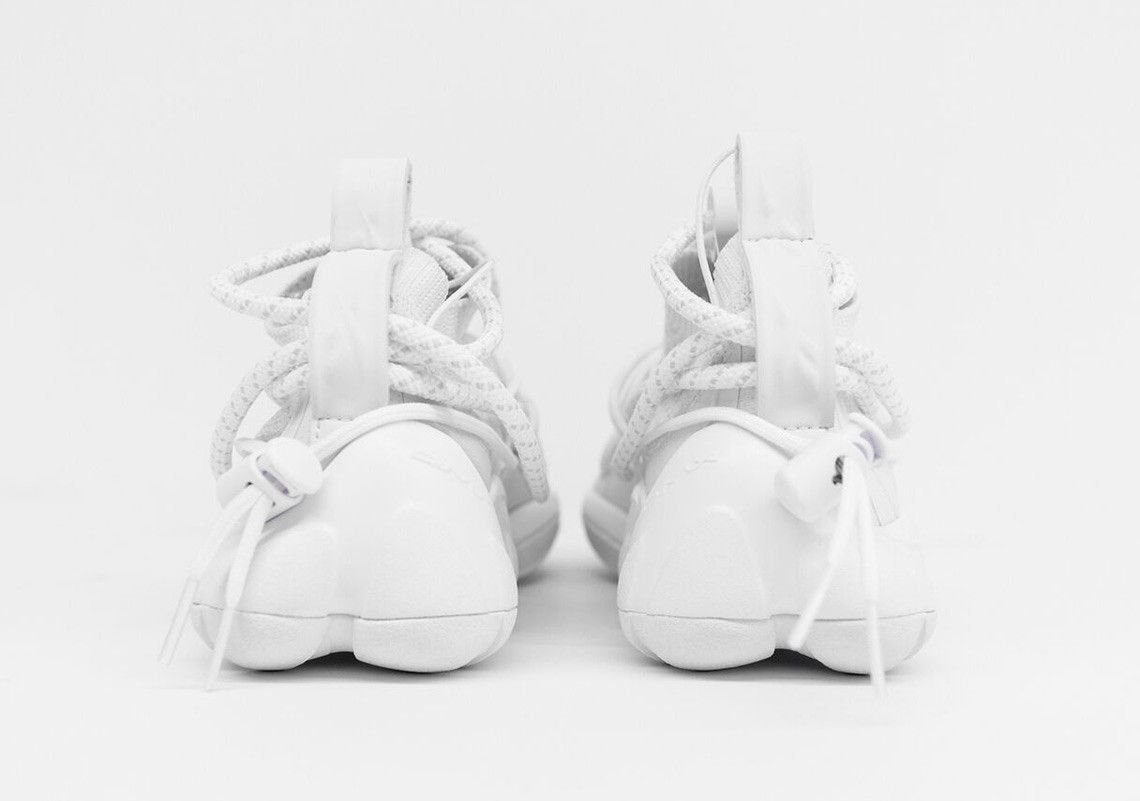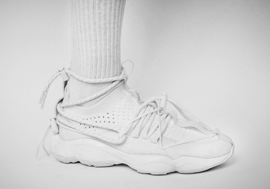 The characteristics of the sneaker? Colorway "Triple White", ankle sock collar, bulb sole, a special lacing system with double strings and lace-ups.