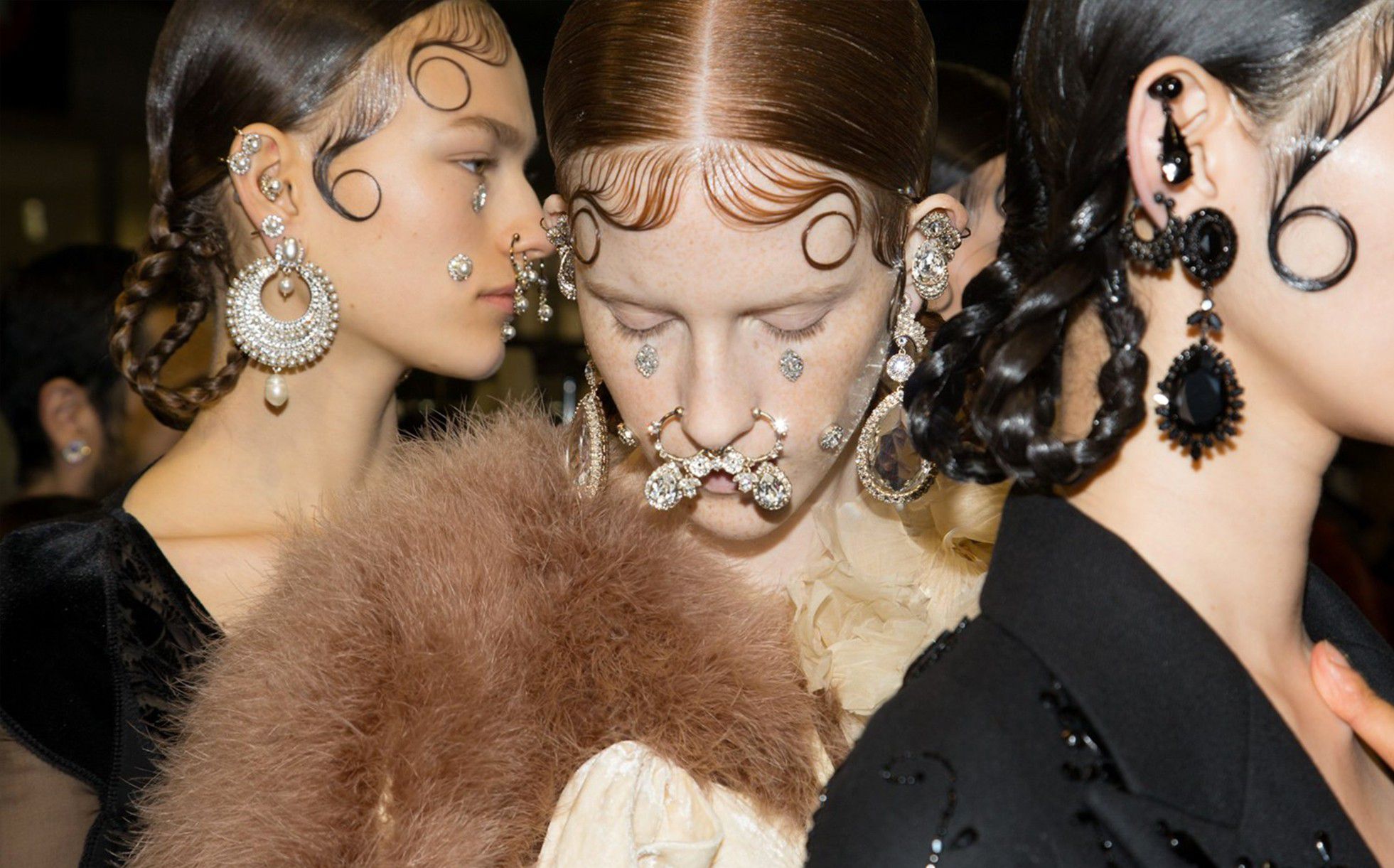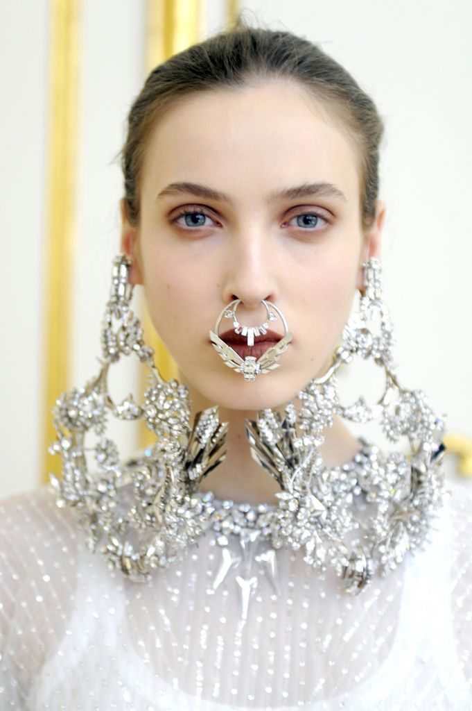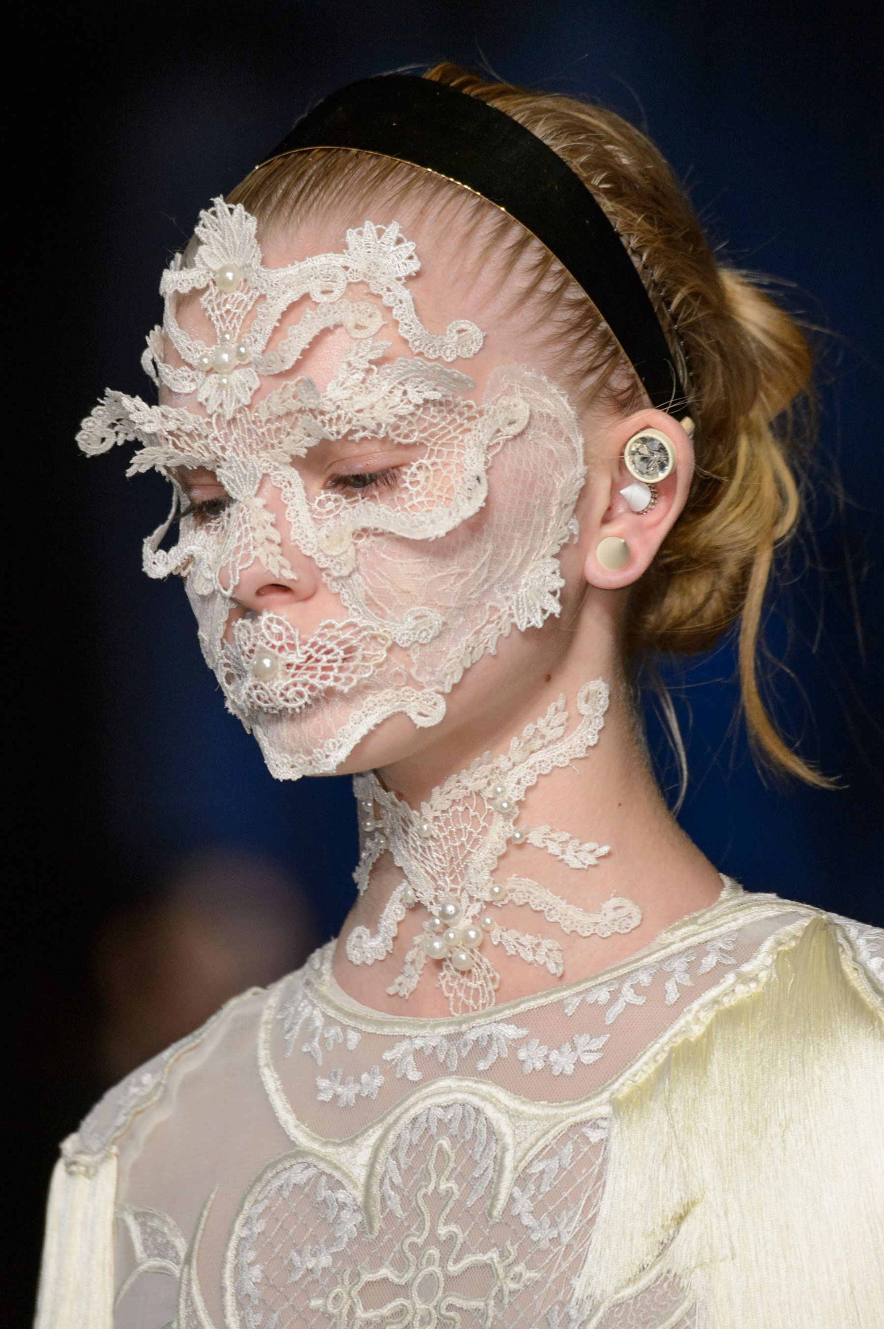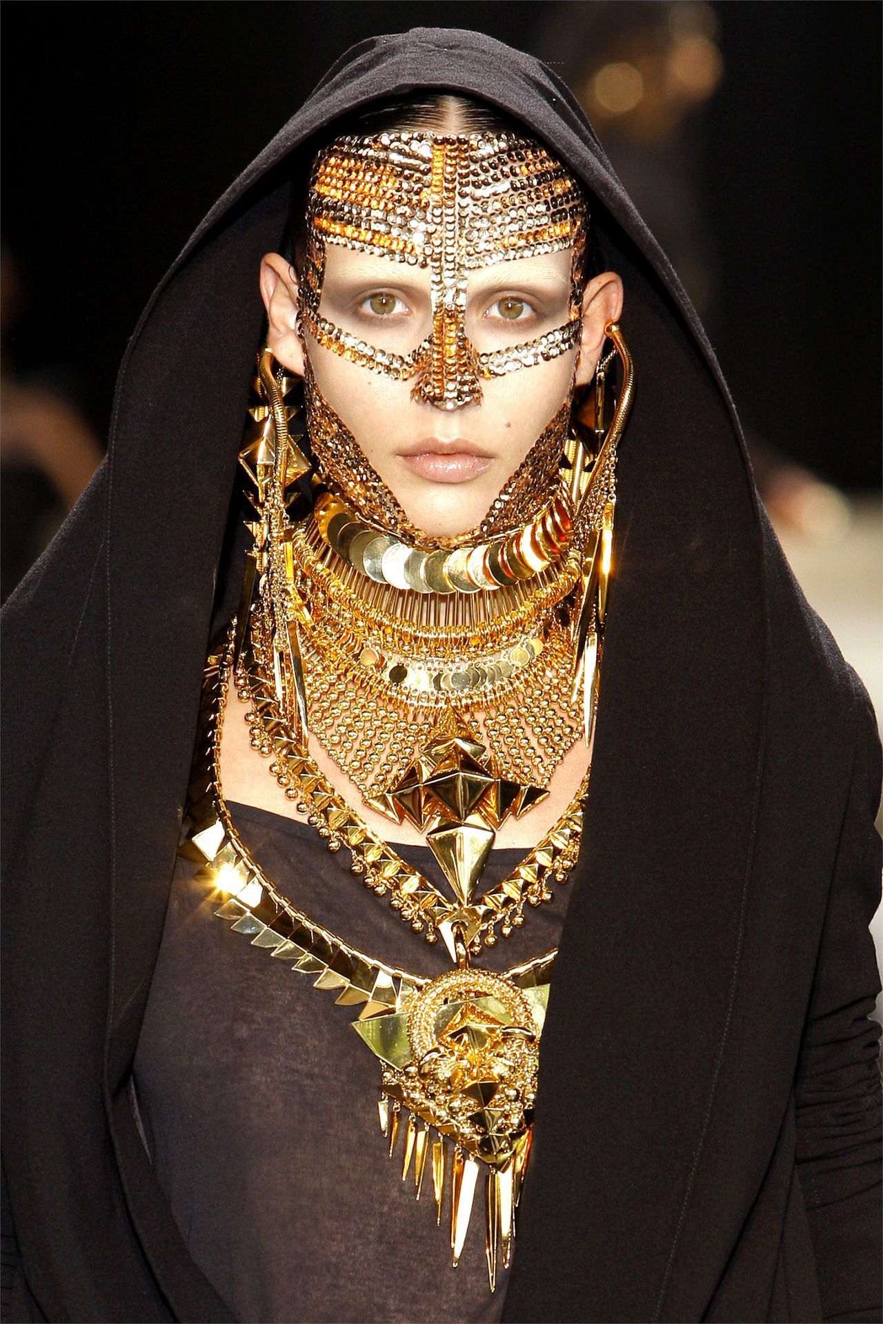Velvet, embroidery, prints of peacock feathers, lace, pearls, religious allegories, minotaurs, mermaids, dramatic and beautiful facial jewels and a good dose of black.