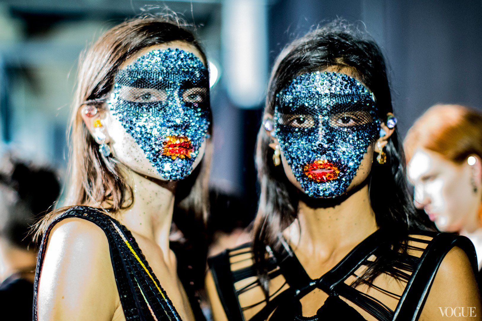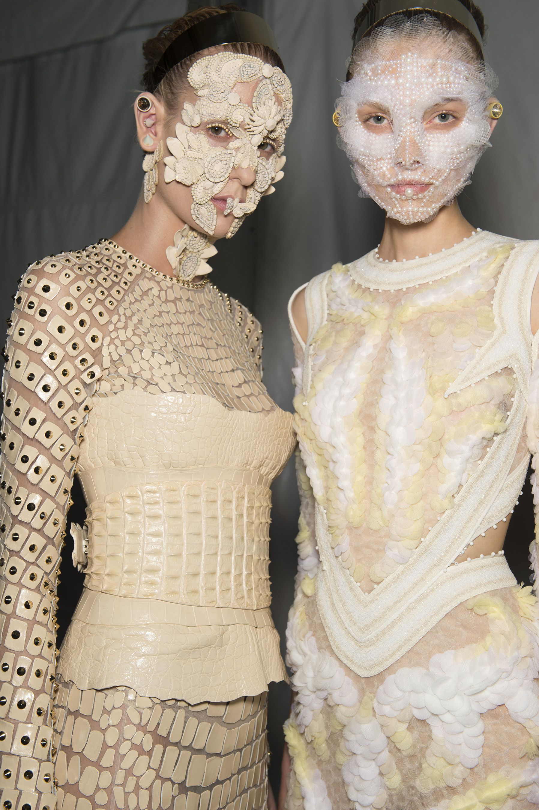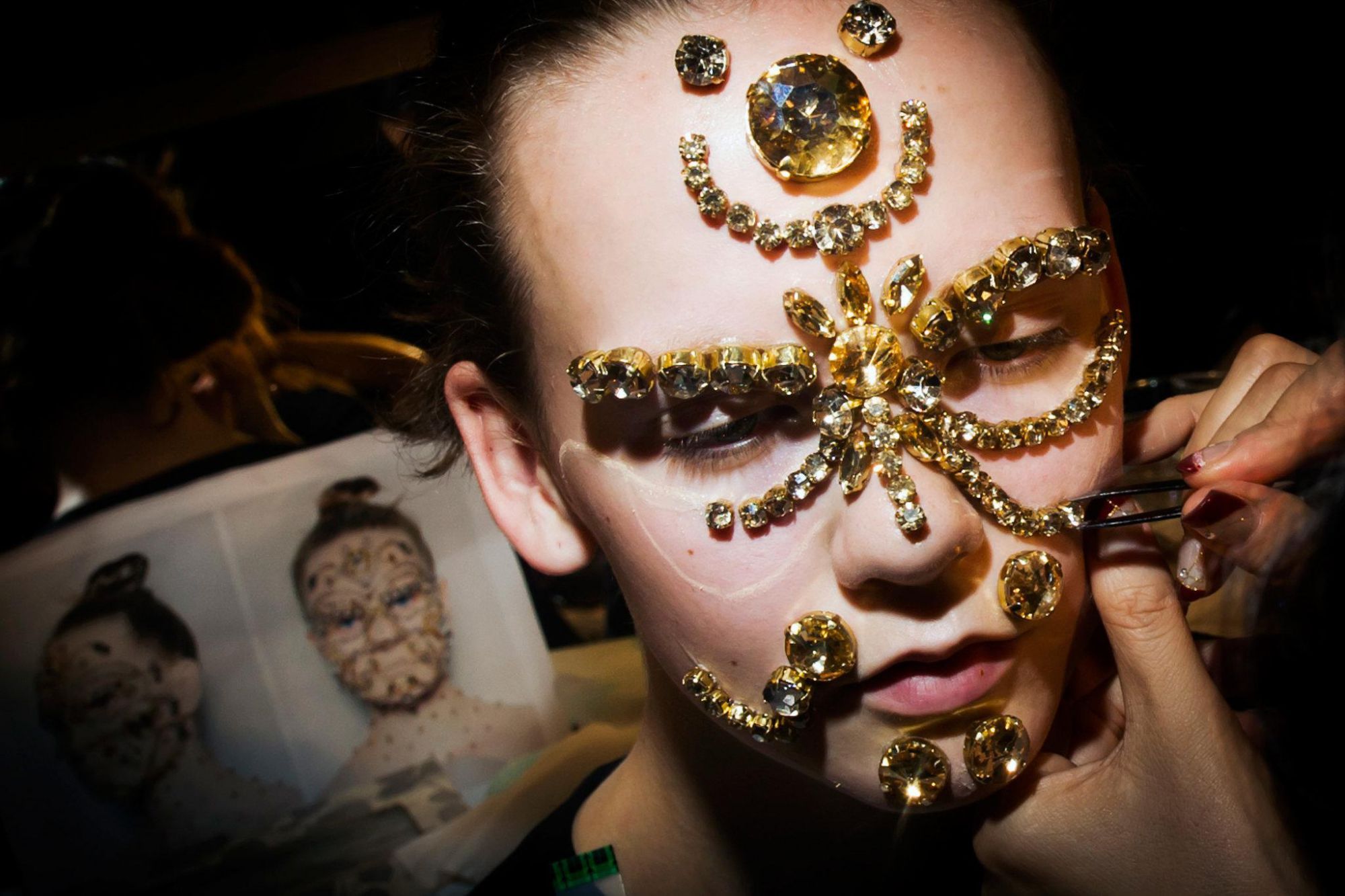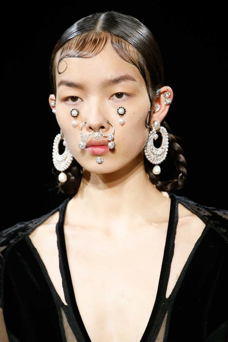 Velvet, embroidery, prints of peacock feathers, lace, pearls, religious allegories, minotaurs, mermaids, dramatic and beautiful facial jewels and a good dose of black.
