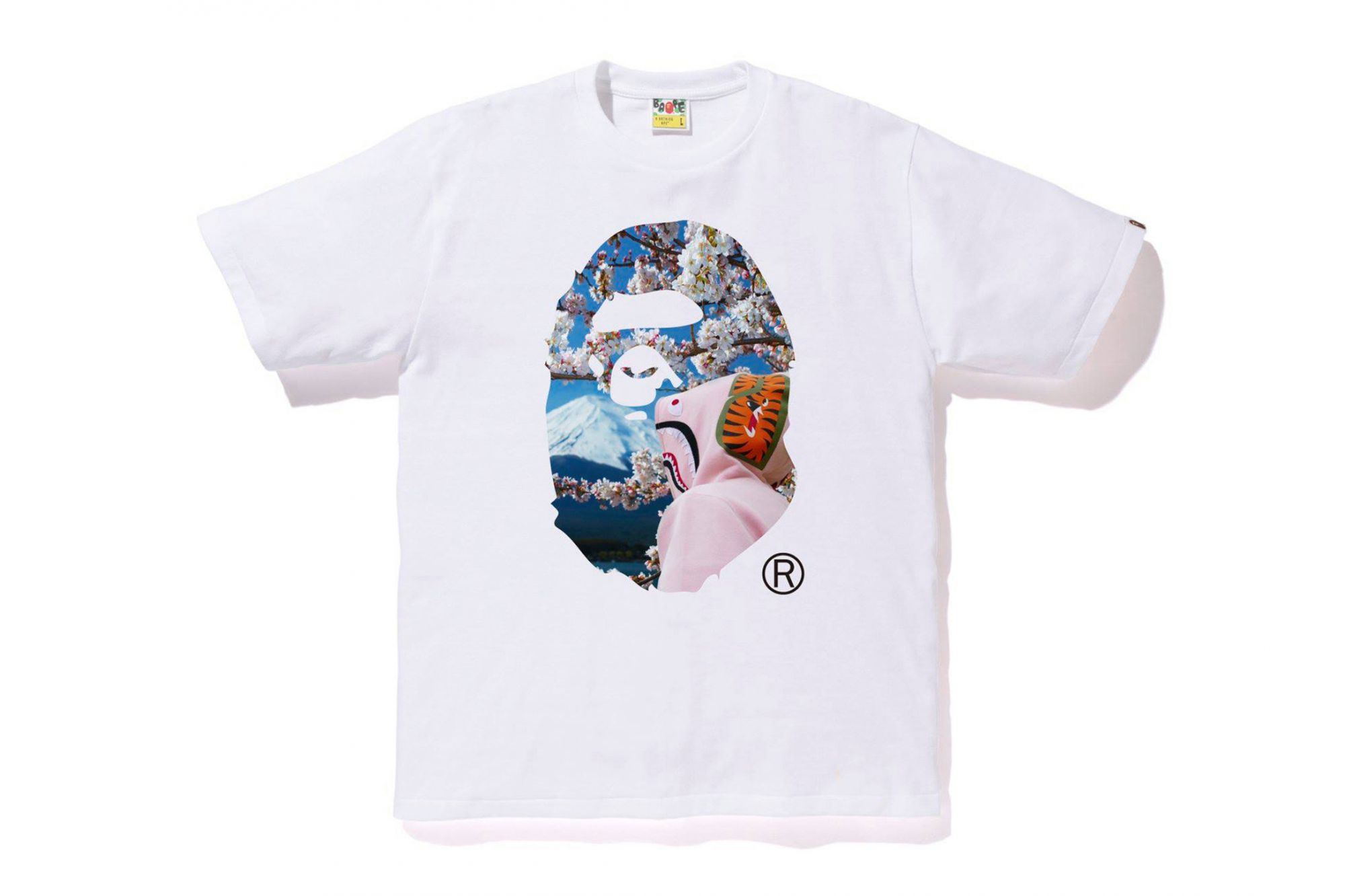 They are called "SAKURA APE HEAD PHOTO TEE" and "SAKURA COLLEGE TEE". They depict a person wearing a Shark hoodie in front of Mount Fuji and an explosion of pink flowers inside the distinctive ape-shaped logo.