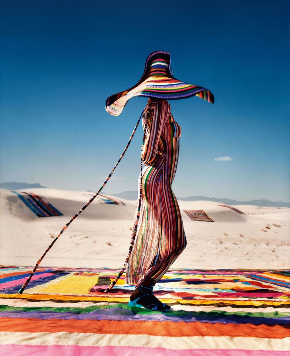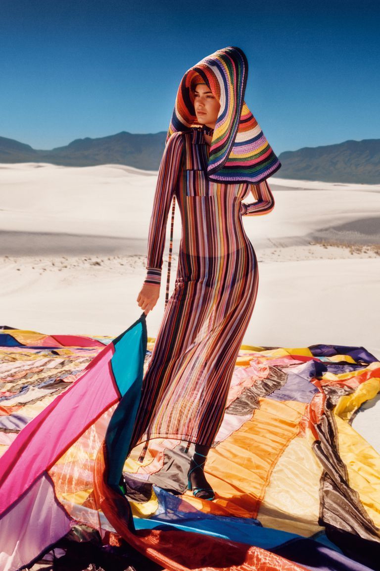 Kendall Jenner, photographed by Harley Weir in the evocative setting of White Sands National Monument, becomes the protagonist of a vibrantly colored painting, in which the gigantic patchwork of the American artist Rachel Hayes becomes a sort of extension of the Missoni garments.