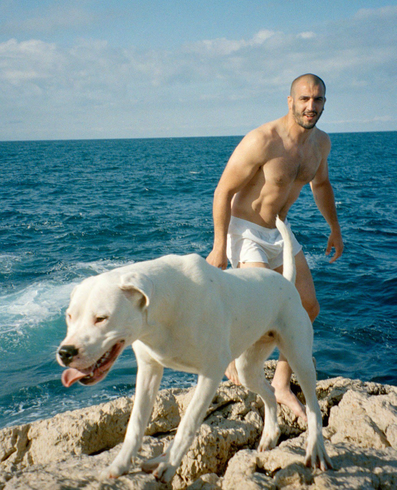 With a shot, the designer also unveils the first brand ambassador of the homme collections: the French rugby player Yoann Maestri, portrayed in a pair of white shorts with a dog, on the rocks that emerge from azure waters.
