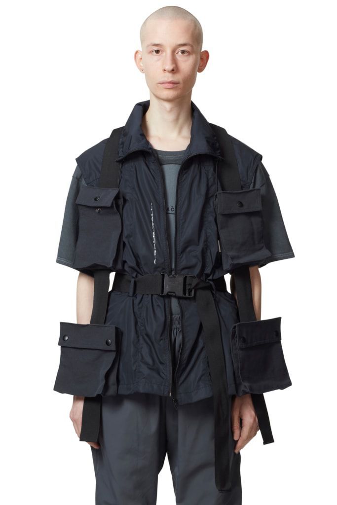 - This navy strap gilet is constructed of heavy-duty nylon and treated cotton denim pockets, and offsets a striking cut with subdued toning. The piece comes complete with bold 3D pockets and industrial vertical straps that can be worn both on the back, or front of the garment.
