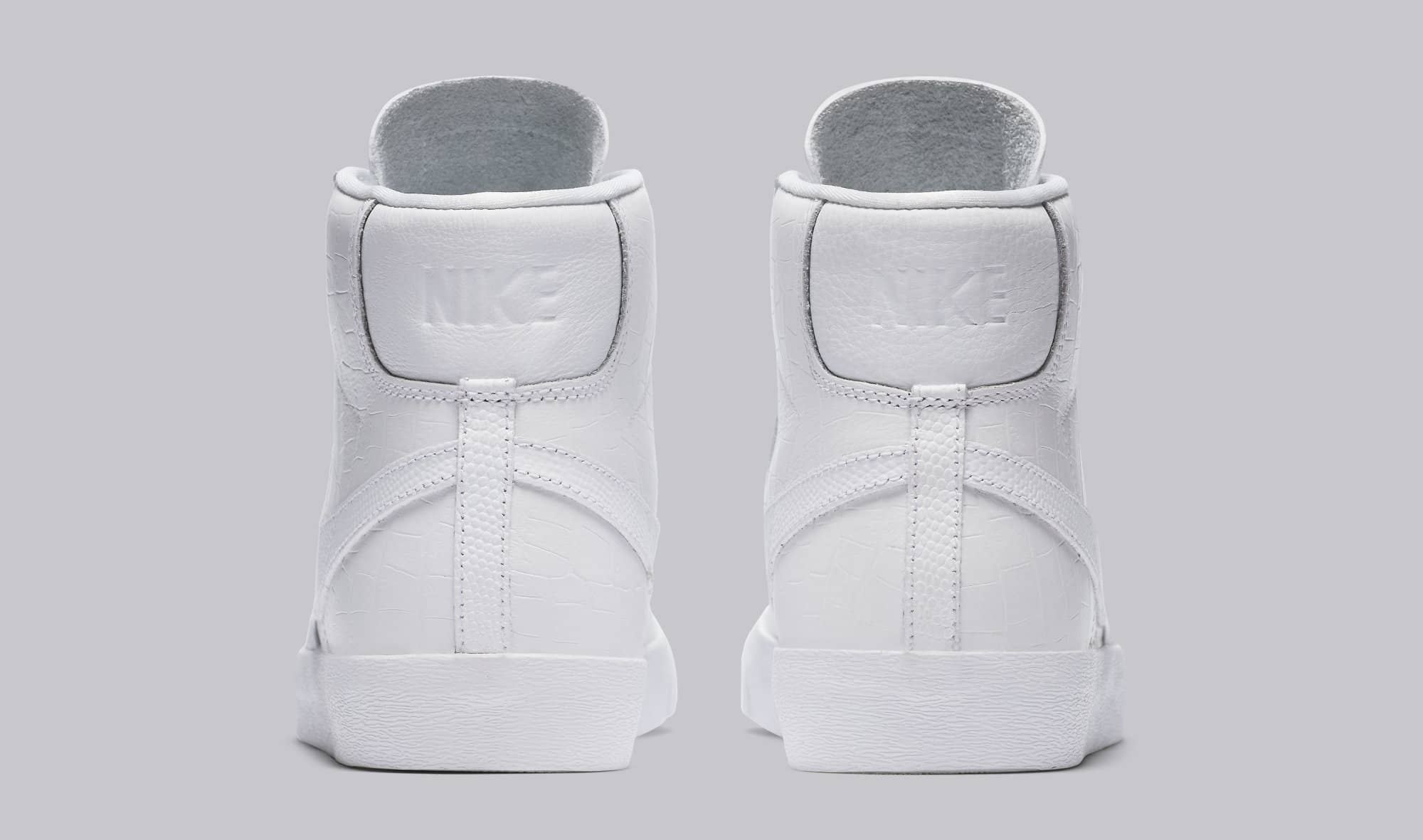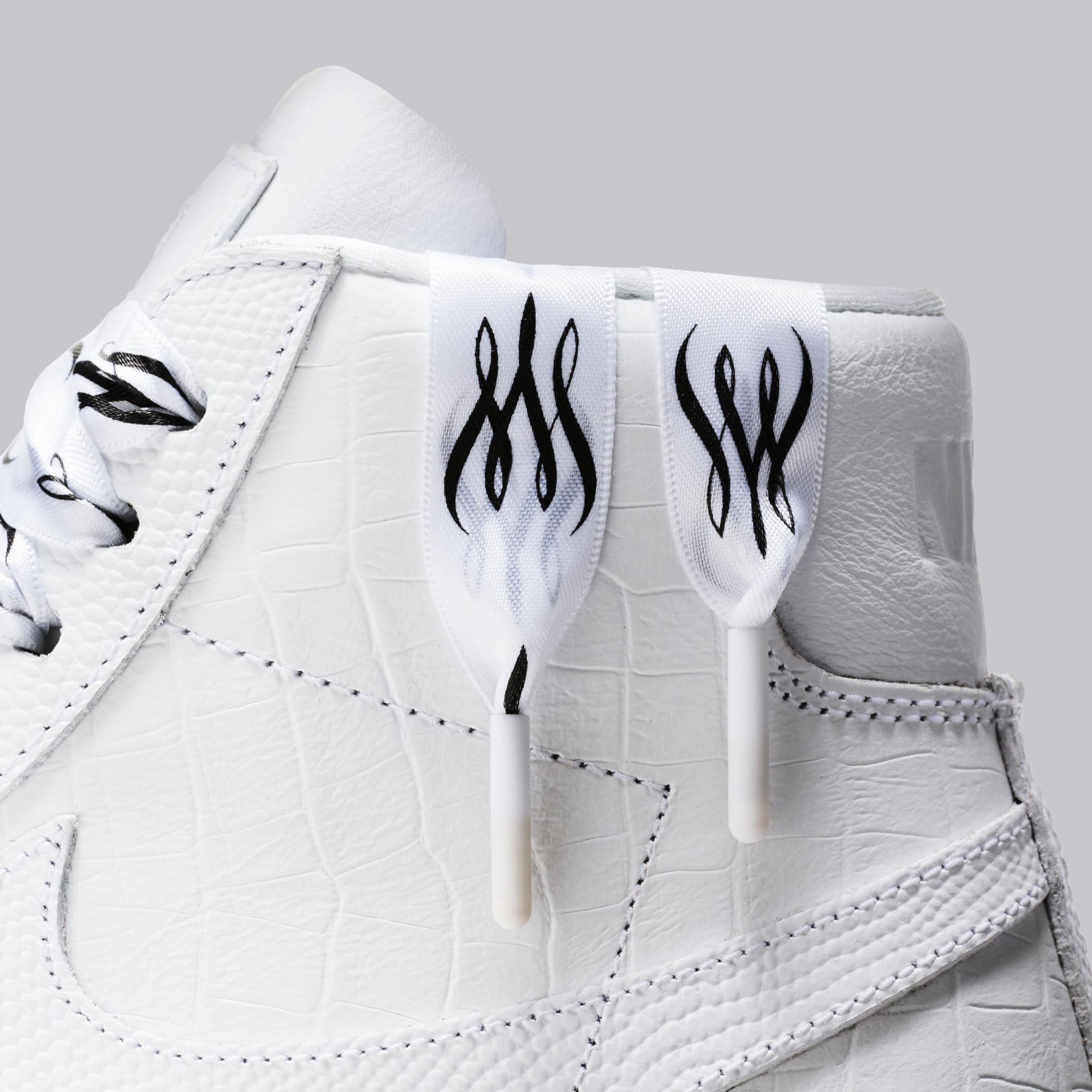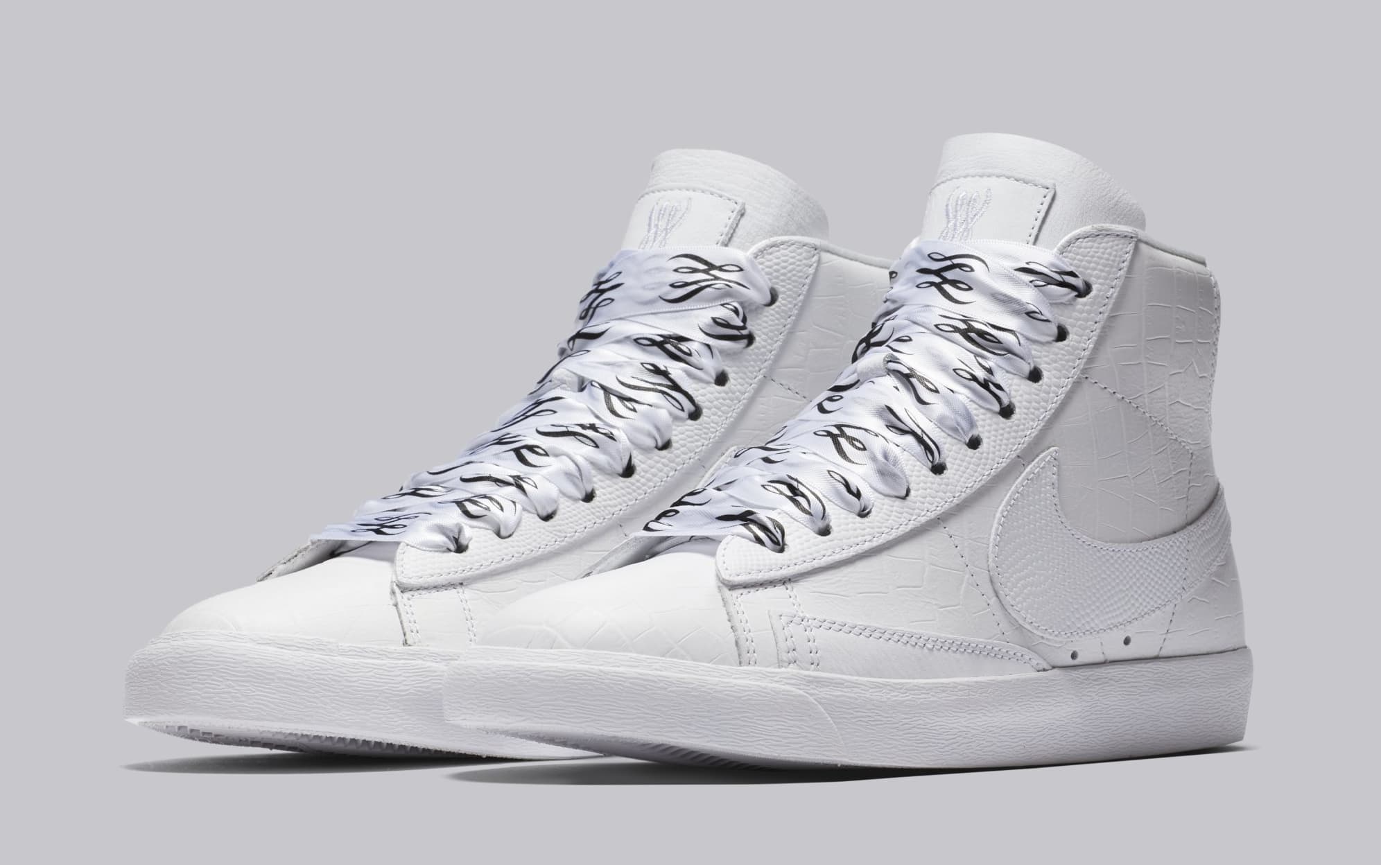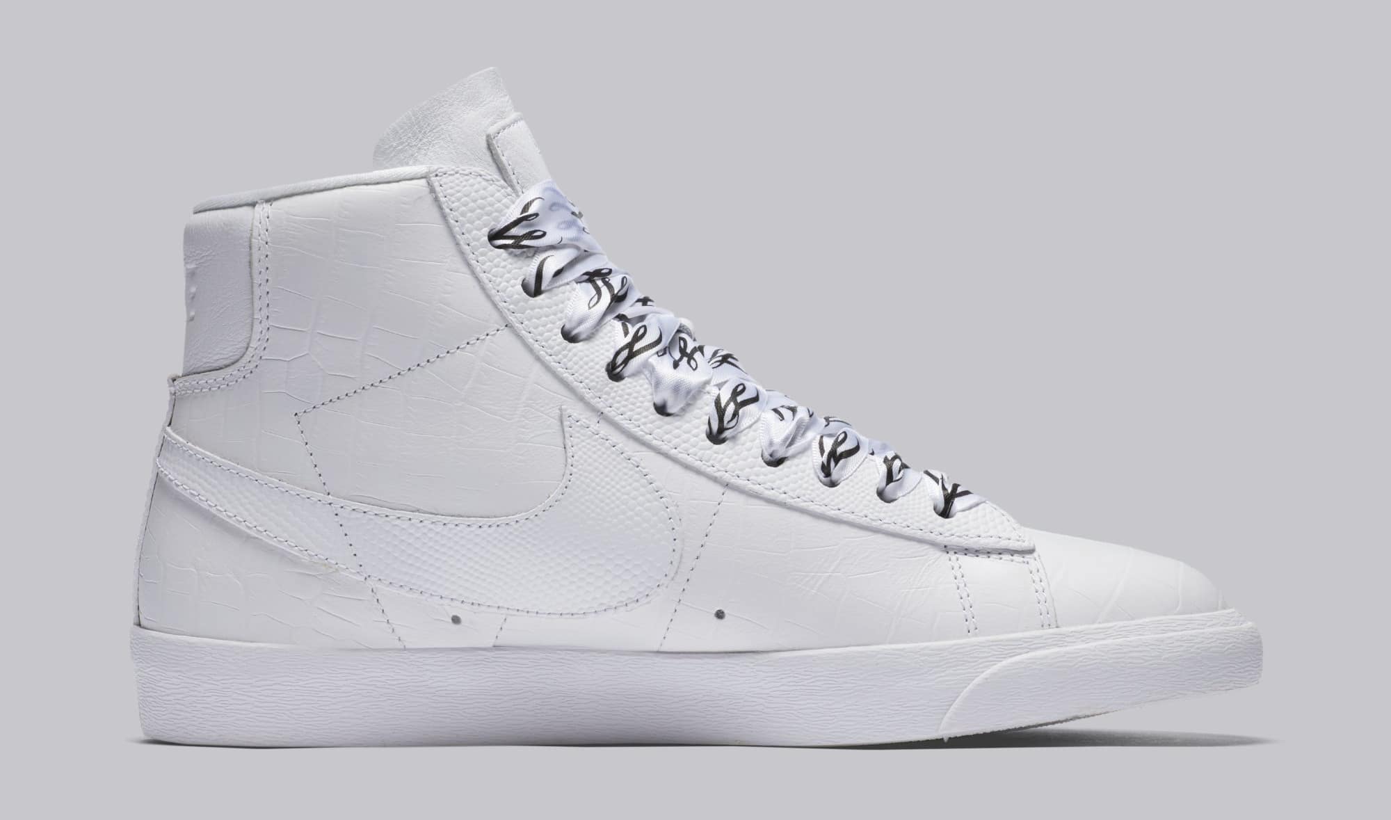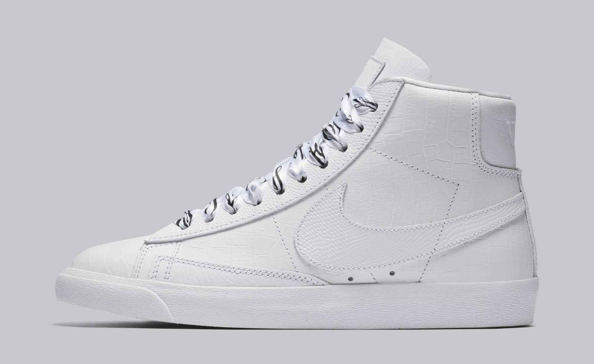 The limited edition shoe has a completely white colorway, features a crocodile-skin textured leather upper and a pebble-grain finish on the Swoosh and eyelets. The brand "SW" in black (the initials of the tennis player) stand out on the white satin laces and on the tongue.