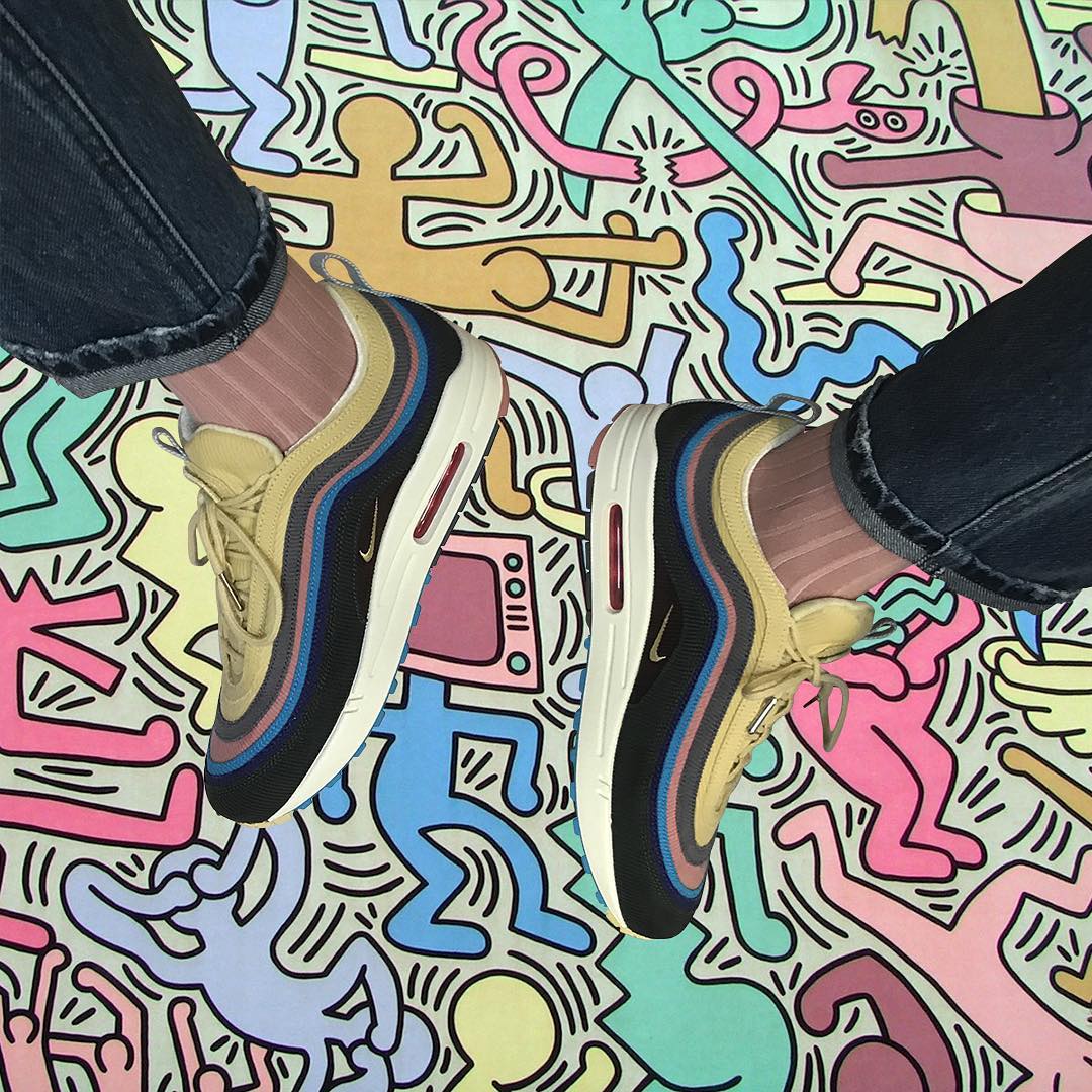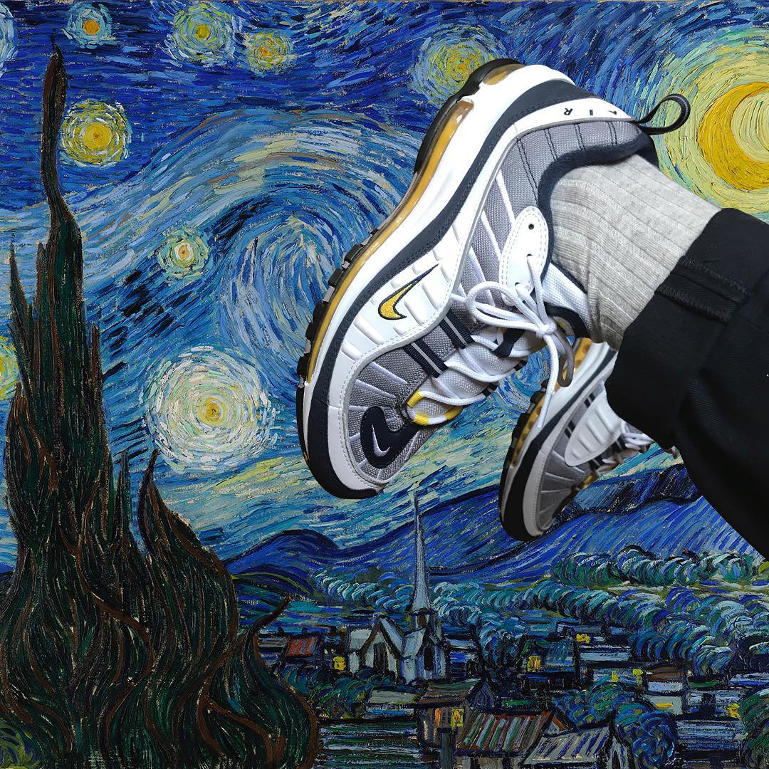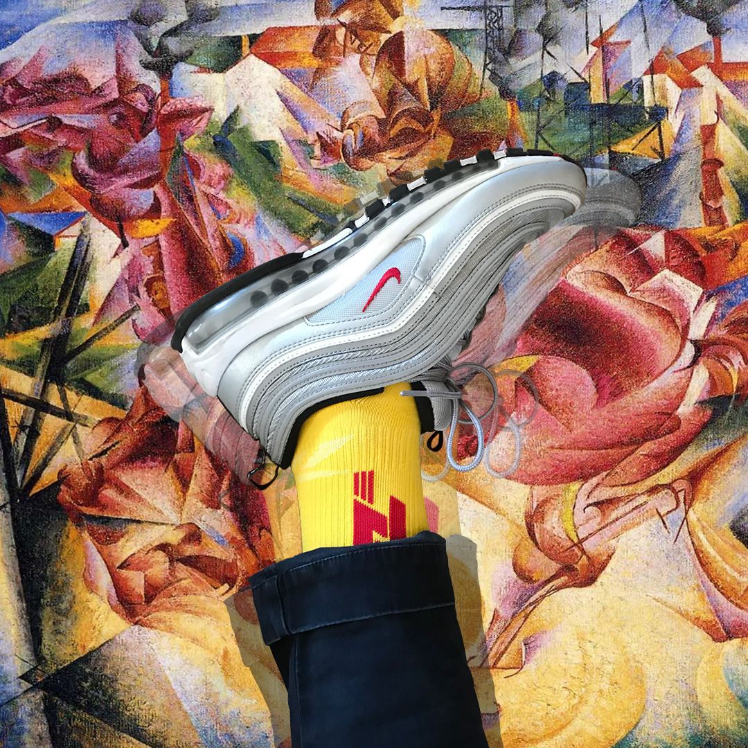 The choice of similar colors between sneaker and picture is only a small part of the research process. Each shoe has its own "mood" and its history and, trying to catch it, I look for some works of art that are related with the philosophy or the context of the shoe. For example, in the picture above, I decided to combine the Air Max 97 Silver, a sneaker inspired by Japanese high-speed trains, with Vetements x DHL socks (shipping company that represents the speed and the frenzy of our age) and as a framework “Elasticity” by Umberto Boccioni, a pivotal work of Italian Futurism, a movement whose fundamental principles are dynamism, modernity, and technique.