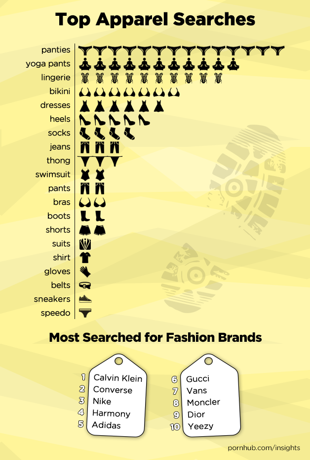 Looking closer at the actual data, let us start with where sneakers fall in the full range of apparel searches. At the top, we see the perhaps not so unexpected top placement of ‘panties’ followed in second by the more surprising search for 'yoga pants' which even beats out 'lingerie' in the third position. Sneakers are now actually in the top 20 of apparel searches on Pornhub.