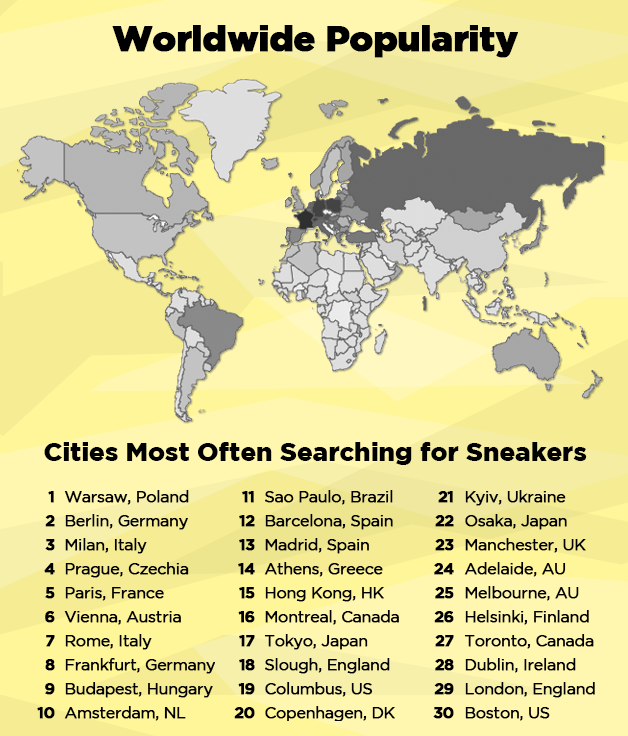 Polish sneakers, as unusual as it may sound, does make more sense when seeing that Poland was the country in which most searched for sneaker porn. Followed by Berlin, Milan, Prague, and Paris. Twenty of the top thirty sneaker searching cities are located in Europe. Sao Paulo, Brazil ranks 11th, Montreal, Canada is 16th and Adelaide, Australia is 24th.