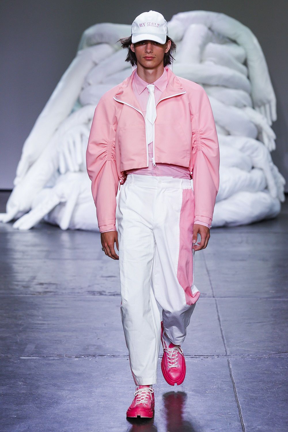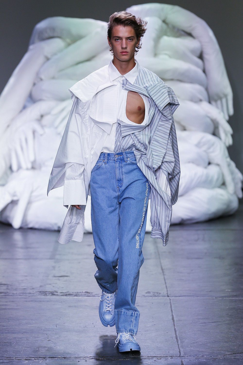 My Half talks about a middle fashion, which mixes different cuts and ideas to find a balance. Two garments become one on the Feng Chen Wang catwalk, as we see with the denim jackets made with Levi's, almost asymmetrical, characterized by two different washed items that have joined and found their symmetry. The collars are placed not in their usual position but in the middle of a tee, the shirts are pierced on the chest and dominated by floating drapes that give movement and life to the head.