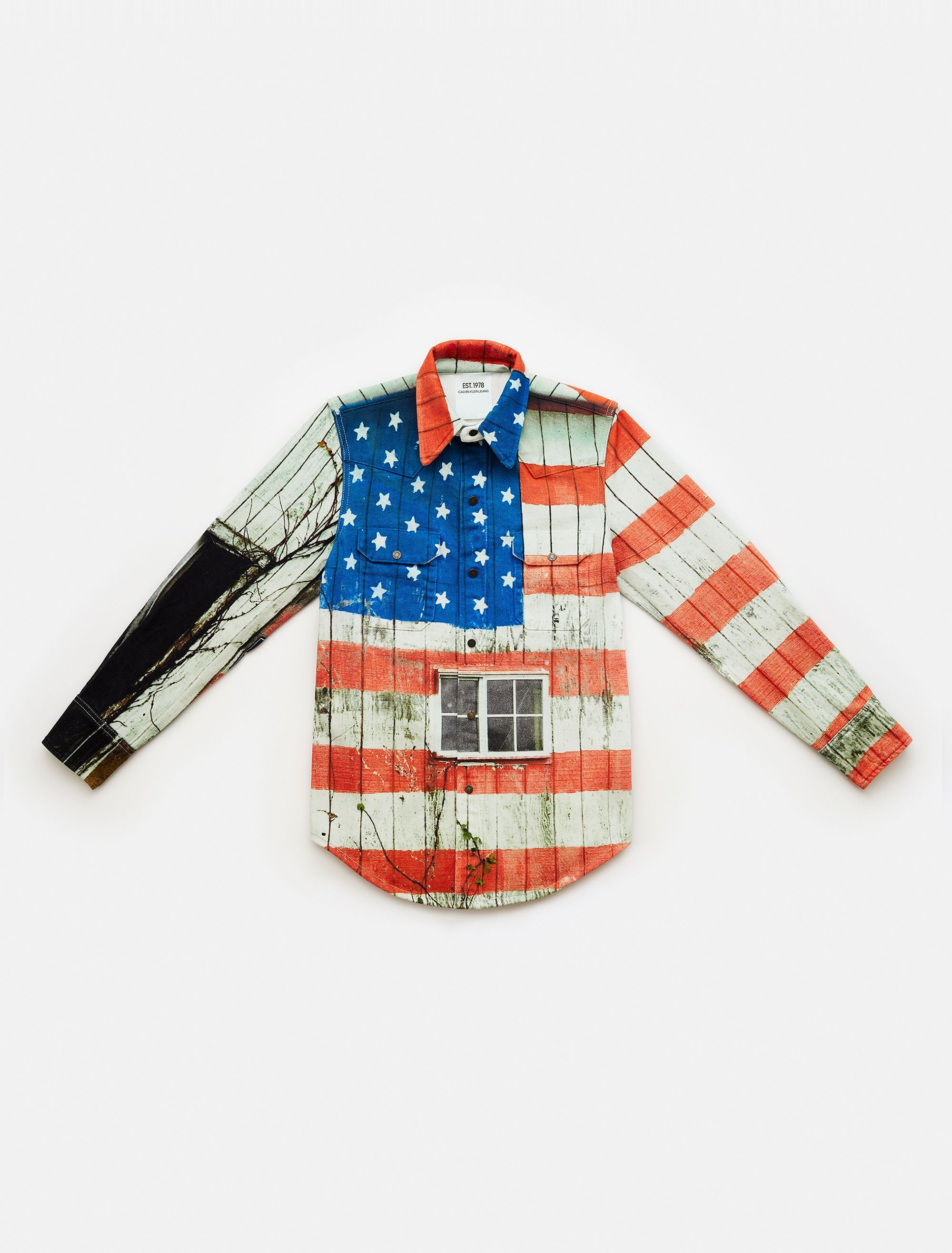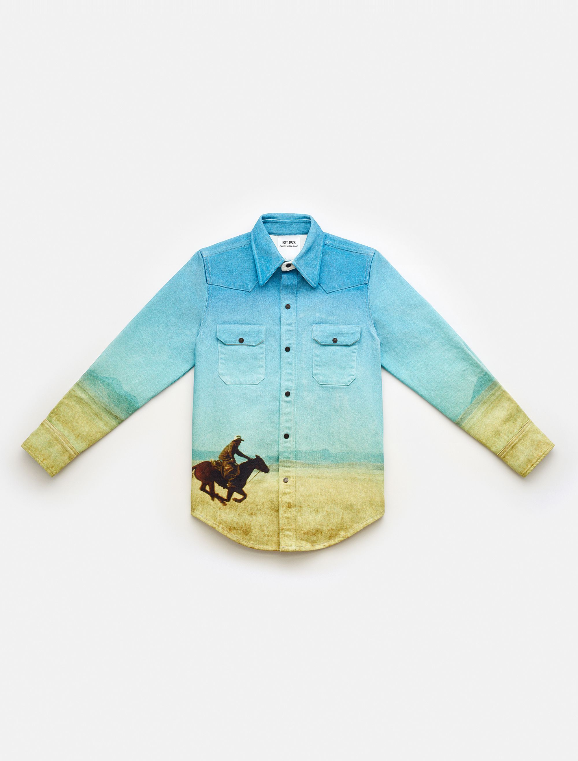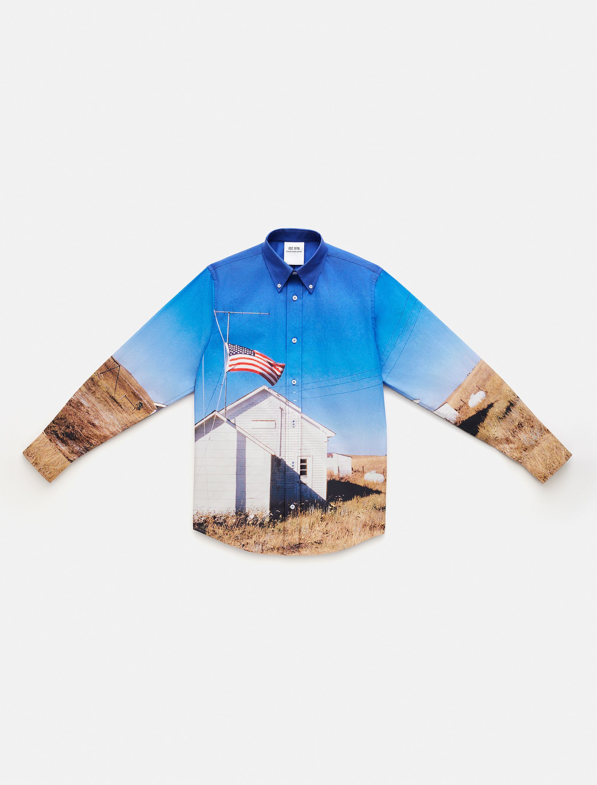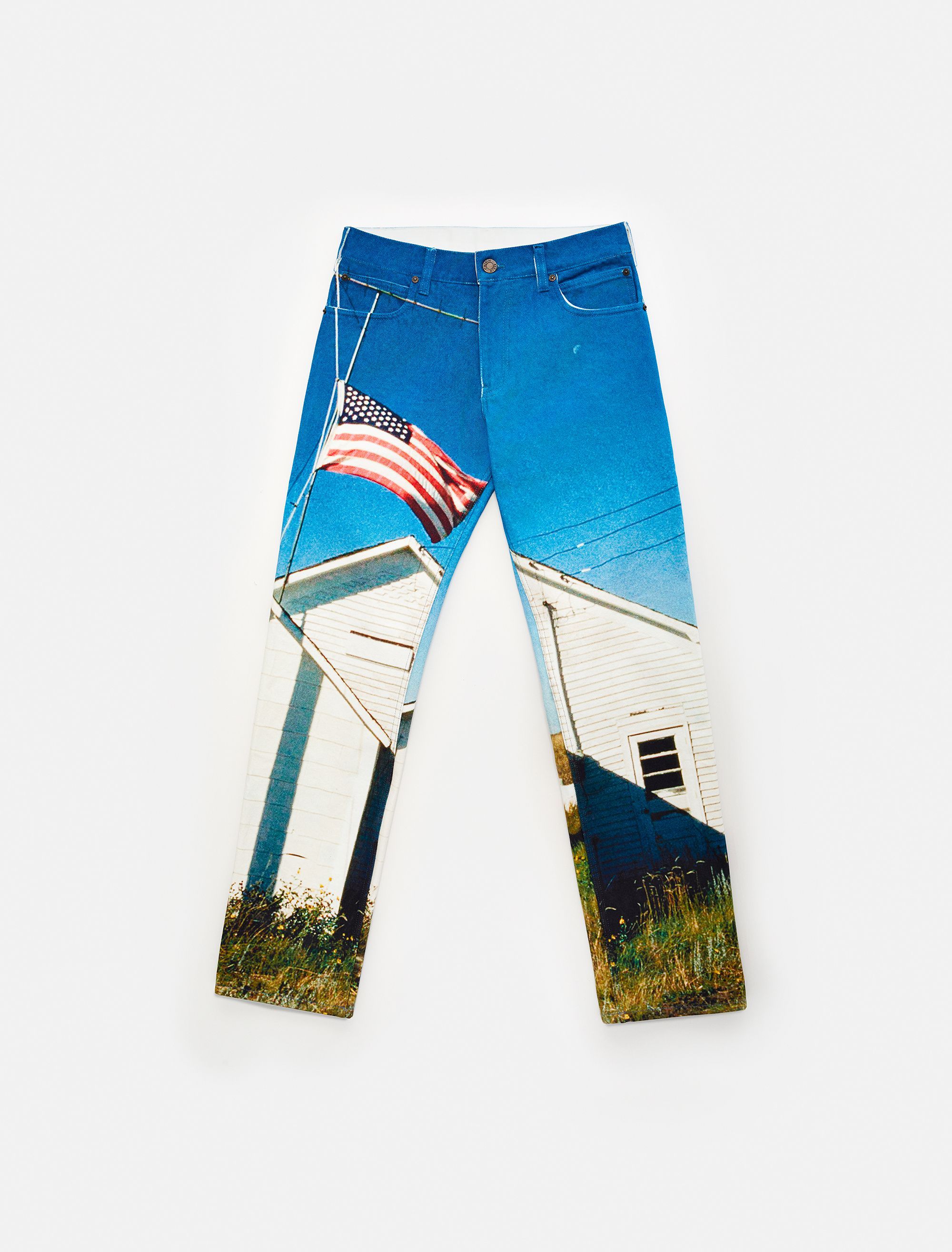 The collection looks to define a modern denim uniform, combining graphic elements and heavy use of Americana motifs. Based around clean-cut and essential unisex garments, t-shirts, jackets, tops, hats, boots, accessories and of course jeans, are adorned with American midwest inspired images and deconstructed logos to incorporate its rich past while giving it an updated contemporary edge. The denim pieces, are the standouts of the collection, and find new life in the impressive all over prints of landscapes, flags, and barns. The other icon of the range is the dense use of patterns taking reference in the photos of Brooke Shields, shot in the 1980s by Richard Avedon. Classic American motifs of stars and stripes, western landscapes, and white-headed eagles, become bold and evocative graphic prints through the fingers of Raf Simons.