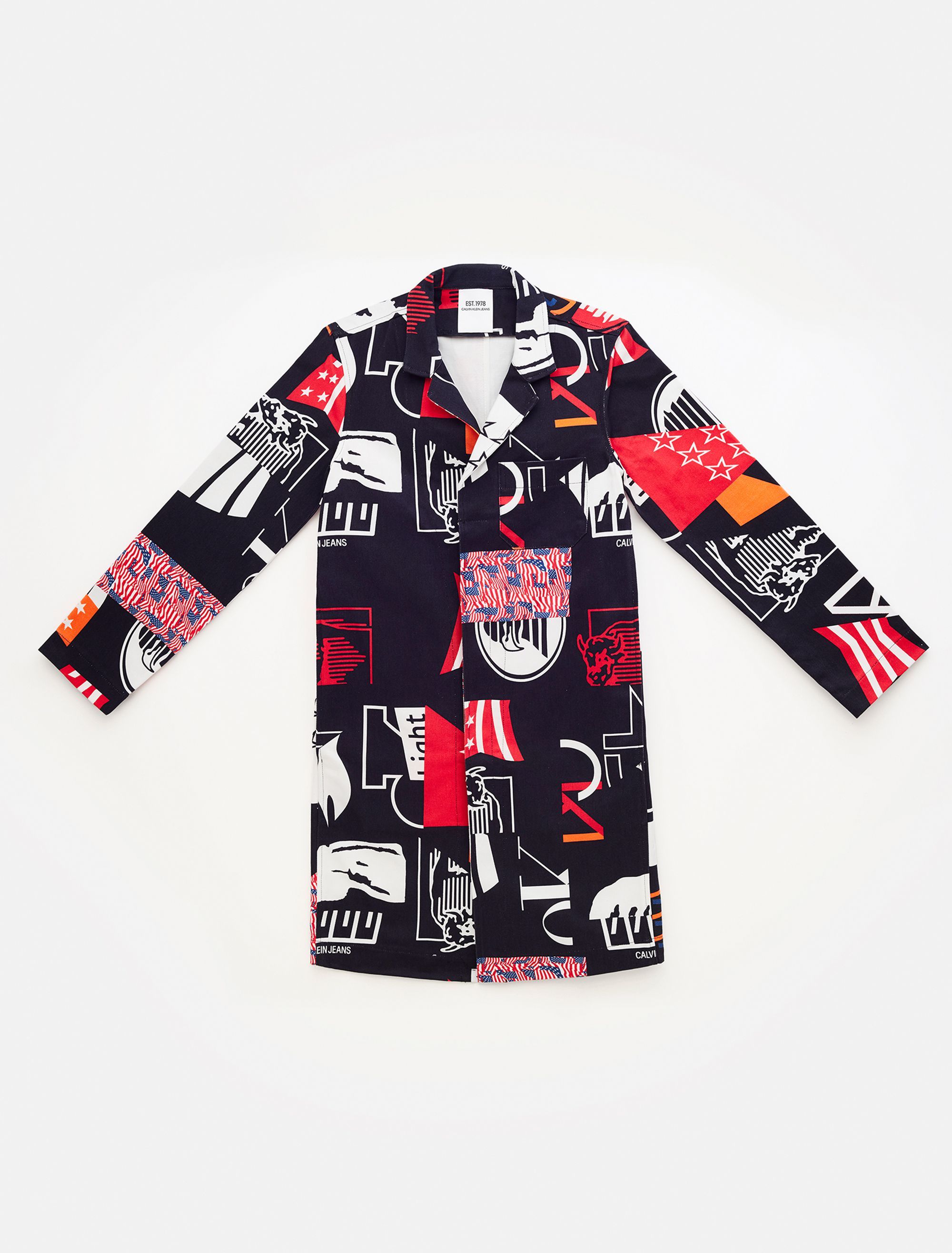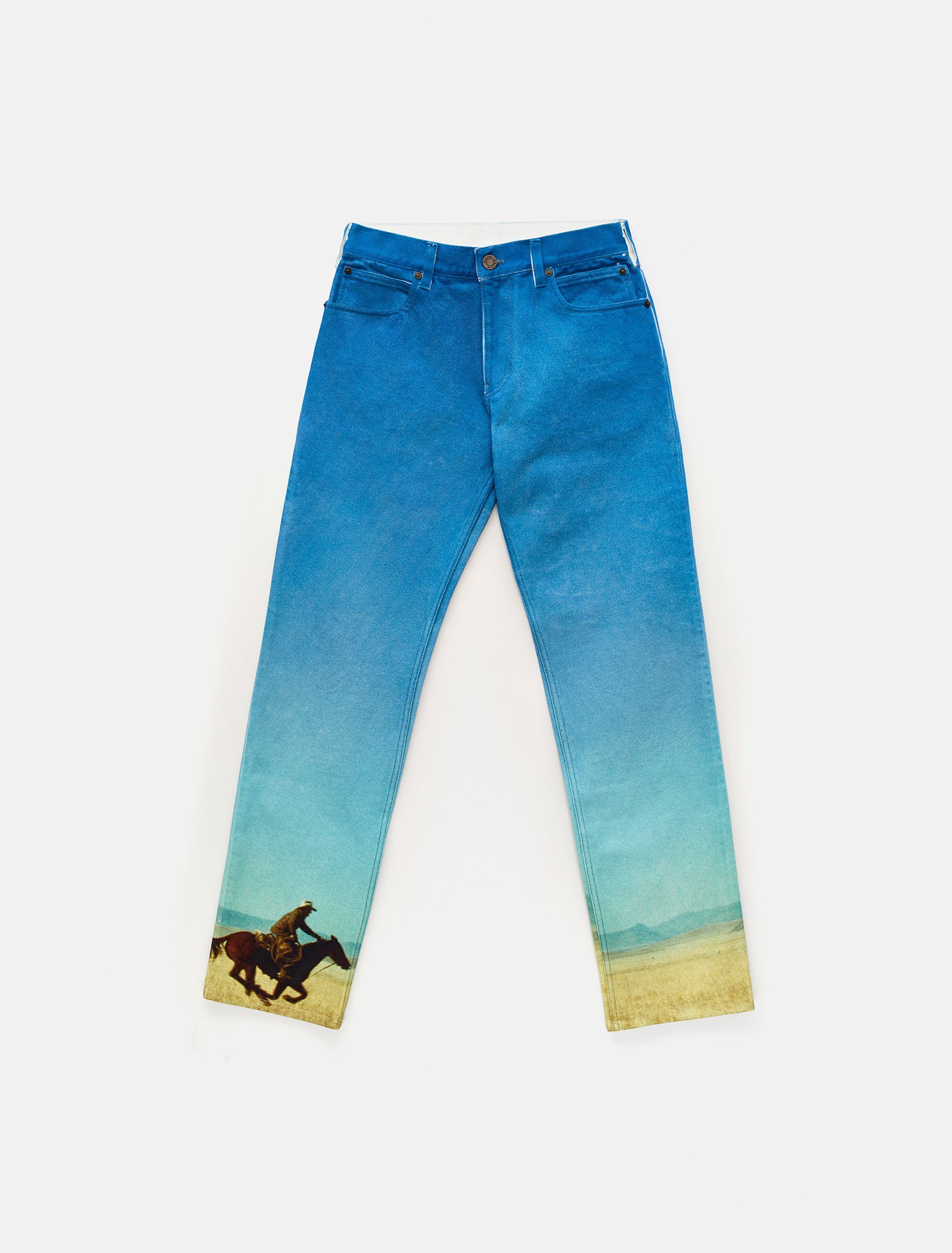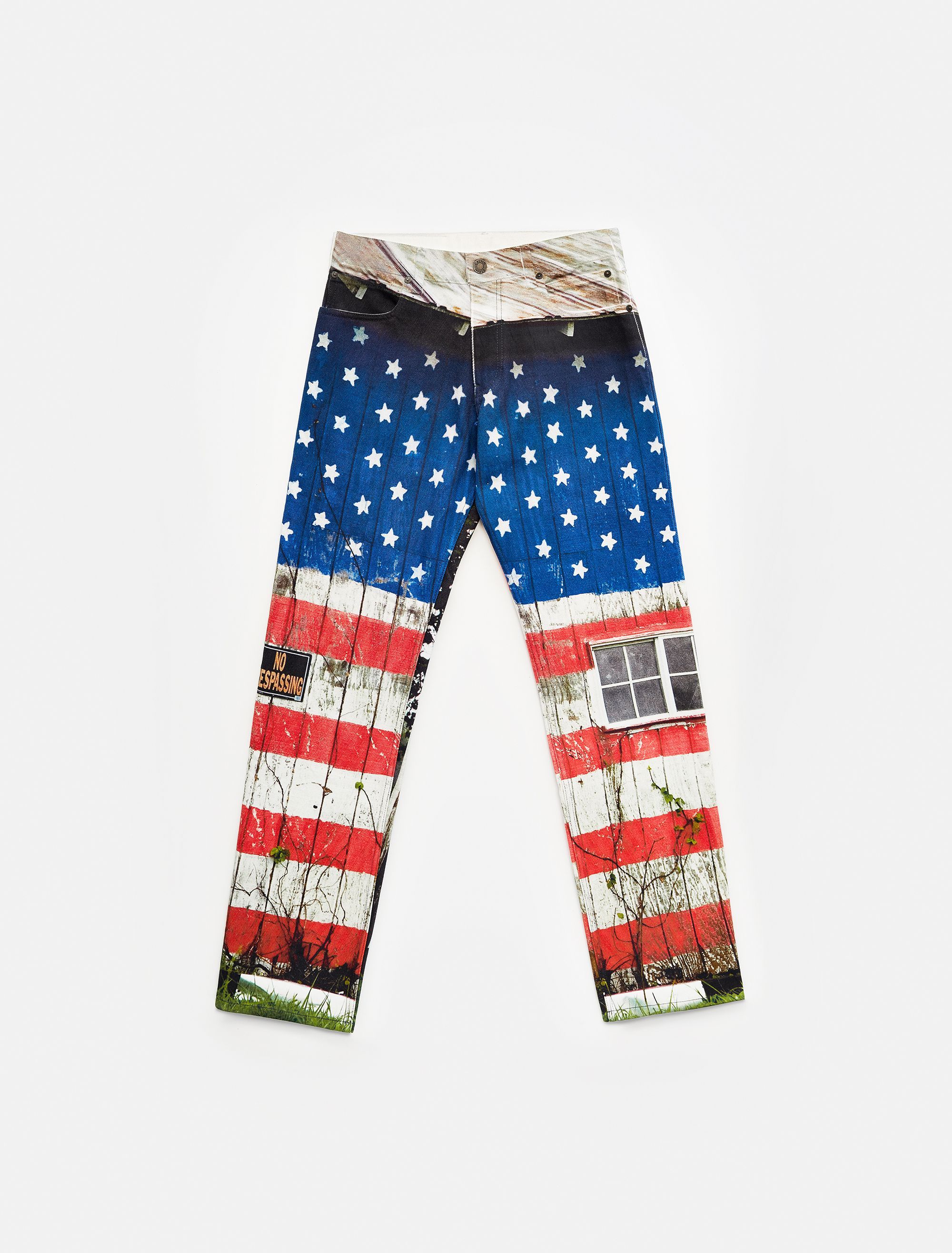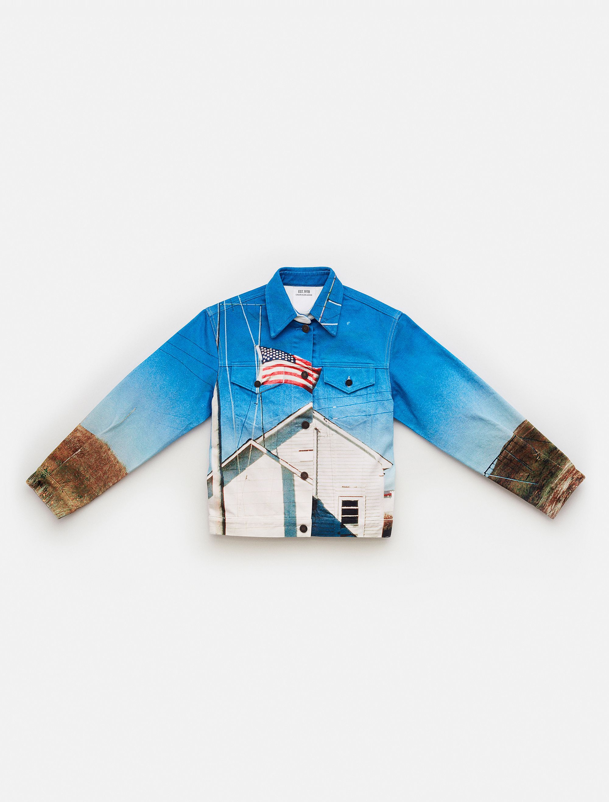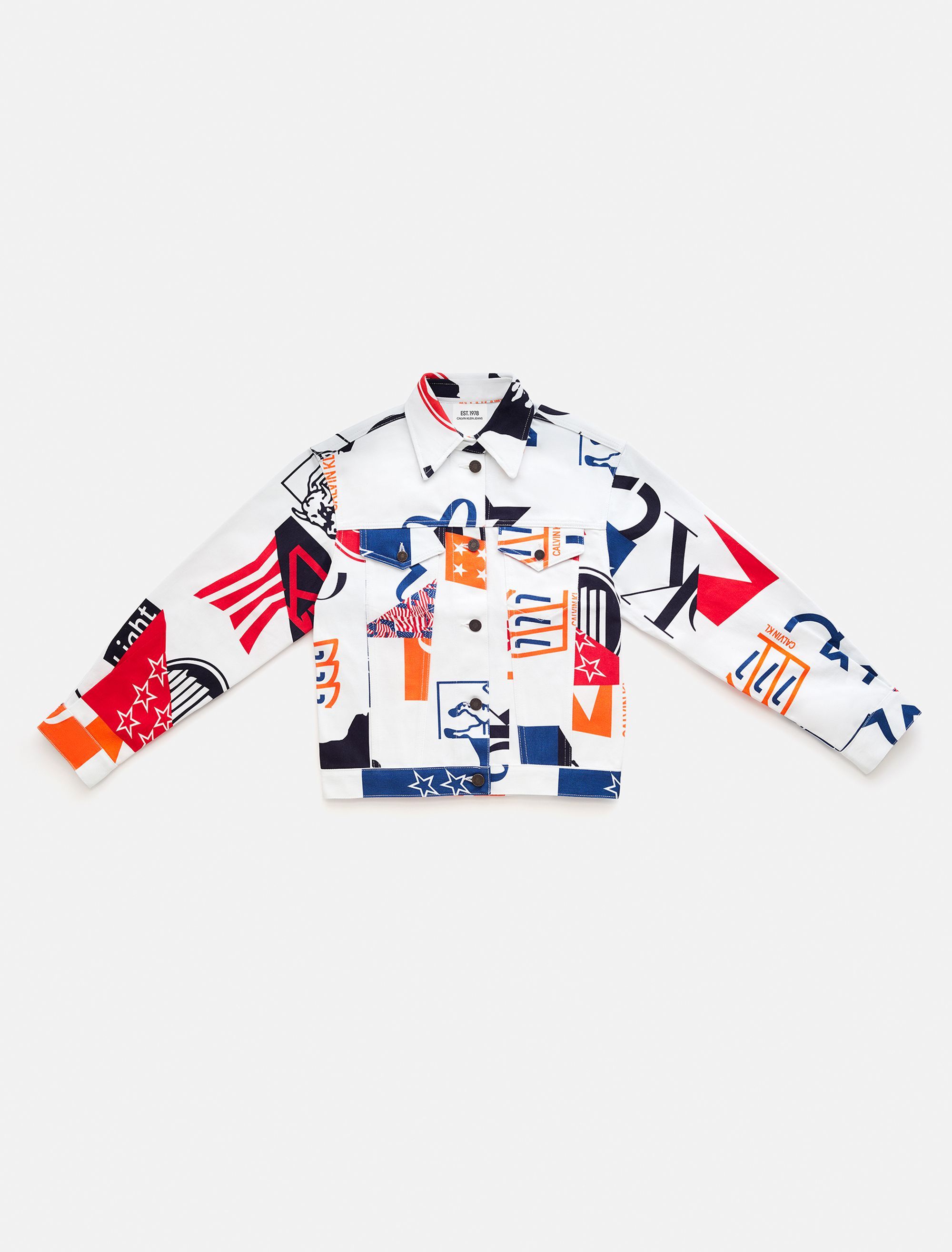 The collection looks to define a modern denim uniform, combining graphic elements and heavy use of Americana motifs. Based around clean-cut and essential unisex garments, t-shirts, jackets, tops, hats, boots, accessories and of course jeans, are adorned with American midwest inspired images and deconstructed logos to incorporate its rich past while giving it an updated contemporary edge. The denim pieces, are the standouts of the collection, and find new life in the impressive all over prints of landscapes, flags, and barns. The other icon of the range is the dense use of patterns taking reference in the photos of Brooke Shields, shot in the 1980s by Richard Avedon. Classic American motifs of stars and stripes, western landscapes, and white-headed eagles, become bold and evocative graphic prints through the fingers of Raf Simons.