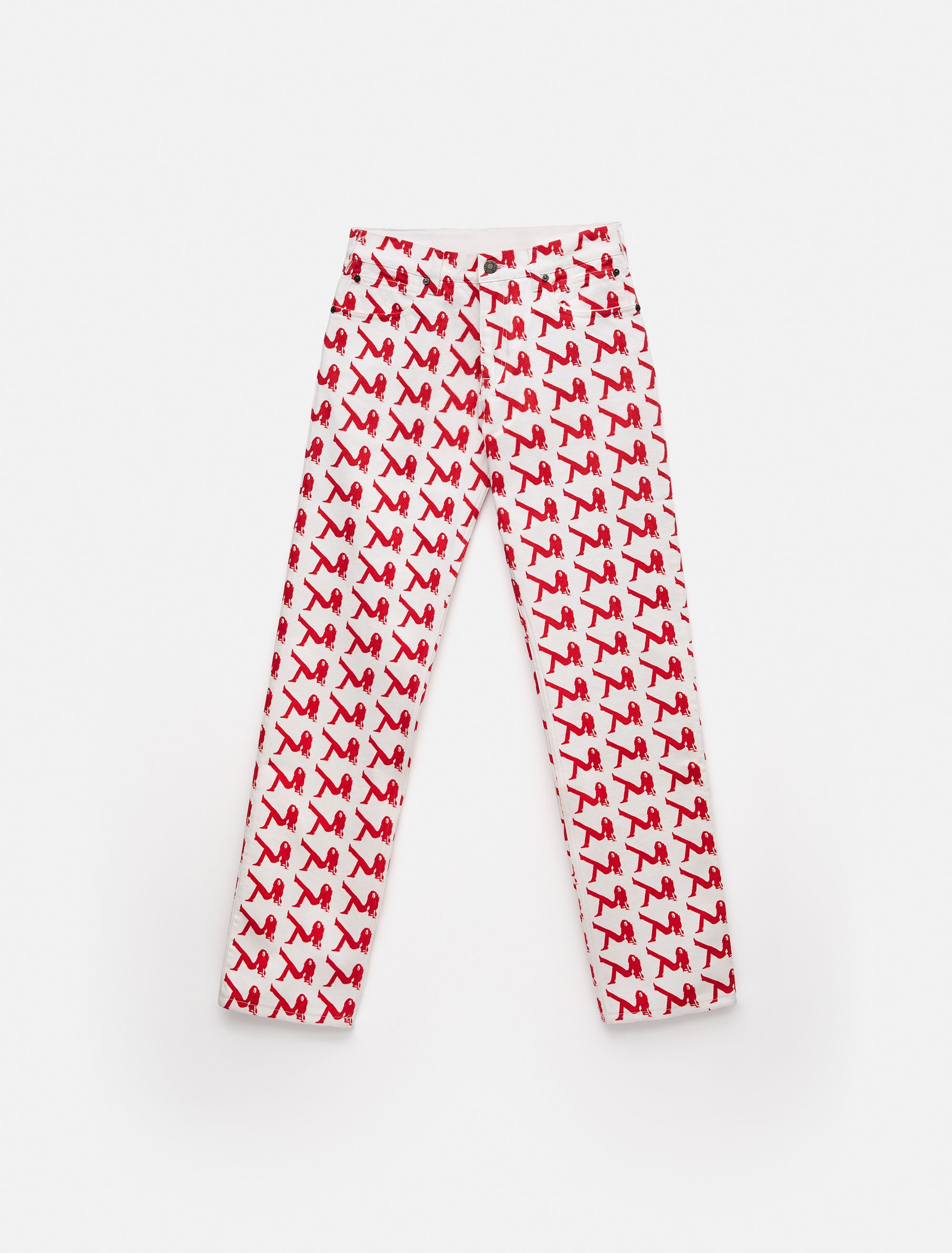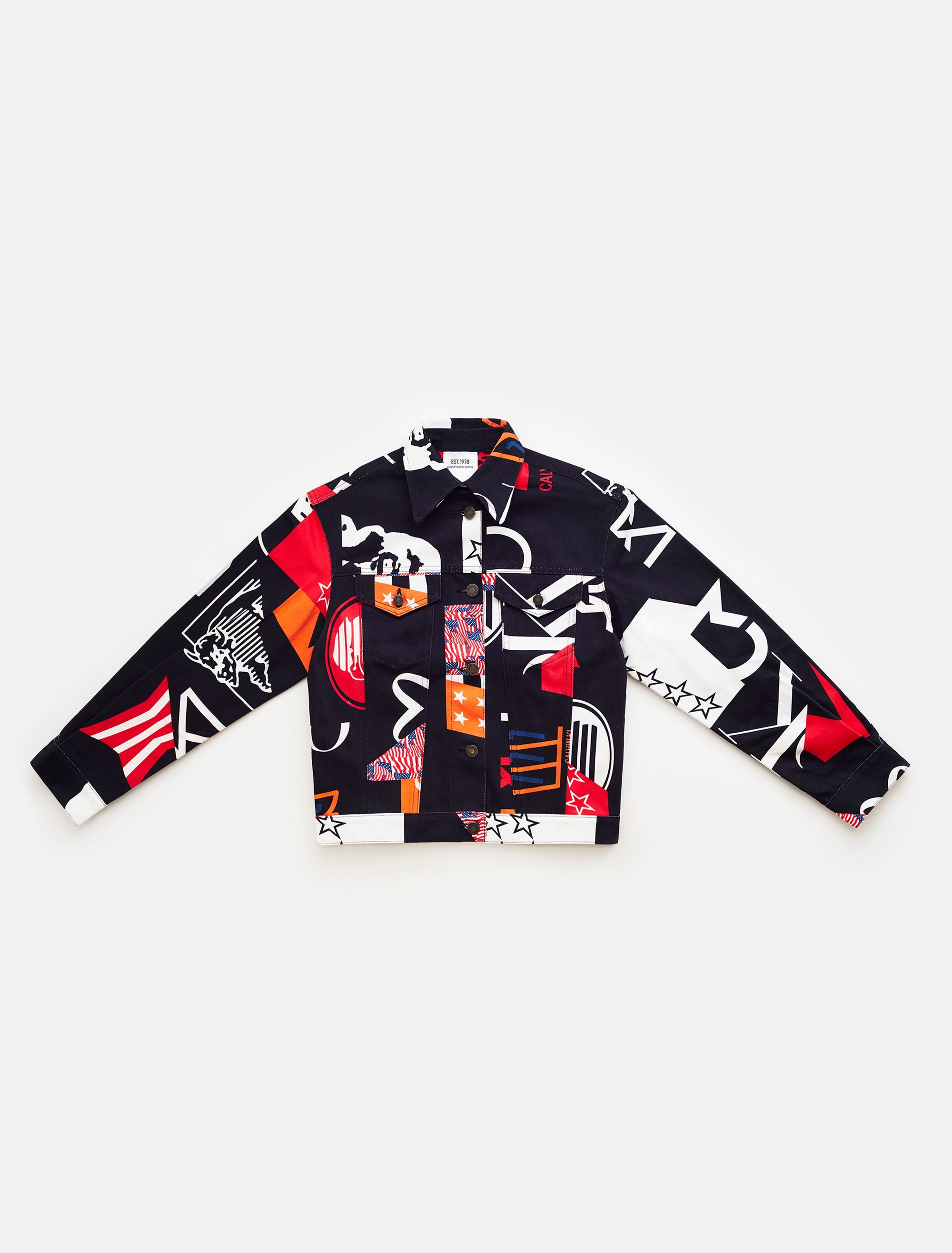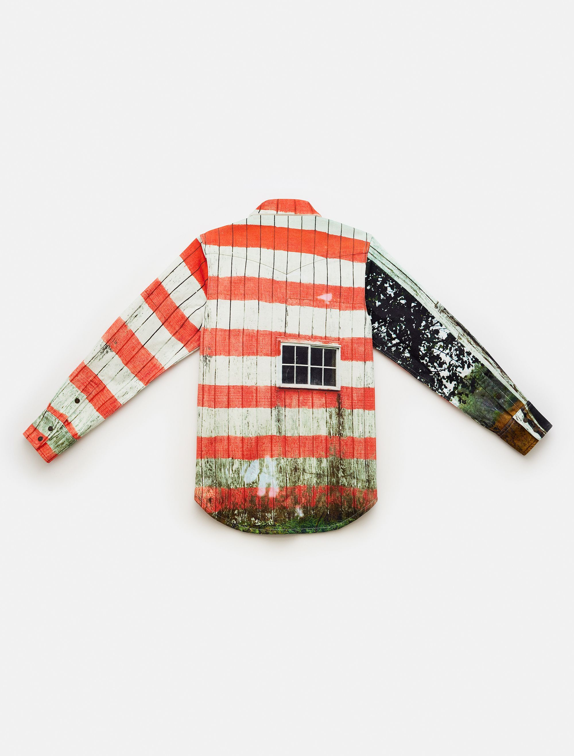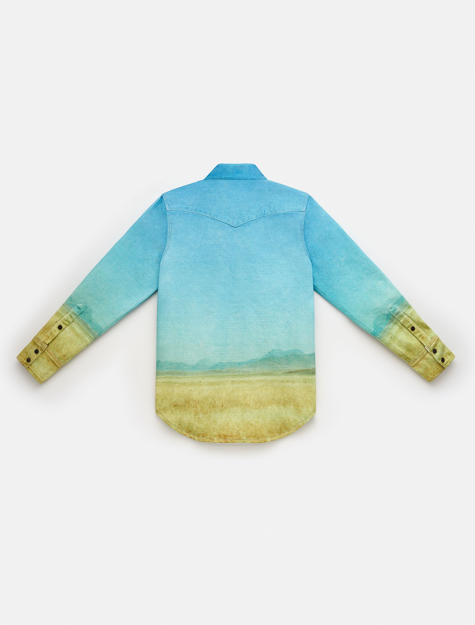 The collection looks to define a modern denim uniform, combining graphic elements and heavy use of Americana motifs. Based around clean-cut and essential unisex garments, t-shirts, jackets, tops, hats, boots, accessories and of course jeans, are adorned with American midwest inspired images and deconstructed logos to incorporate its rich past while giving it an updated contemporary edge. The denim pieces, are the standouts of the collection, and find new life in the impressive all over prints of landscapes, flags, and barns. The other icon of the range is the dense use of patterns taking reference in the photos of Brooke Shields, shot in the 1980s by Richard Avedon. Classic American motifs of stars and stripes, western landscapes, and white-headed eagles, become bold and evocative graphic prints through the fingers of Raf Simons.