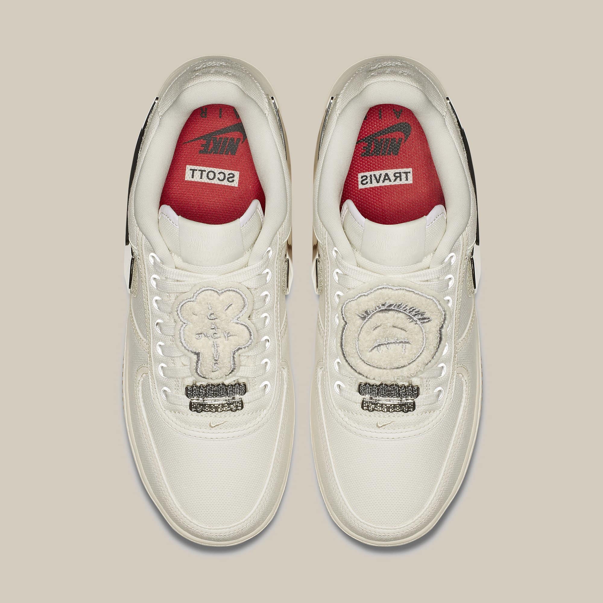 The silhouette remains similar to the OG White: Velcro Swoosh, Metallic and removable side swoosh, Nike Air on the heel sewn upside down, patches, reflective details, deubrè grills, and Travis printed on the inner sole.