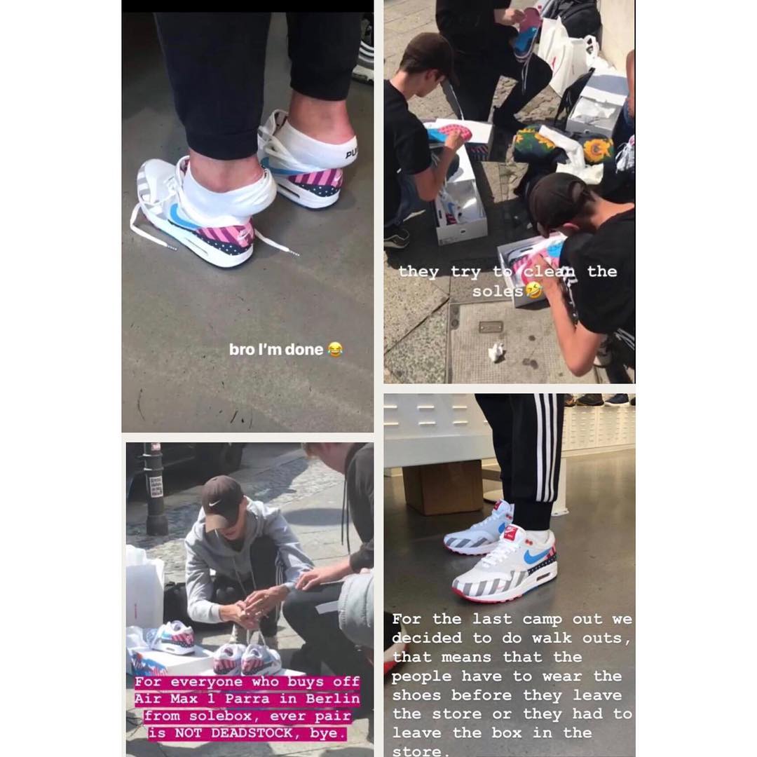 Reselling is becoming a bigger and bigger issue in our times, as limited availability of certain fashion items, particularly sneakers, has meant getting a hold of the most coveted sneakers drops has almost become impossible without an inside track, or paying big bucks on a sneaker reselling market. What earlier was a premise for streetwear, that it wasn't a luxury and available for the man on the street, has now permanently changed, and on certain levels started to mirror the unattainability of certain luxury goods, to the great dismay of many consumers. Berlin's branch of the sneaker store Solebox recently came up with an idea to fight this practice, that is both simple and ingenious in its premise. At the latest drop for the highly coveted Parra x Nike Air Max 1 sneakers, customers of the shoe were forced to wear them out of the shop, altering their pristine condition so as to limit its attractiveness for the second-hand market. Of course, for every rule, there are always those willing to try to break or bend it, and sharp-witted resellers started tiptoeing out of the store, to avoid creasing or walked out and immediately began cleaning them upon exiting the store.