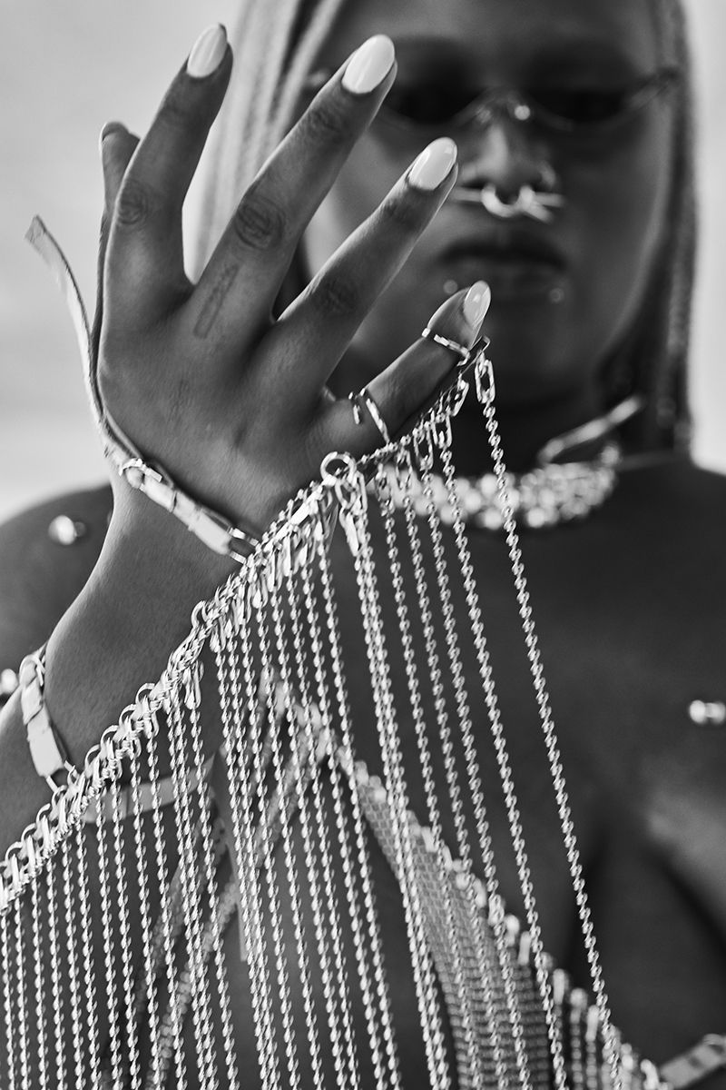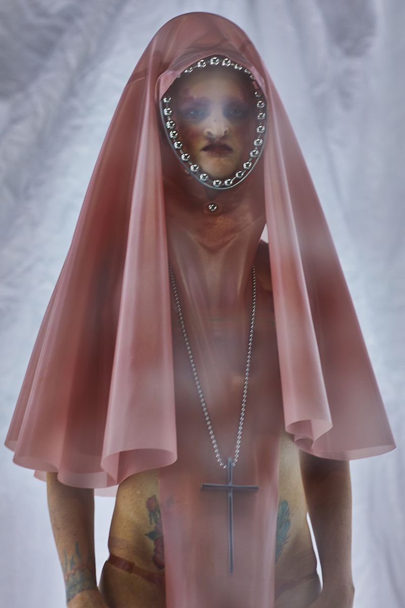 For his SS19 collection, entitled A Song of Lamentation for the Dead, Habana has joined forces with the brand Vex Clothing, bringing into life a unique combination of latex, rubber, chains, crucifixes, like the latex bodysuit decorated with a heavy cage-like chain. The aim was creating something new, fresh, different, almost otherwordly, combining for the first time jewelry and clothing. Inspired by the Met Gala exhibition Heaven Bodies, Habana wanted to change the clear sexual connotation of the latex, turning it into something almost related to celibacy: rose pink latex covers the head of a model wearing also a big crucifix. Pagan symbolism, which has always been part of Habana's imaginary, makes its comeback in this anniversary collection, as well as the gothic elements that have always distinguished him.
