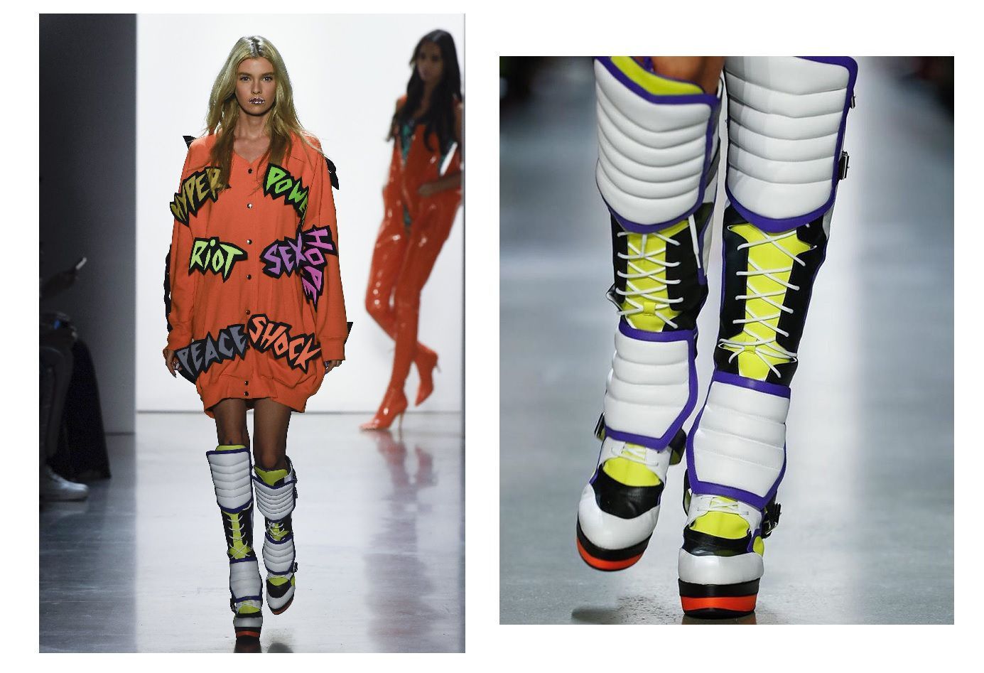 Going in chronological order, Jeremy this year decided to propose a collection inspired by the Jeremy of the 90s, when, by taking pictures to himself, he showed his extreme looks with eccentric make up and rebel rocker hair. A Mr Moschino like David Bowie decided once again to dare with strong colors and sexy looks but the concept of "daring" got out of his hands when he designed these boots. A crazy fusion between a Nike Air Mag and Moon Boot.