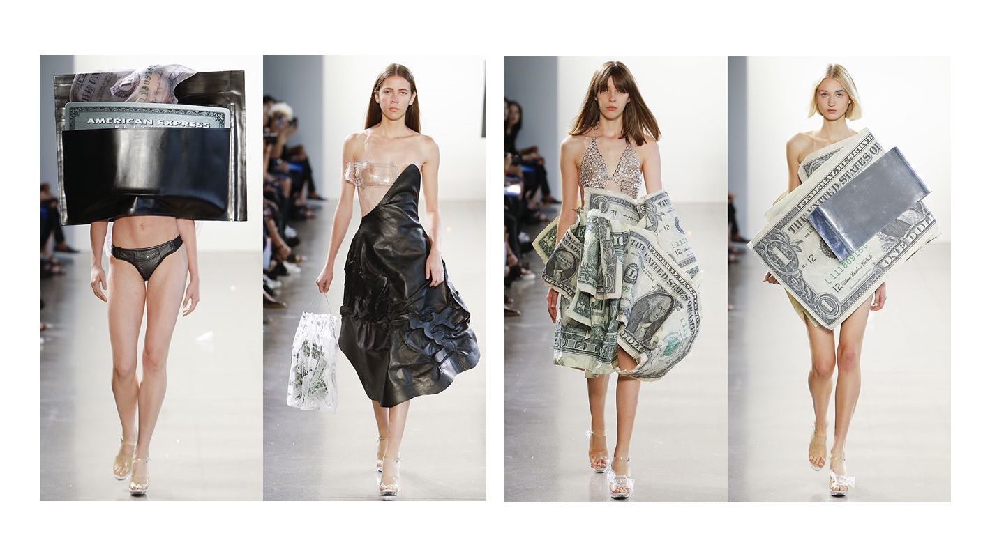 This brand made its debut with its first collection at the Parsons MFA Show 2018 and, as one could expected, has captured everyone's attention from the moment it decided to show off models wearing only money and credit cards. Is it a social complaint? A fight against the system? Perhaps, but relying on the statement issued on the IG profile, the brand aims to "[redefine] the American currency by transforming its value into a clothing system". A catwalk you don't see everyday.