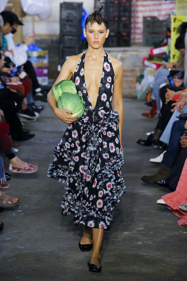 Covent Garden fruit and vegetables market was transported onto the catlwalk of the young designer. Edie Campbell and Adwoa Aboah walked the show with quite debatable items. Just think of the lettuce-bag...