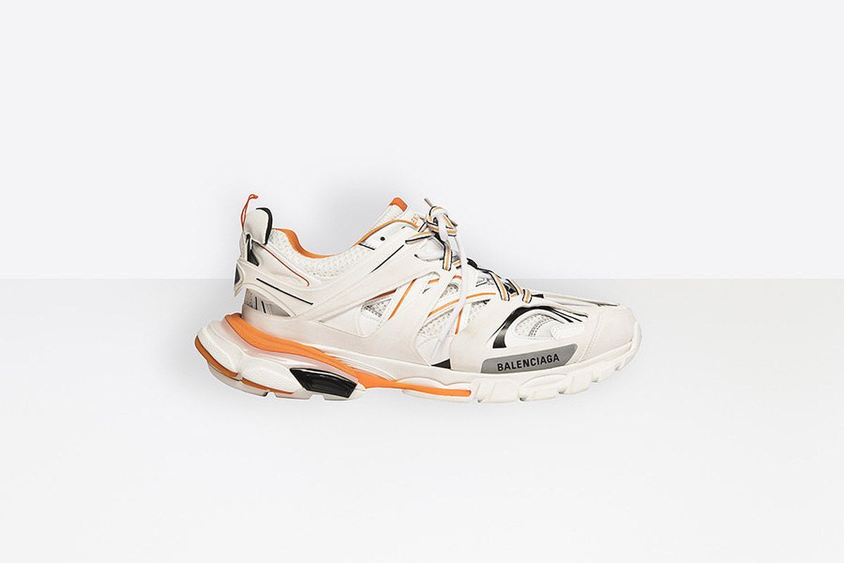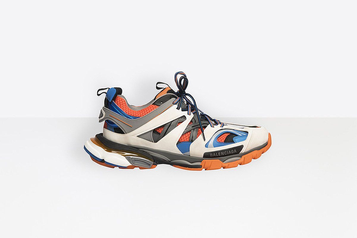 After the great success of both the sleek Sock Runner and chunky Triple S sneakers, Balenciaga today releases the next step in their evolution of sneaker designs, the Track High Tech Sneaker. With fashions current trend of more technical and outdoor gear influencing designs, this new clearly trekking boot inspired silhouette, with panels and reinforced sole, shows off Balenciaga's take on the trend for a more rugged technical shoe. The Track shoes have been drip dropping over the last month at special events, but today sees the shoe available for a wider release worldwide. Available in five colorways, in orange and blue, blue and green, yellow and grey, white and orange, and in all black.