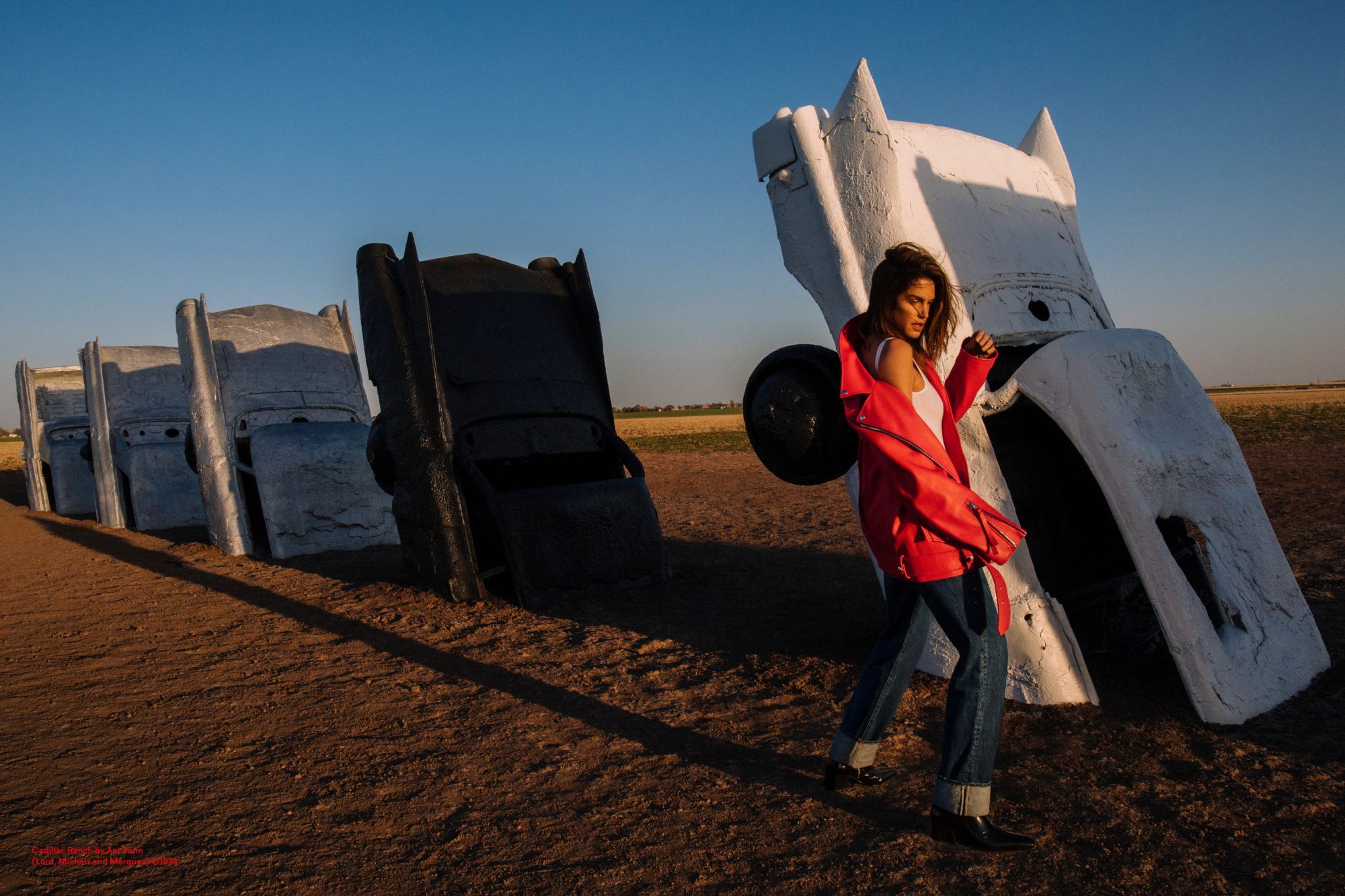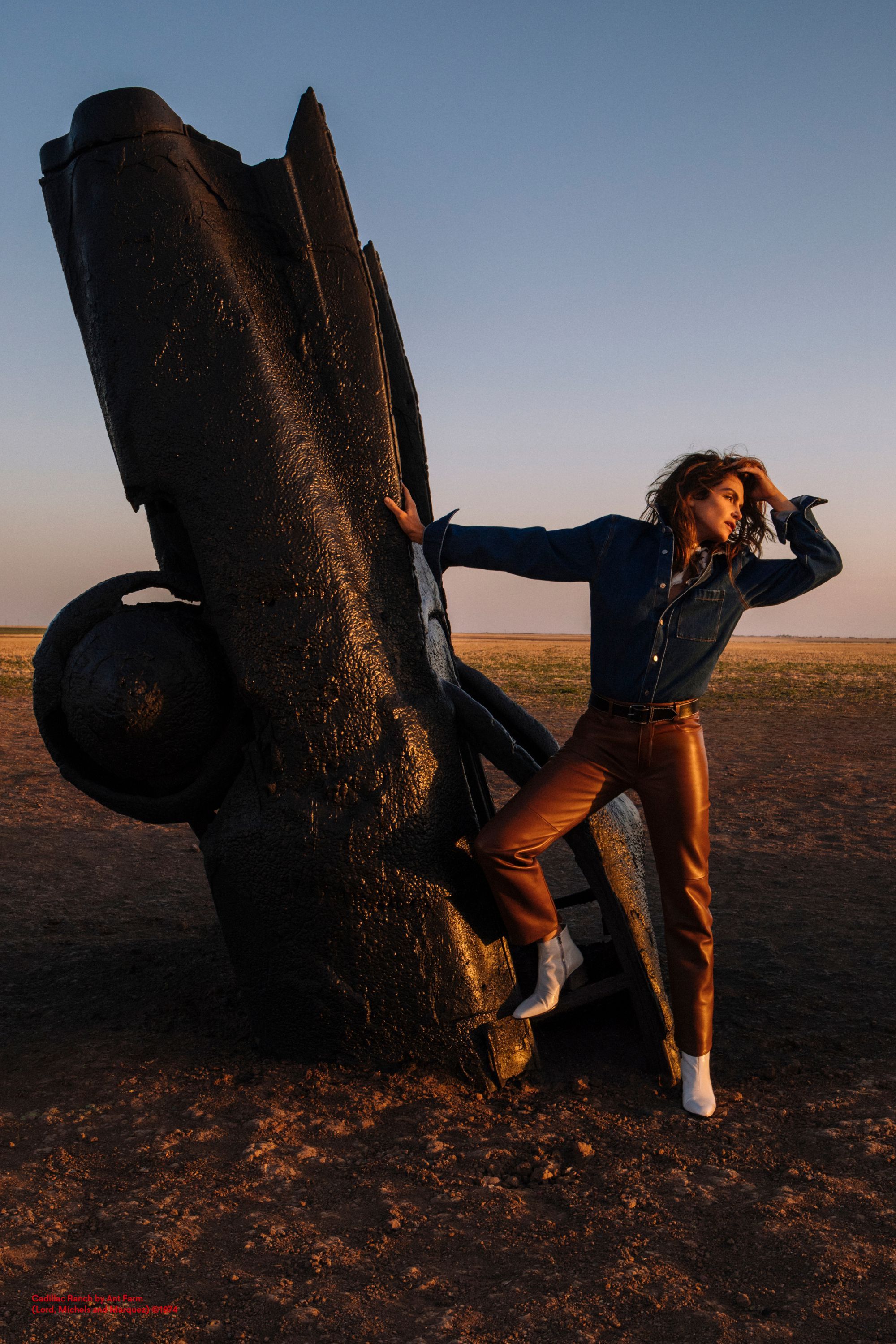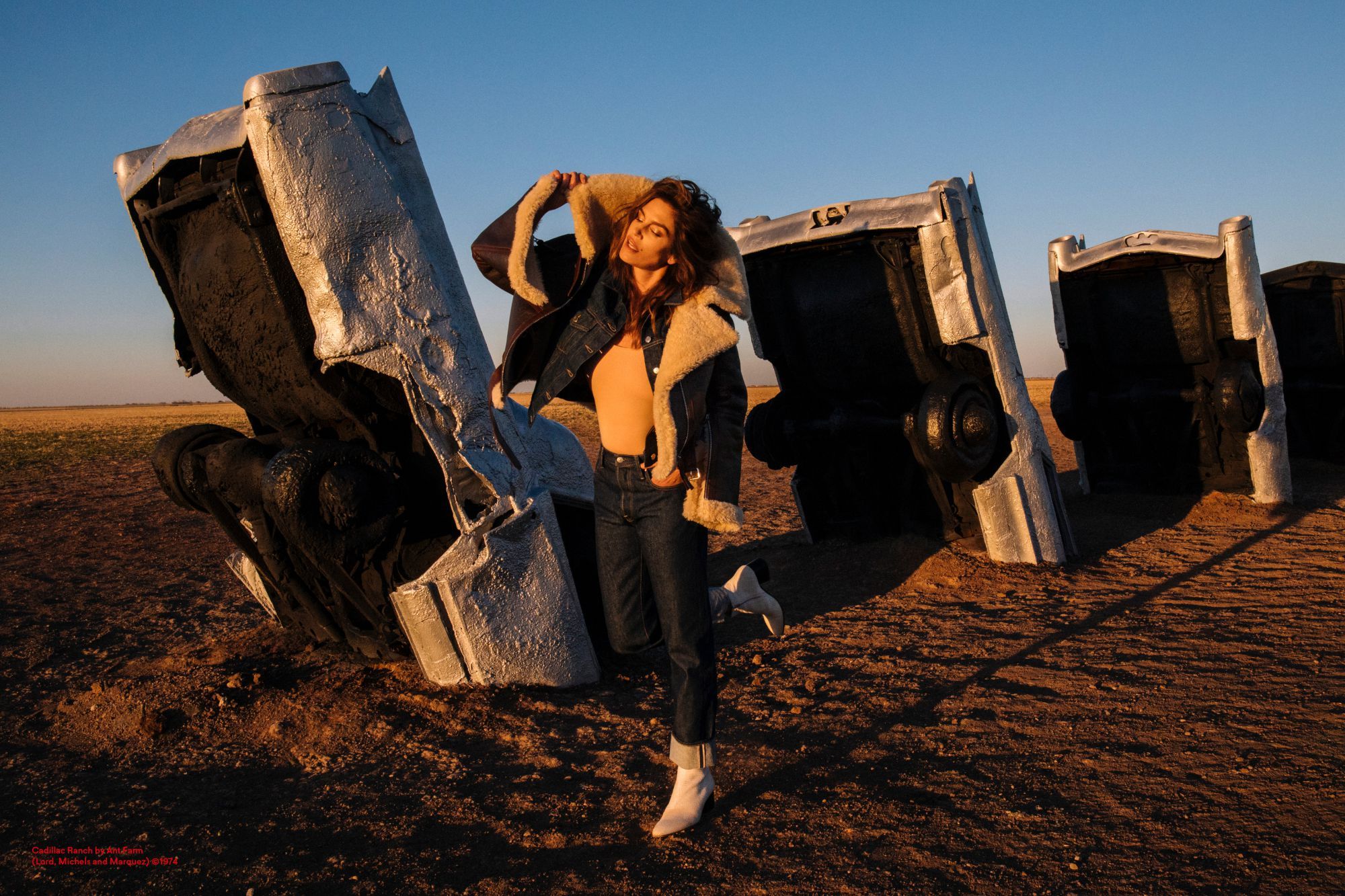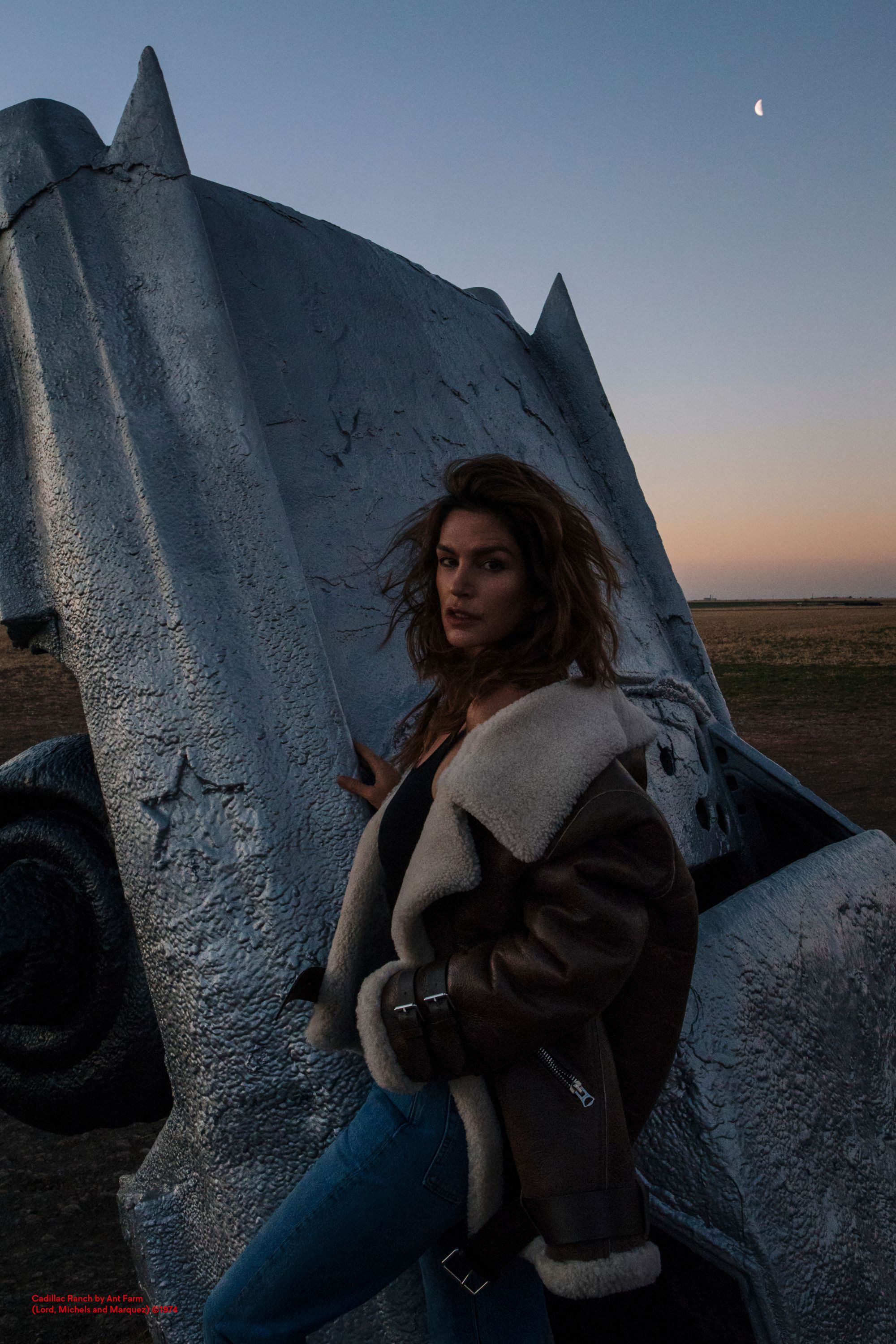In front of the goal of Sam Abell, famous for his long collaboration with National Geographic, Cindy wears a re-edition of the first jeans made by Acne Studios in 1996 (and in 1997 in the women's version), a 5 pockets in high-waisted denim with regular fit from the waist to the ankles. Beautiful, kick the air and pose with boots and cowboy hat, while behind him the sunset lights the cars buried halfway in the ground, totem of an American dream that the model embodies to perfection and part of the installation of land-art Cadillac Ranch, created in Amarillo, Texas, by architect Ant Farm in 1974. An iconic set. An iconic jeans. An iconic model.