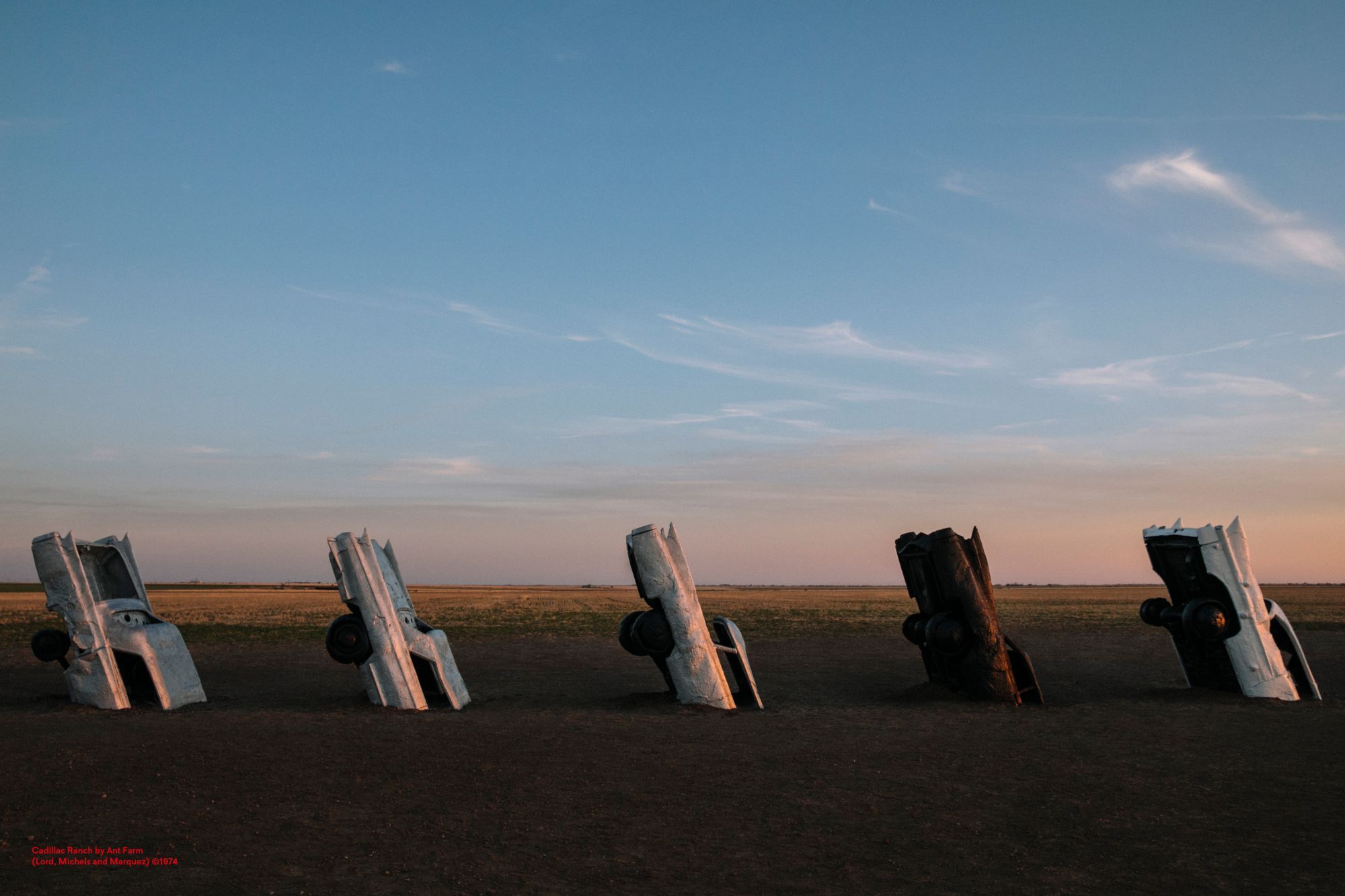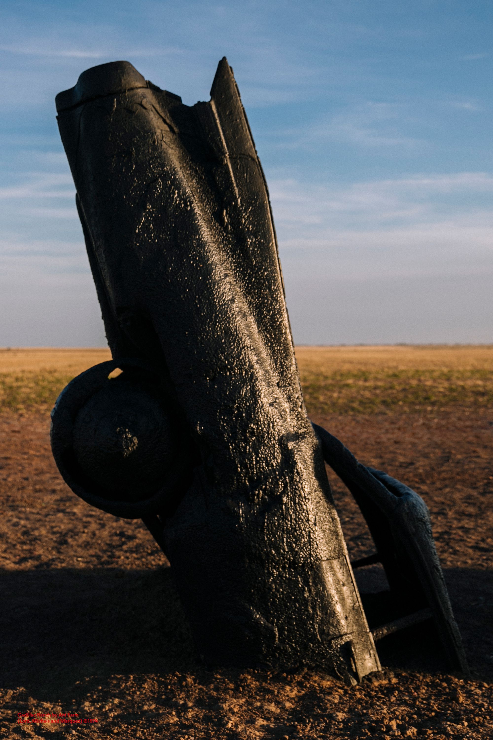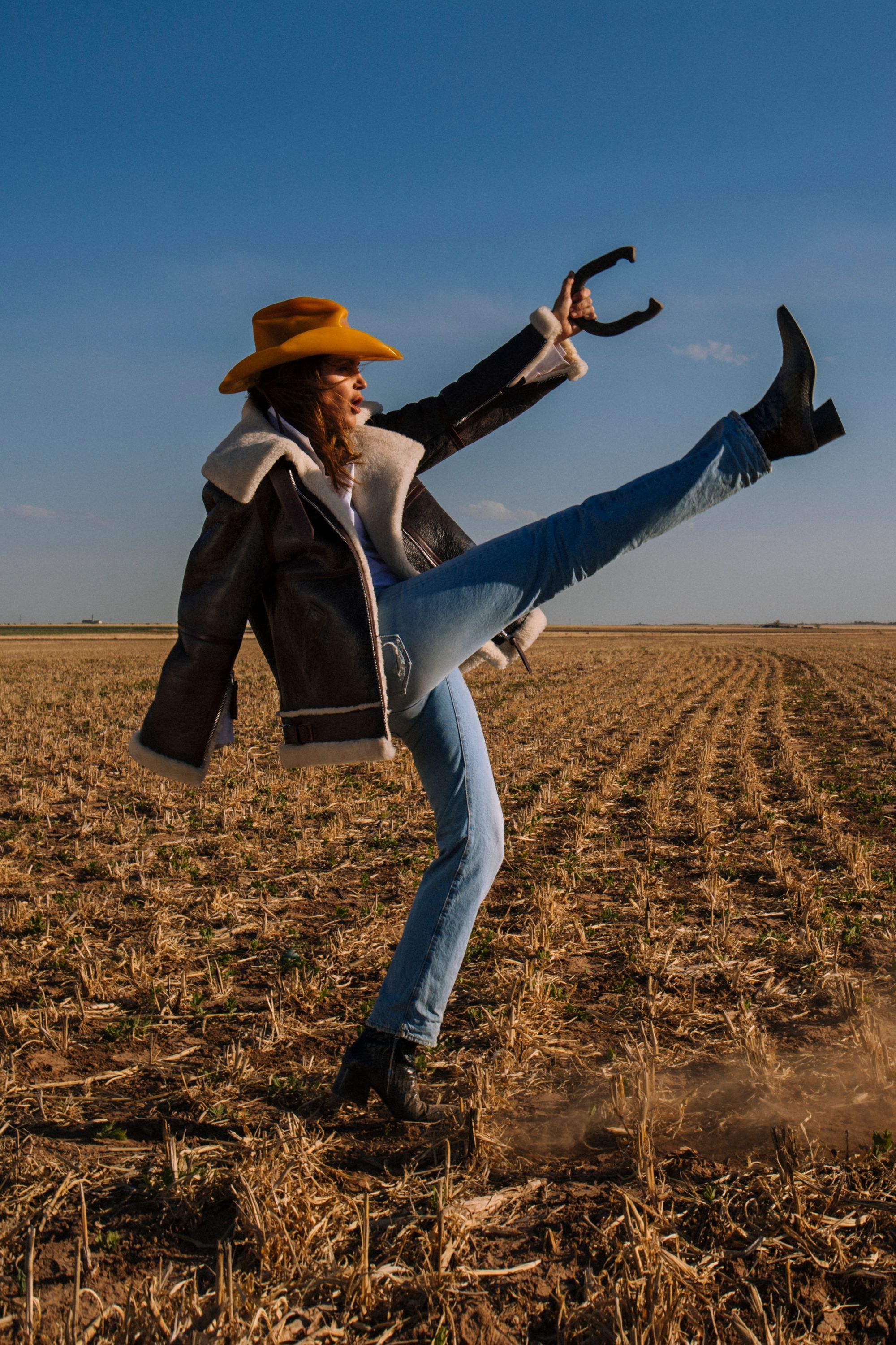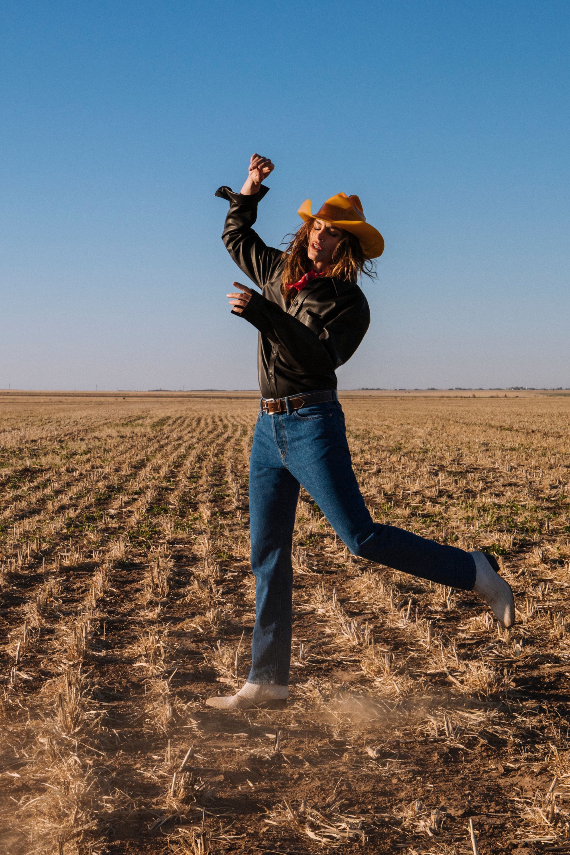 In front of the goal of Sam Abell, famous for his long collaboration with National Geographic, Cindy wears a re-edition of the first jeans made by Acne Studios in 1996 (and in 1997 in the women's version), a 5 pockets in high-waisted denim with regular fit from the waist to the ankles. Beautiful, kick the air and pose with boots and cowboy hat, while behind him the sunset lights the cars buried halfway in the ground, totem of an American dream that the model embodies to perfection and part of the installation of land-art Cadillac Ranch, created in Amarillo, Texas, by architect Ant Farm in 1974. An iconic set. An iconic jeans. An iconic model.