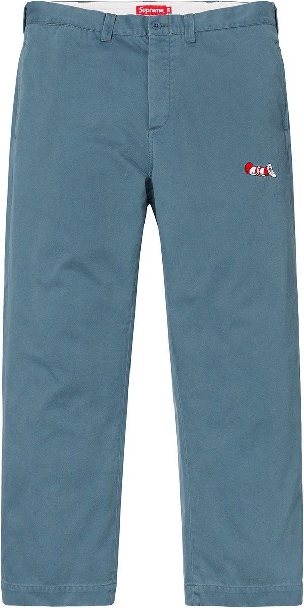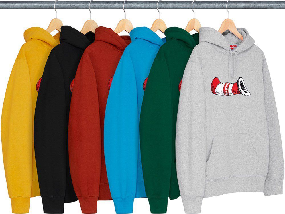 It's that time again, tomorrow sees the 7th drop of the Supreme FW season. Beyond the usual full wardrobe pieces of jackets, hoodies, sweatshirts, long sleeves, t-shirts, pants and headwear, there are some fun and exciting collabs coming this week. So let us start with the fun, beloved childhood character Dr. Seuss’s, Cat in the hat becomes streetwise in his feature on select tops, bottoms and, of course, hats. The standout piece this week is the Champion collaborated Hooded Satin Varsity Jacket coming in four different colorways. Then theres the hyped collaboration with Vans with their special edition Supreme/Vans SID Pro’s coming in red, black, purple and a spotted colorway. The wild card this week is the Chain License Plate Frame coming in gold or silver editions.