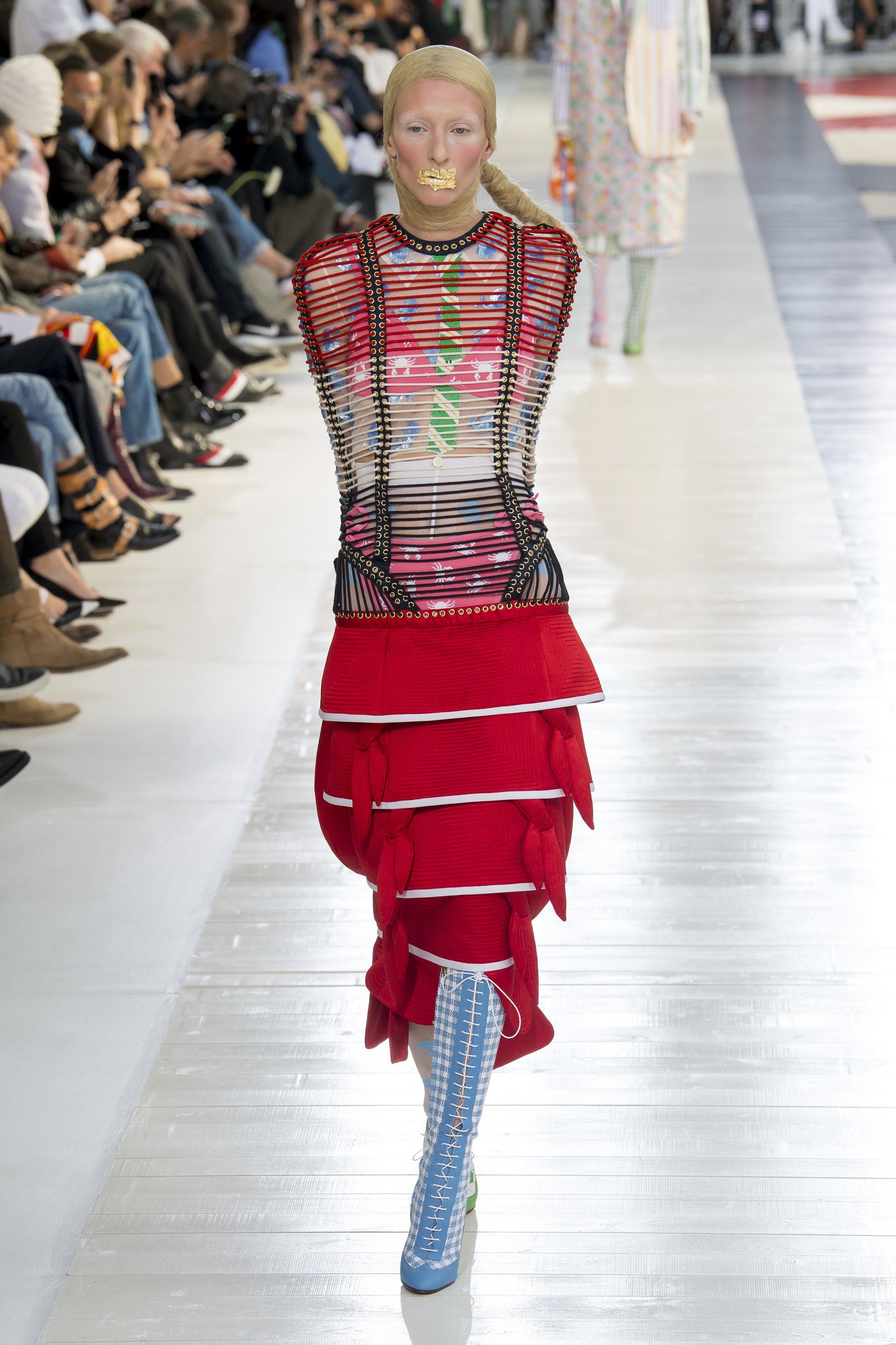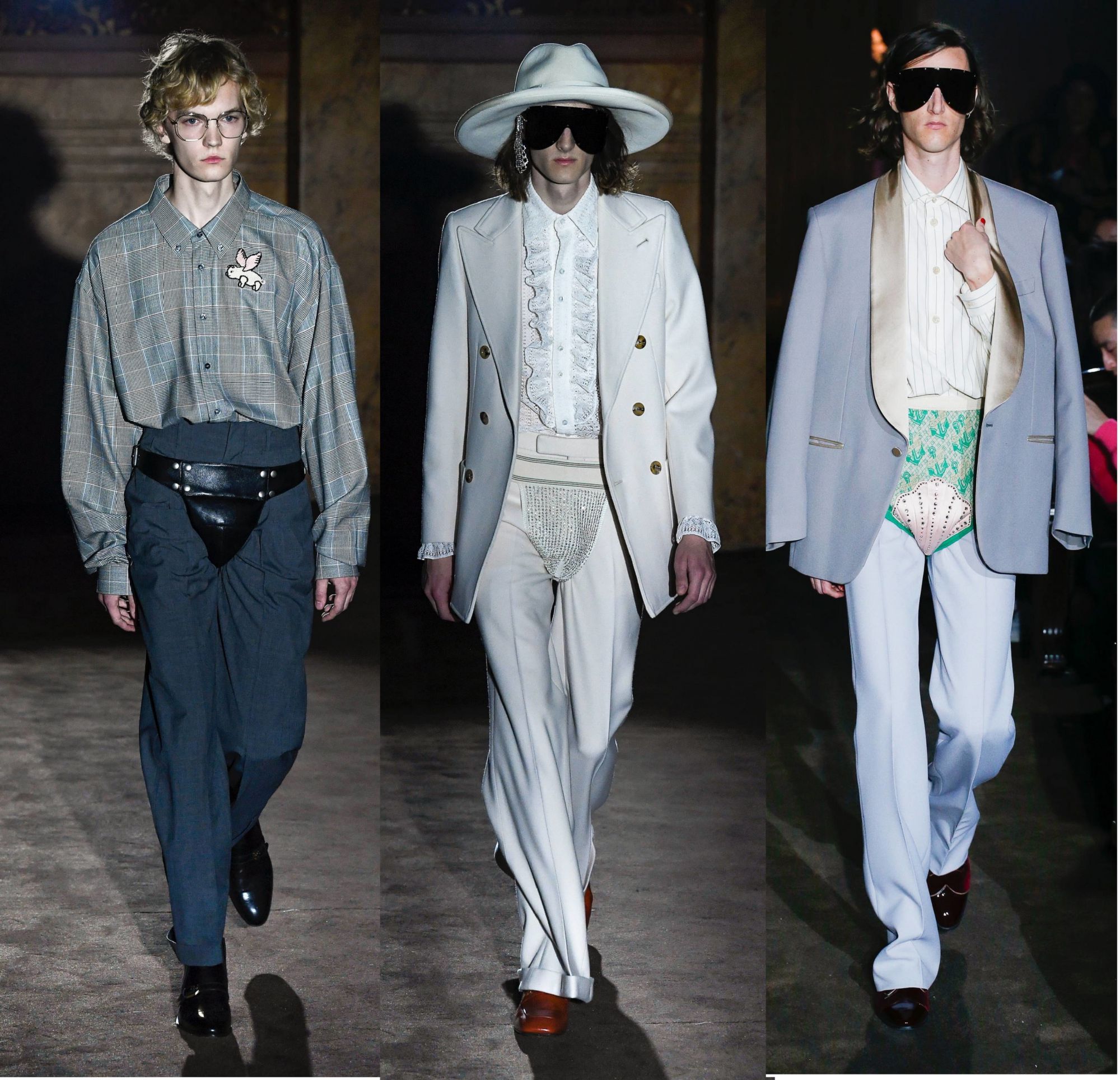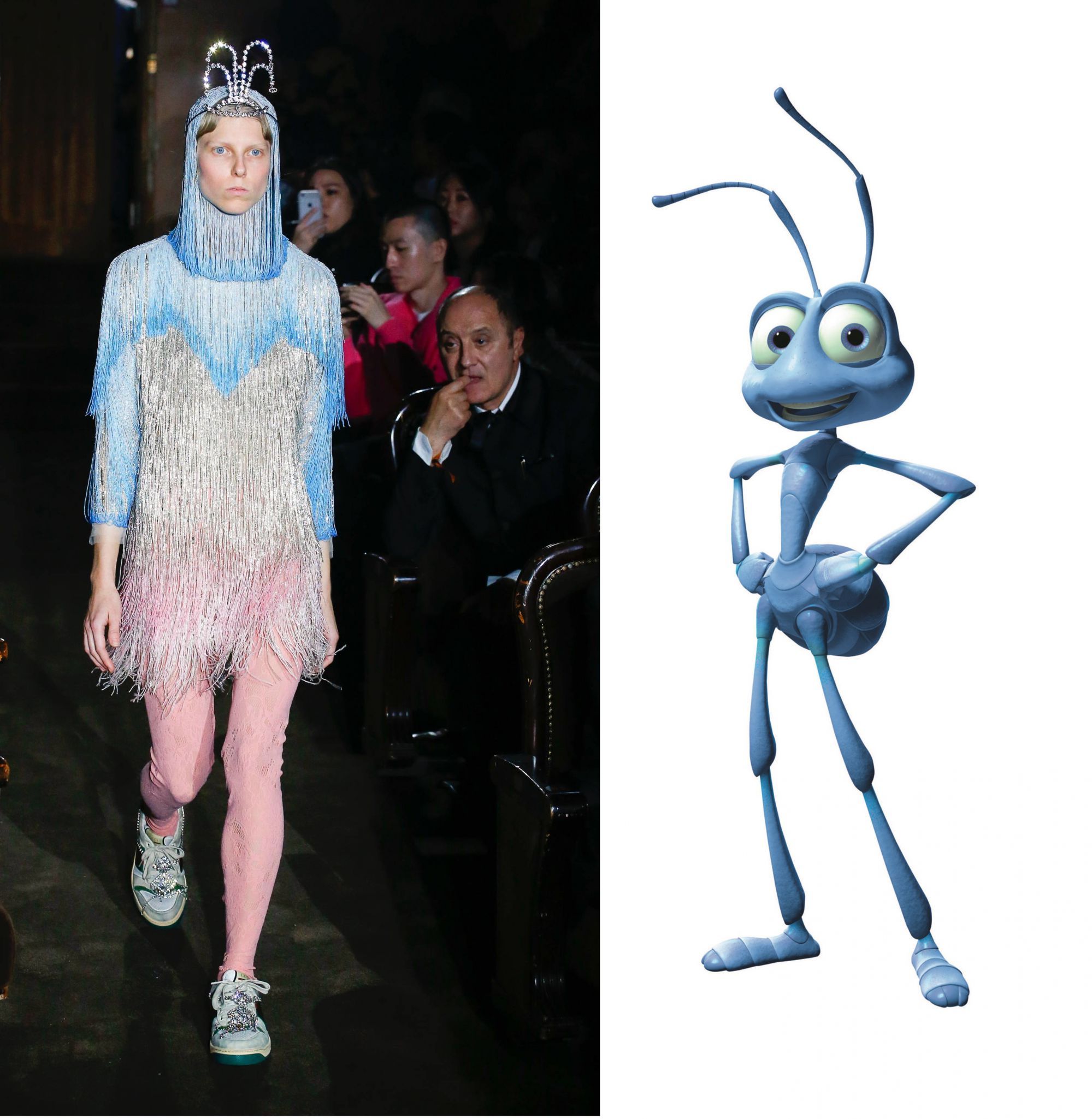 Alessandro Michele has accustomed us to strange, schizophrenic Gucci collections, but this season the penitent case is a shell used above the men's tights to cover the private parts, wins the prize as a most bizarre accessory. An honorable mention also goes to the dress that reminds of a character from A Bug's life.
