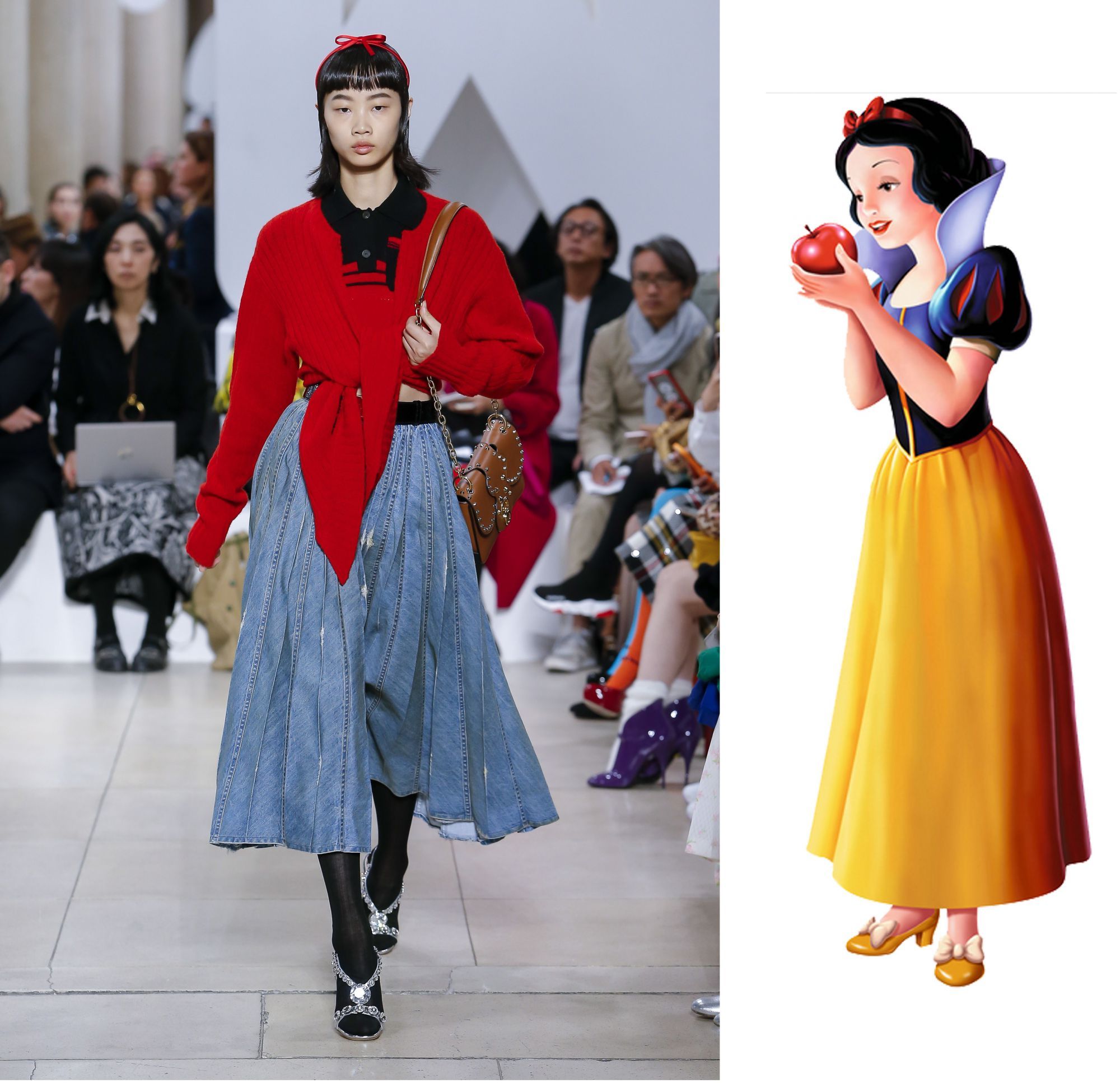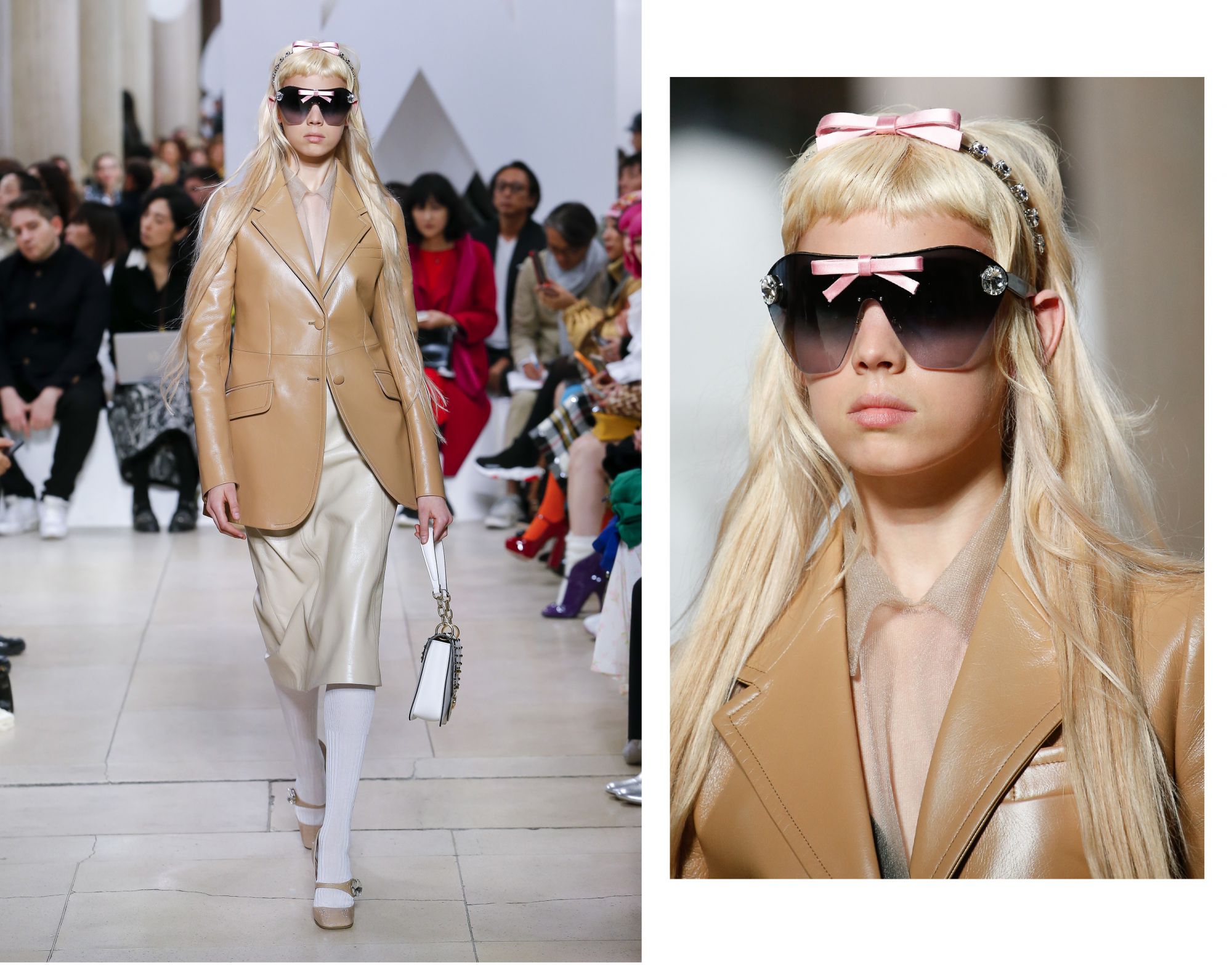 When we say a hot as hell fashion show... Miuccia brings onto the catwalk a eulogy of the Project Runway style imperfection, made of leather garments, fabric drapery reminiscent of a flower corolla, crystal-covered headbands, sandals with knee-length stockings like the old ladies on the bus that will drive Baddie Winkle crazy, underwear in plain sight, hair curlers and an avalanche of diamonds, glitter and bows on the head, on clothes and even on sunglasses. And how can we not mention the Snow White style look? The must-haves of princess Disney, ugly according to Miu Miu are a red sweater, round black collar, pencil skirt in denim and, of course, a headband with cherry-colored bow.