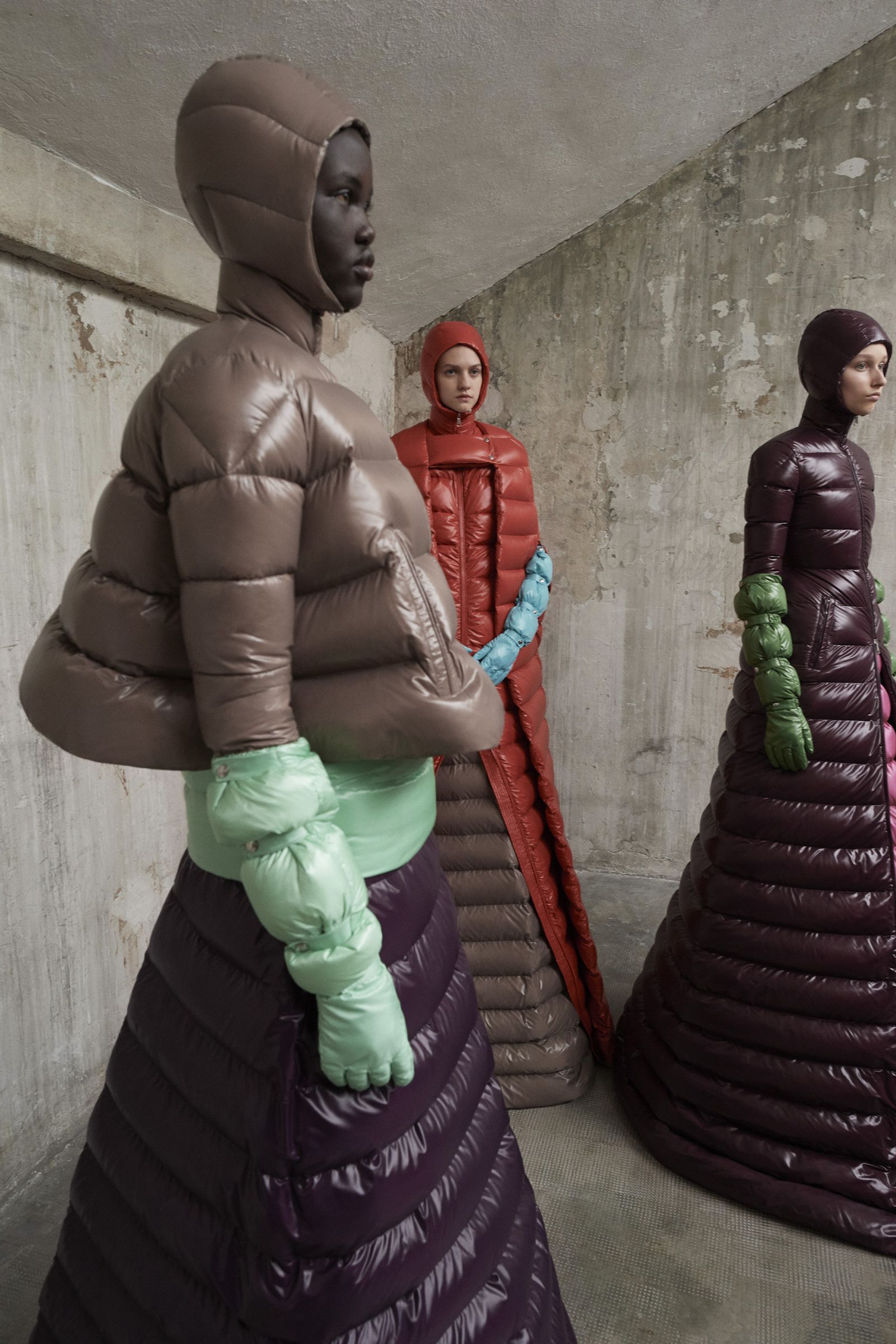 Consisting of zip-up hooded capes, both long and short, skirts, complete with padded duvet spats and padded duvet gloves. The pieces become the building blocks of high-impact graphic looks. The sum of its elements is highlighted by the contrast of saturated colors. Items come in a pictorial palette of ivory, black, amethyst, imperial yellow, bright green, orange, red and cherry red. Hues are meant to be mixed rather than matched.